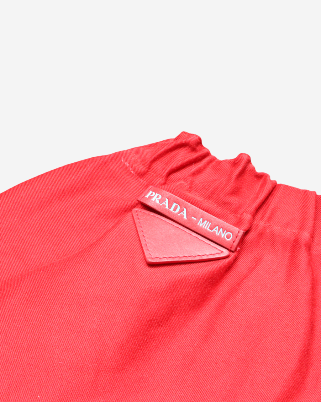 - Description: Prada skirt in red cotton, elasticated hip, A-line cut, midi length, white lining, long side straps, triangular leather back panel
