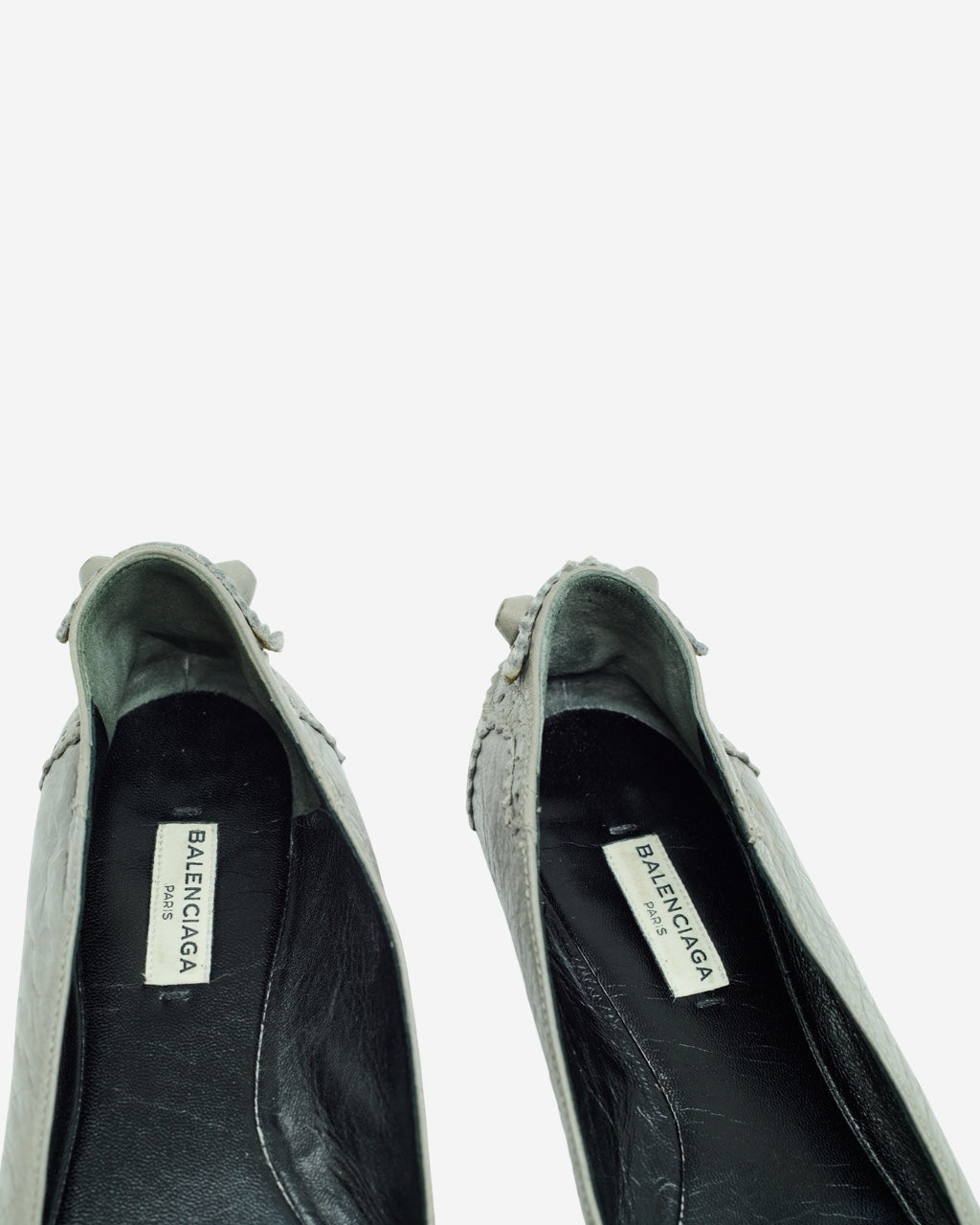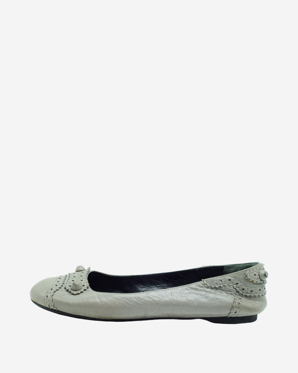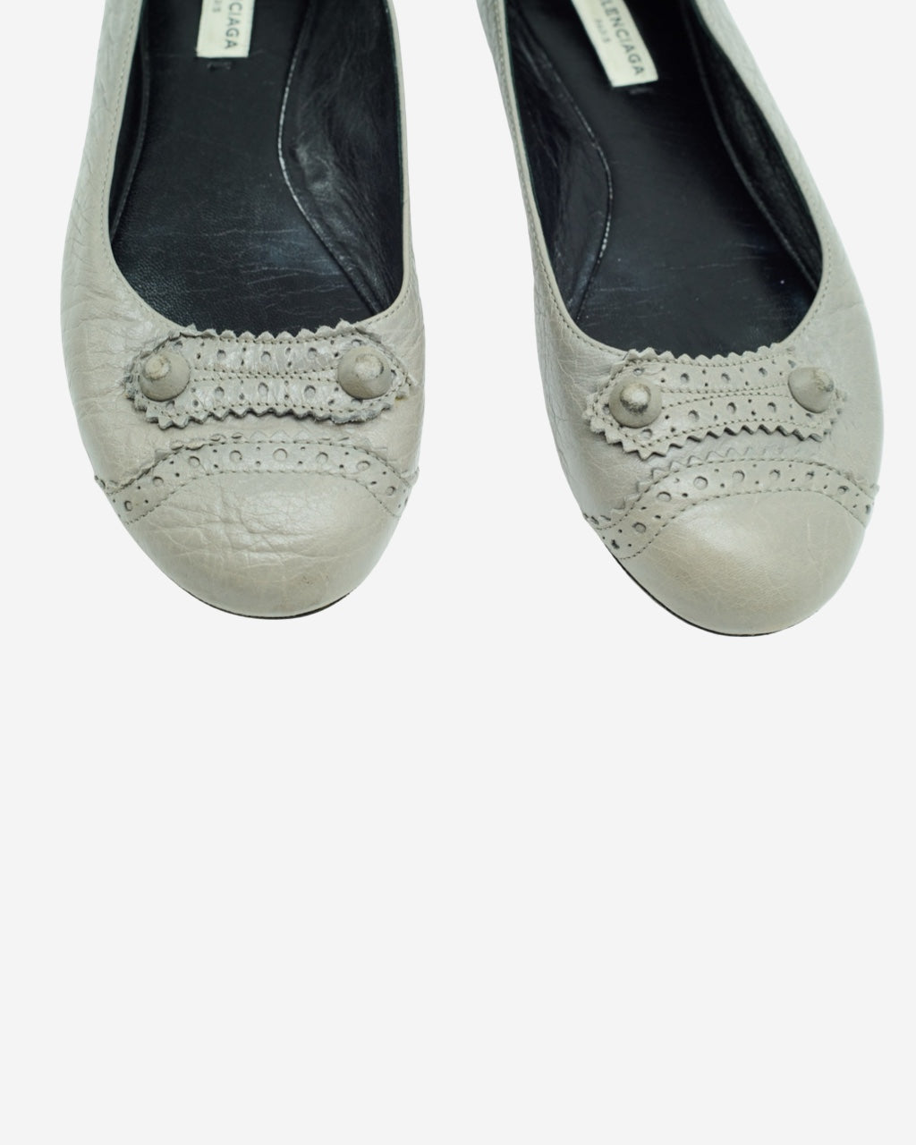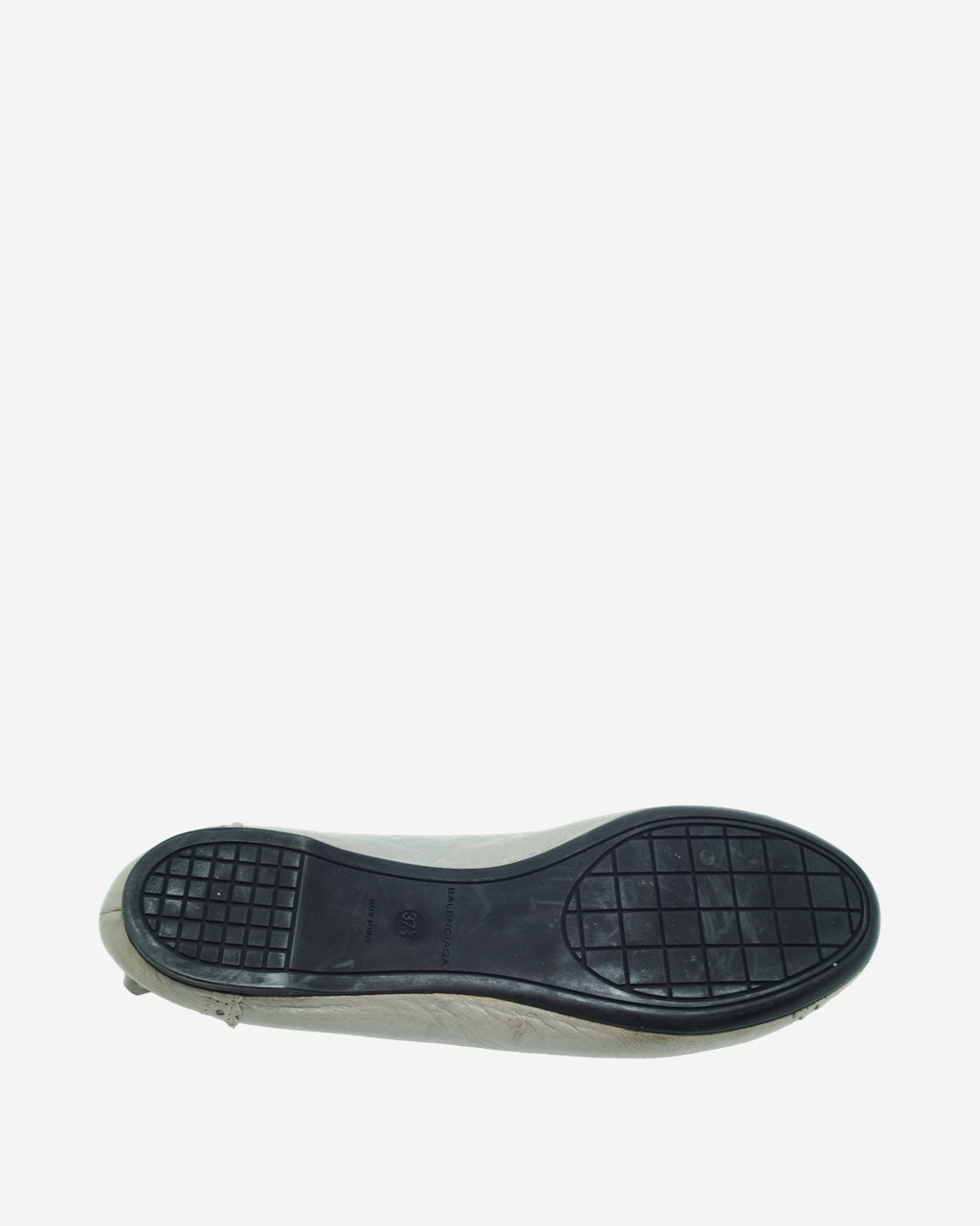 - Description: Balenciaga flats in grey leather, rounded toe, flat sole, signature stud motif