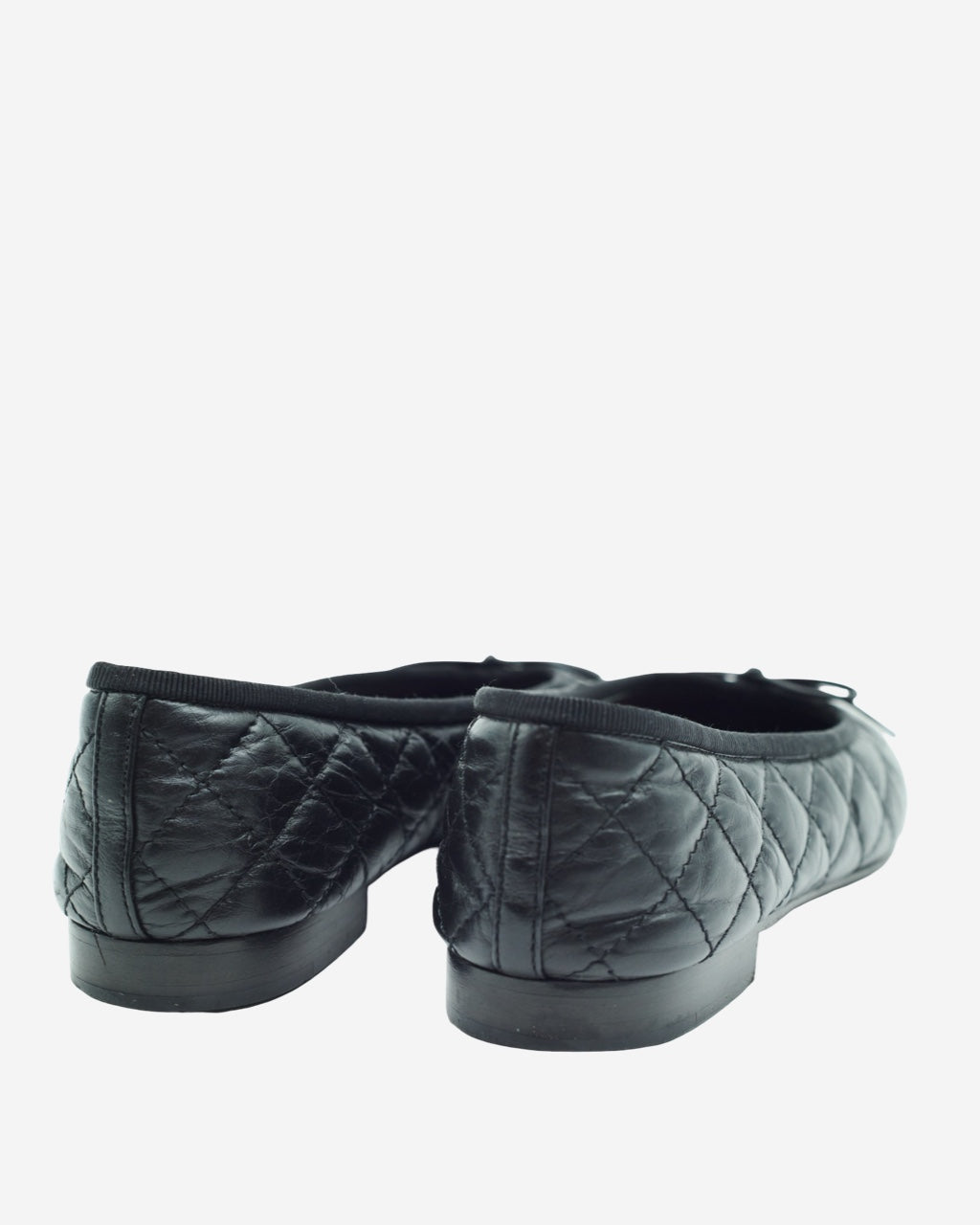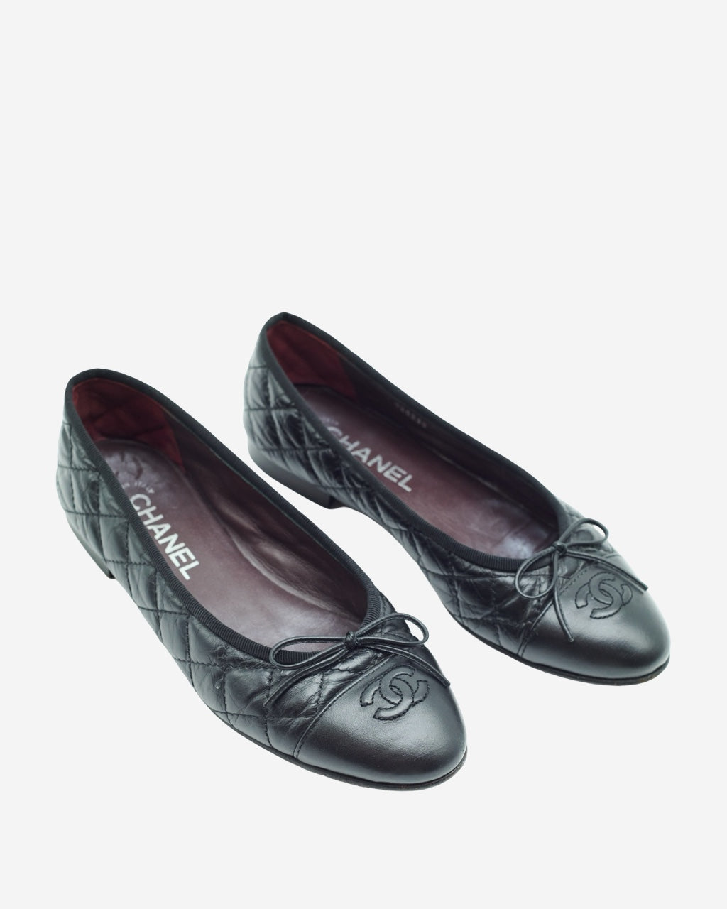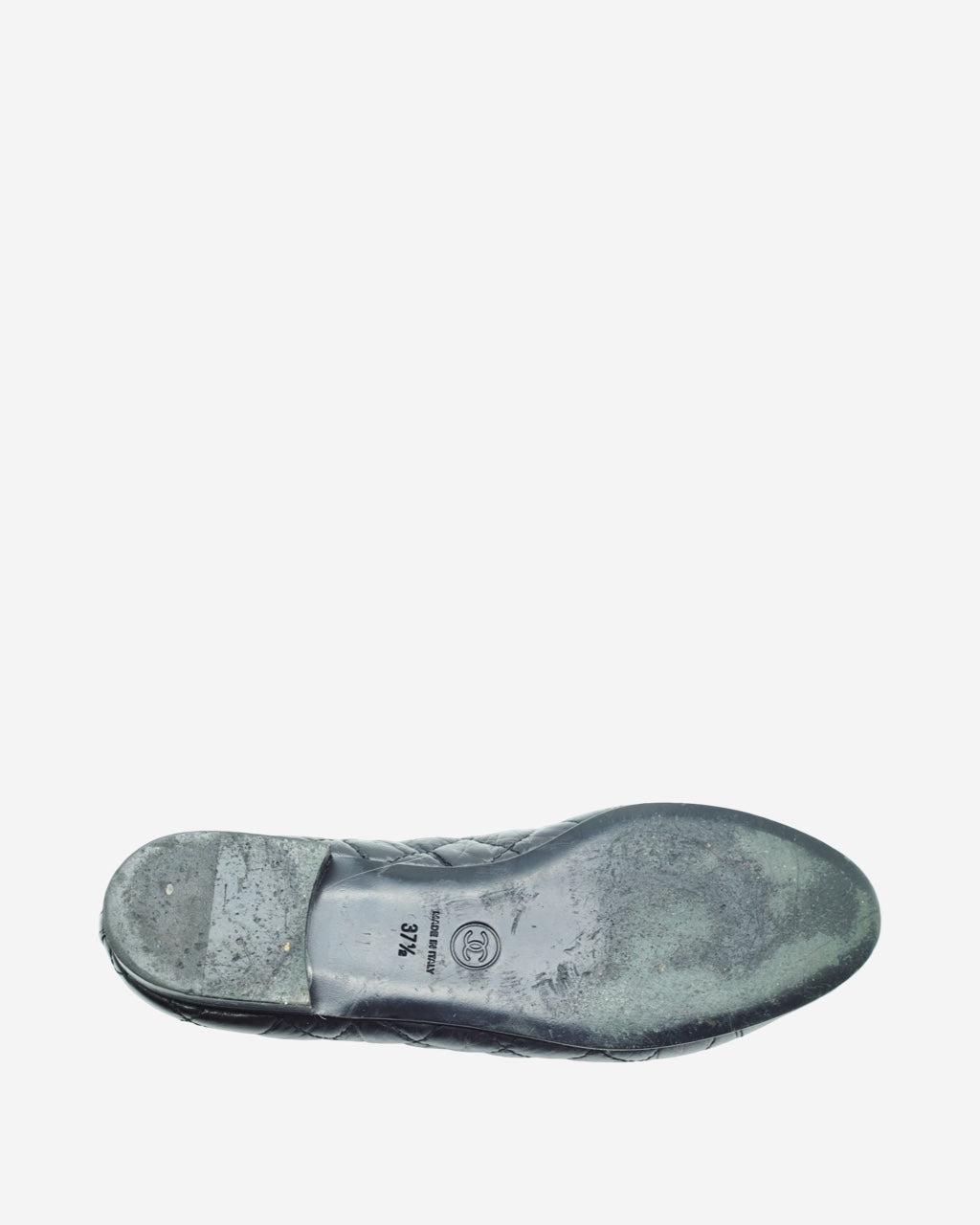 - Description: Chanel flats in black leather, oval toe, signature 'CC' logo on the front, logo engraved on the inside