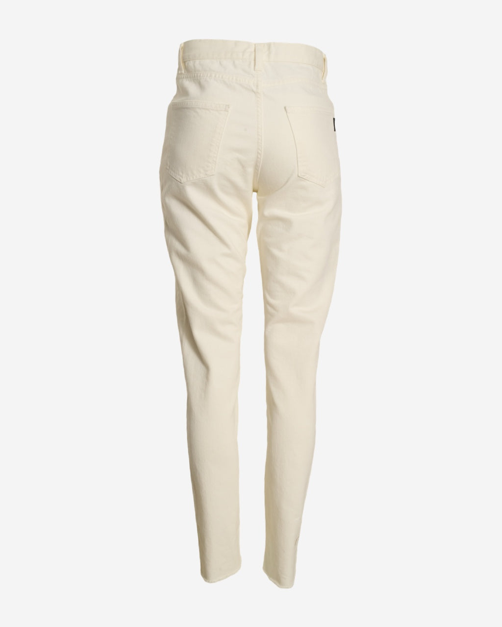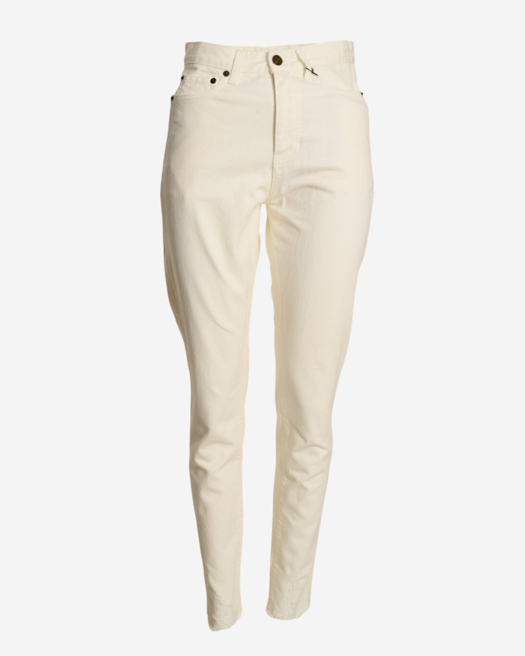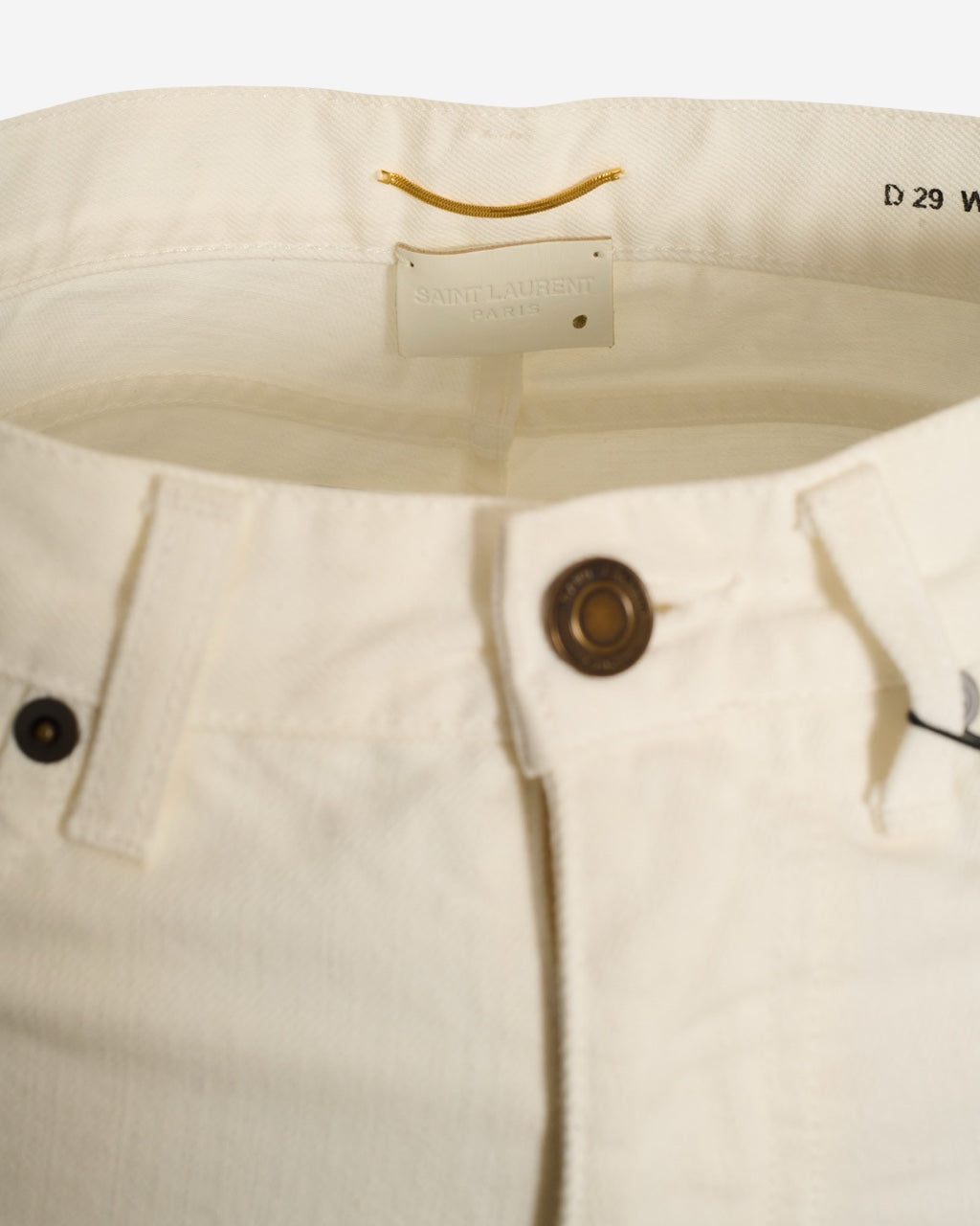 - Description: Saint Laurent jeans in white, hip-hugging with button and two-way front closure, slim fit, distressed motif at the bottom, aged-effect hardware