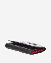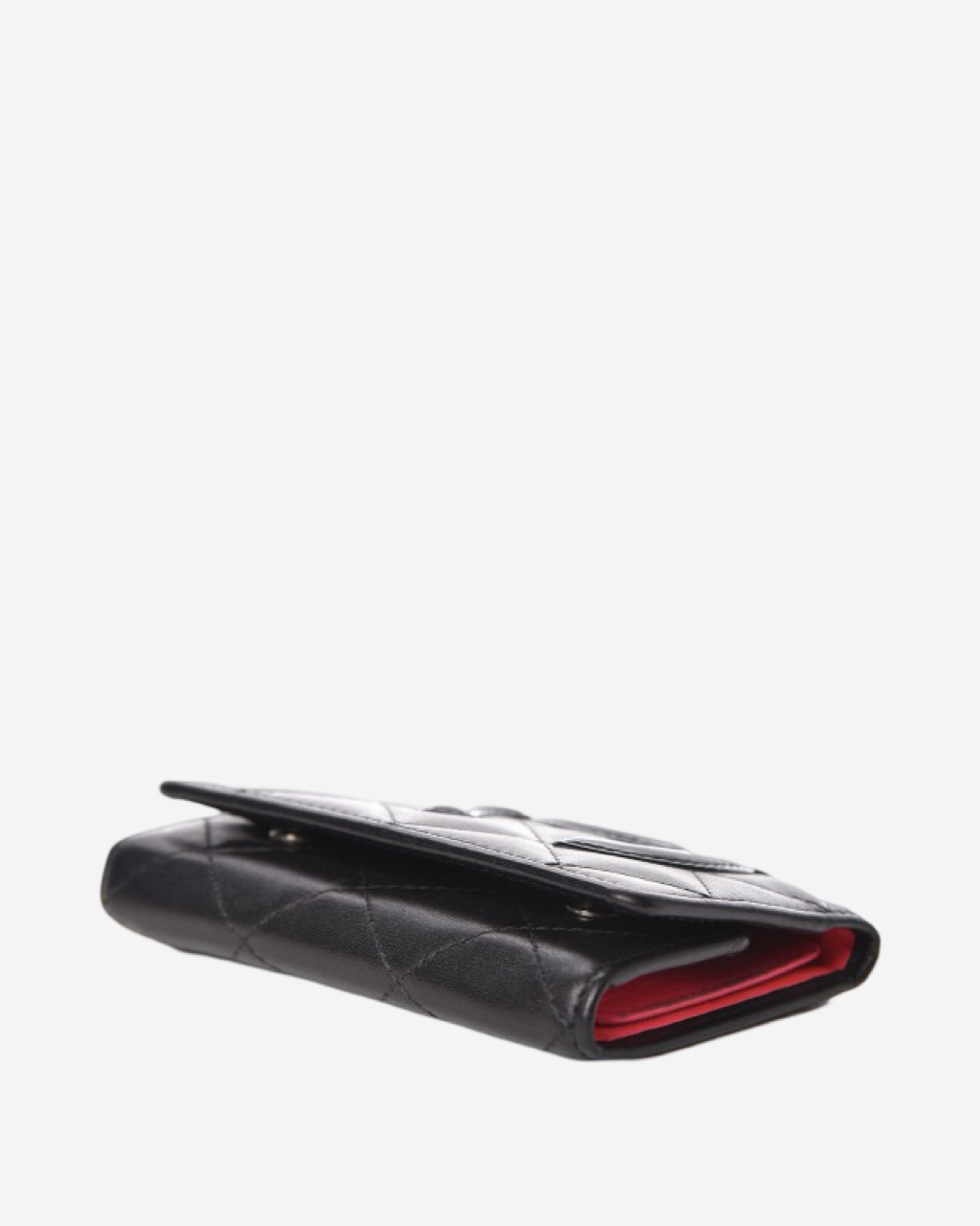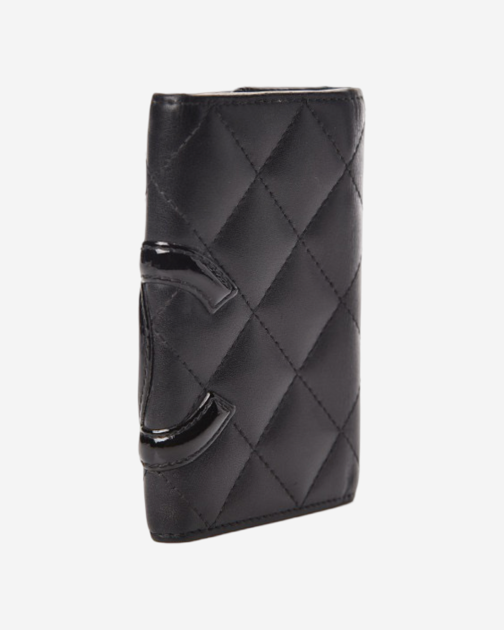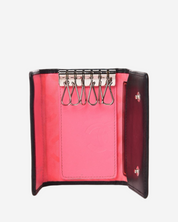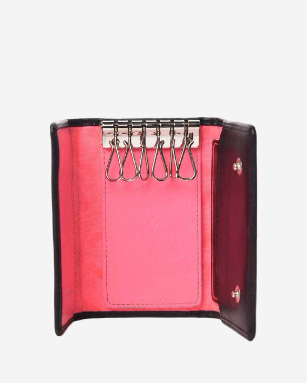 - Description: Black leather keyholder with patent CC, pink textile lining, silver hardware