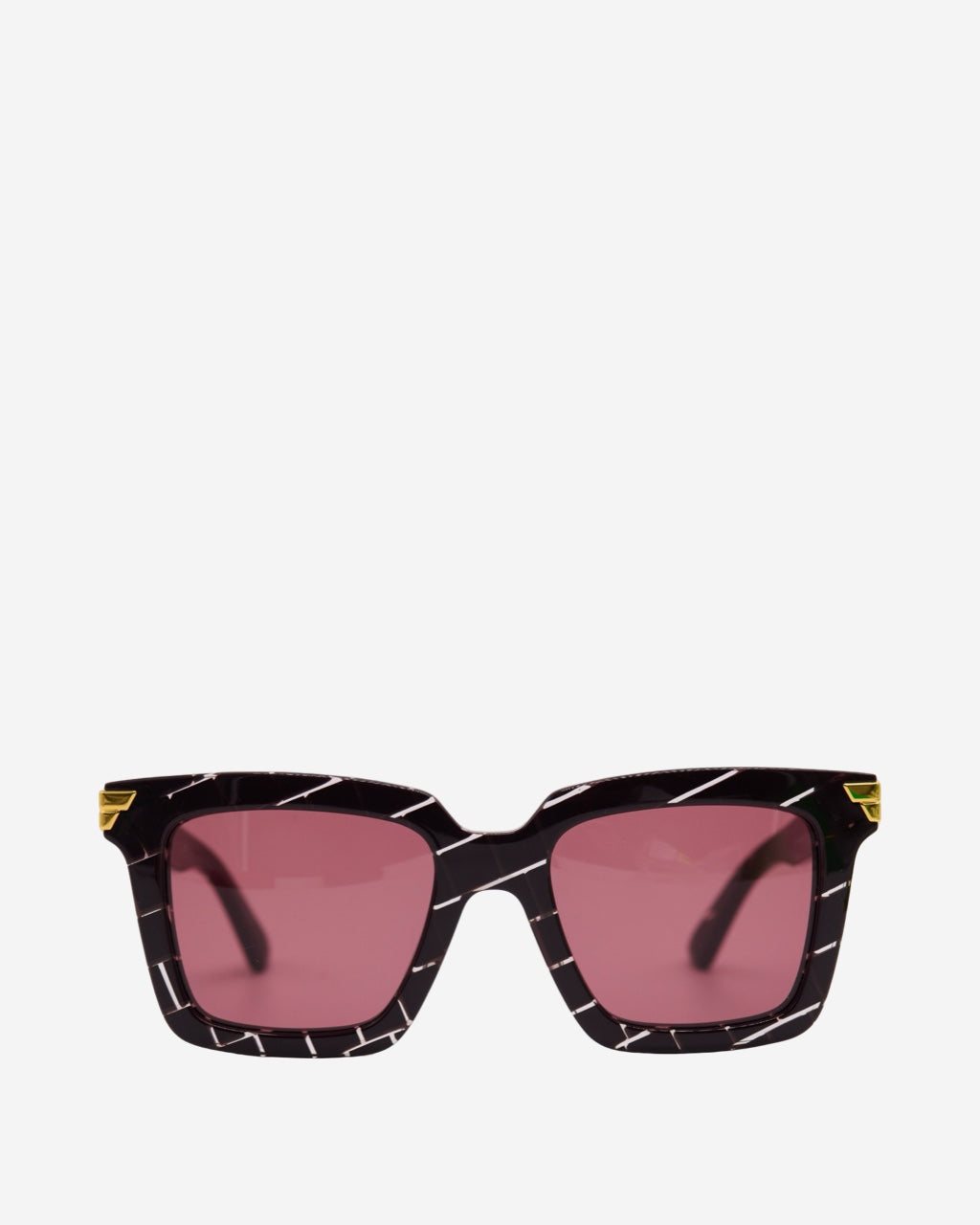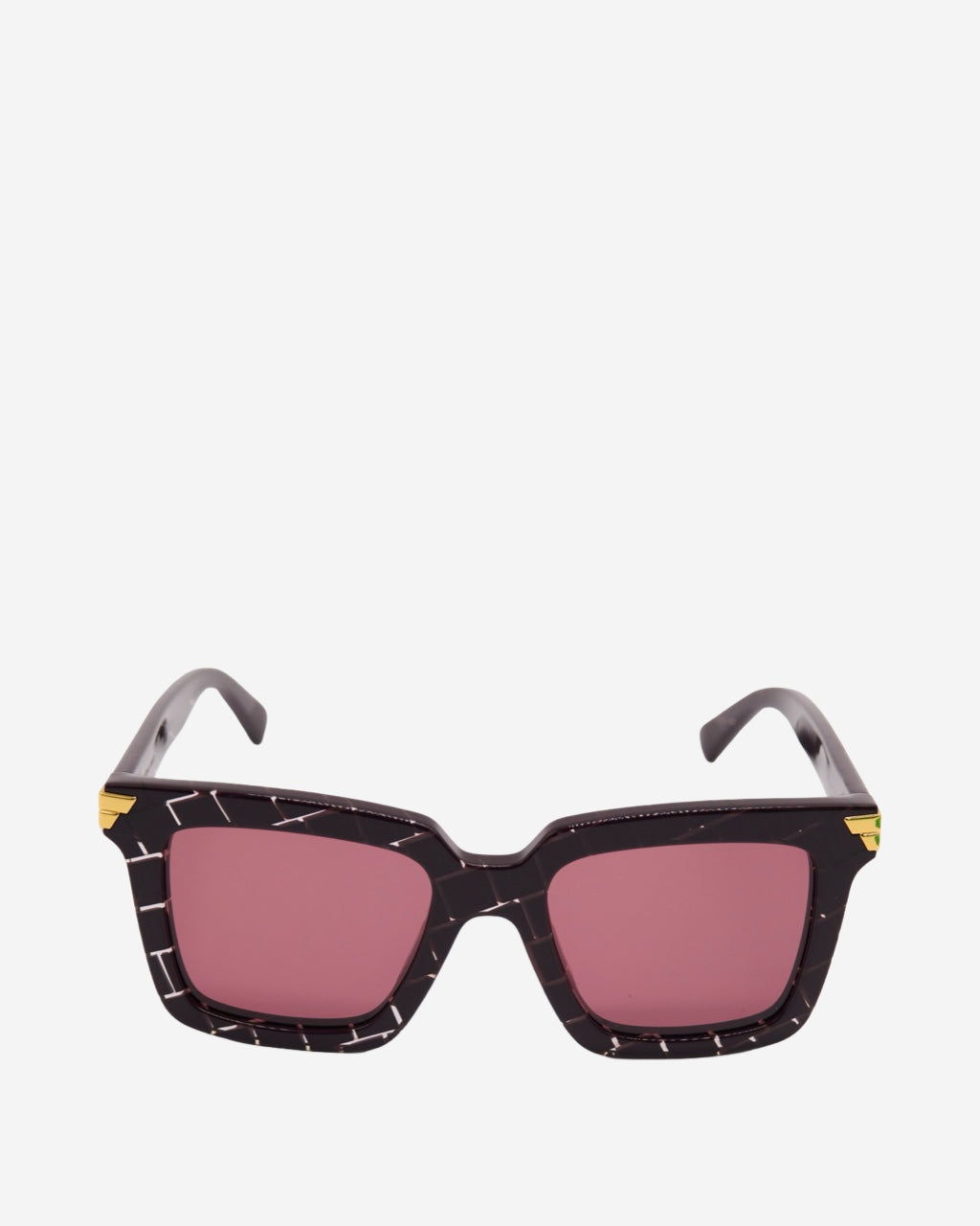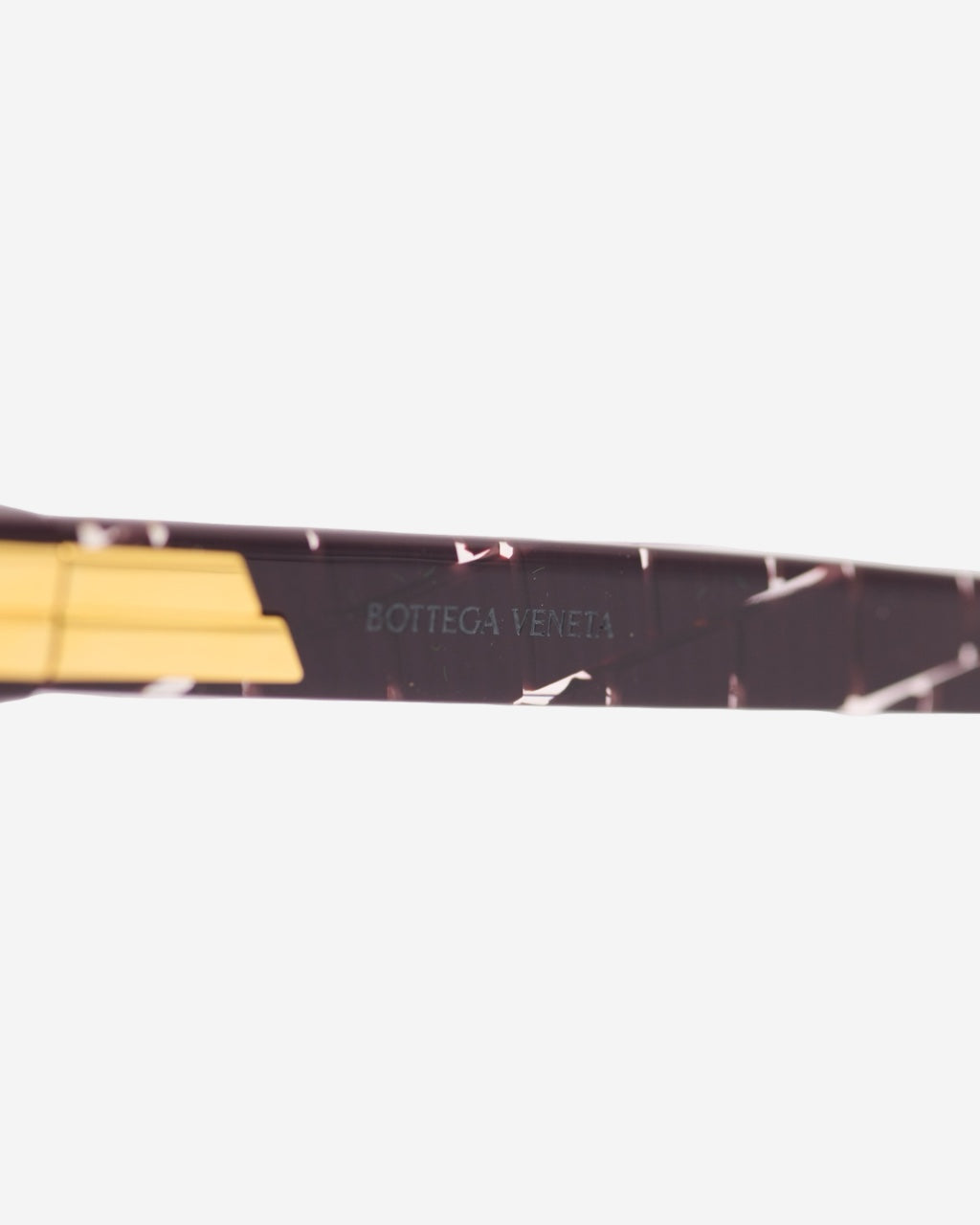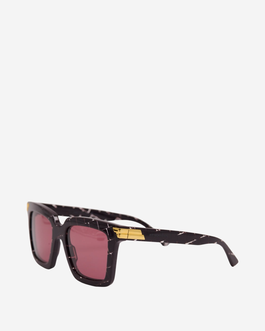 - Description: Bottega Veneta sunglasses in purple acetate, rectangular shape, transparent line pattern, metal plate on the sides, characteristic interior engraving, gold-tone hardware