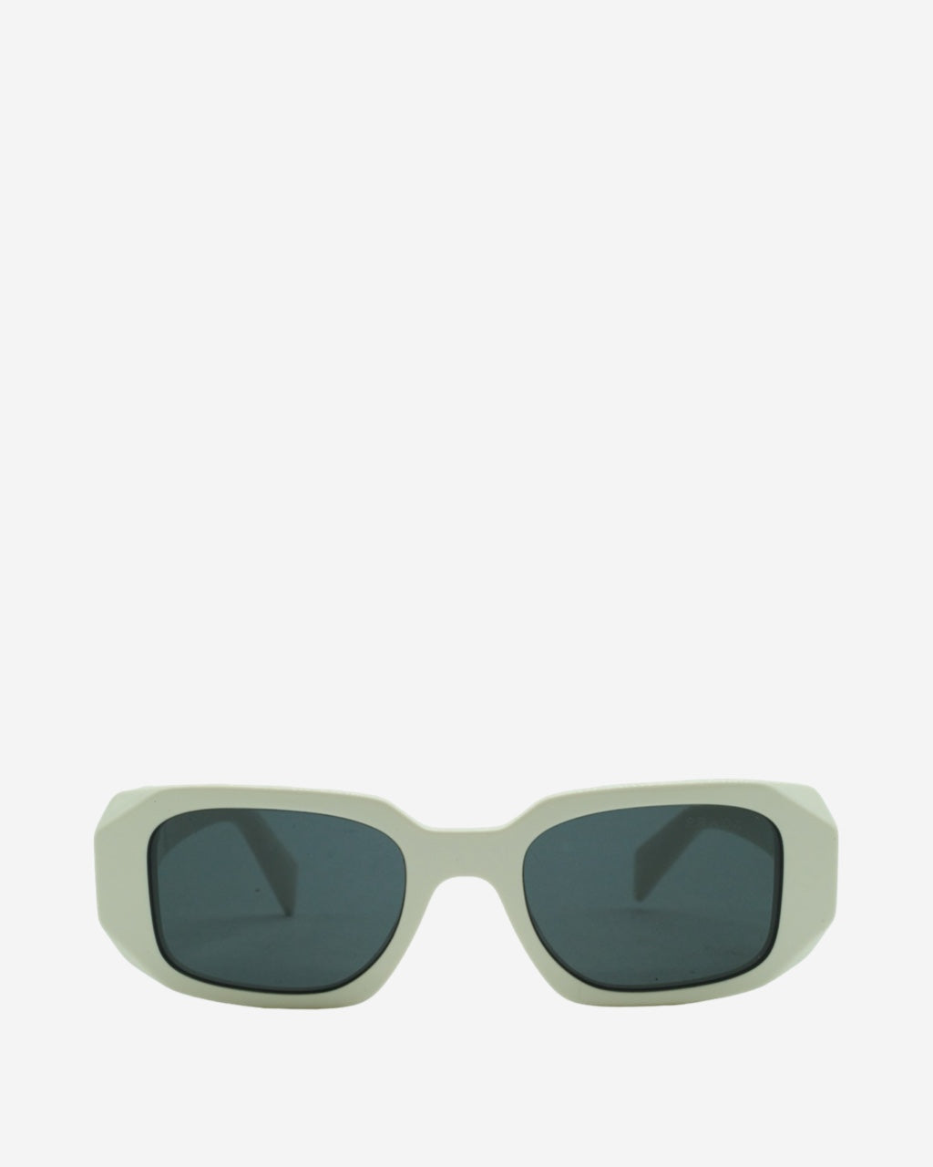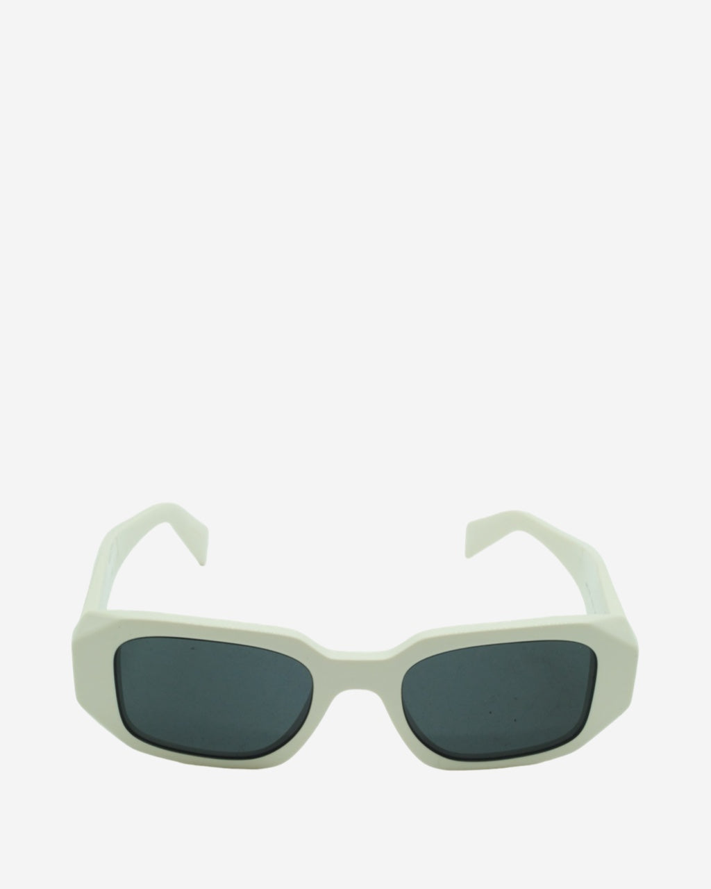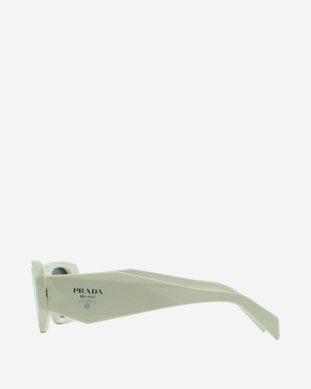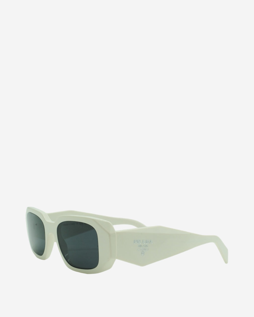 - Description: Prada sunglasses in white acetate, rectangular shape, engraved logo on the sides, silver-tone hardware