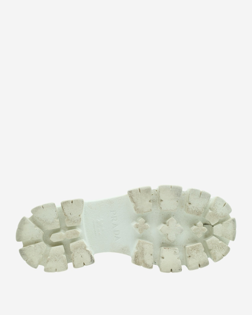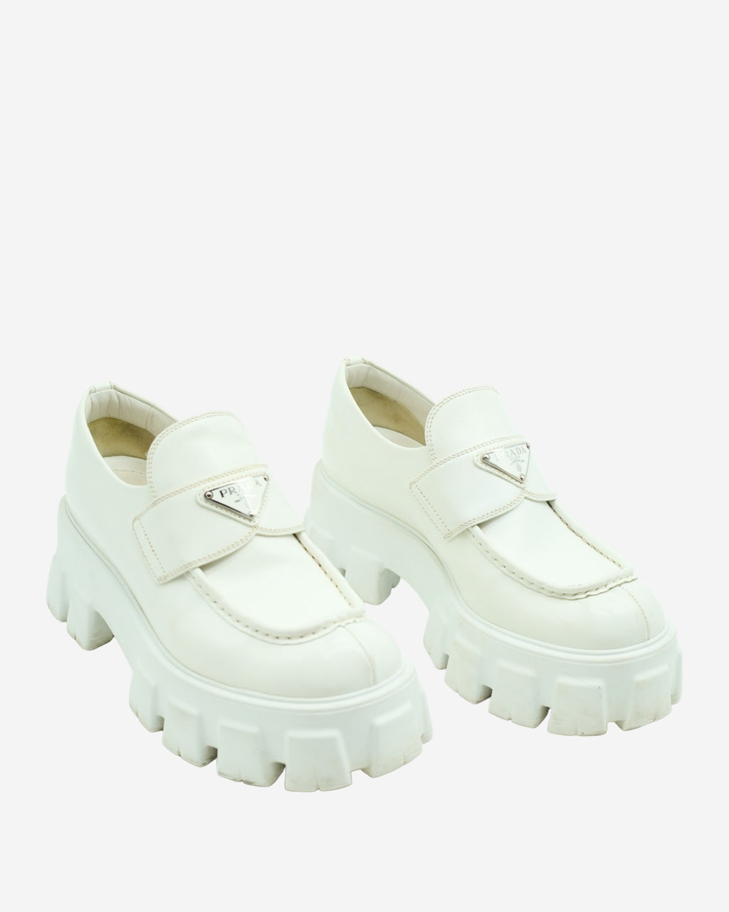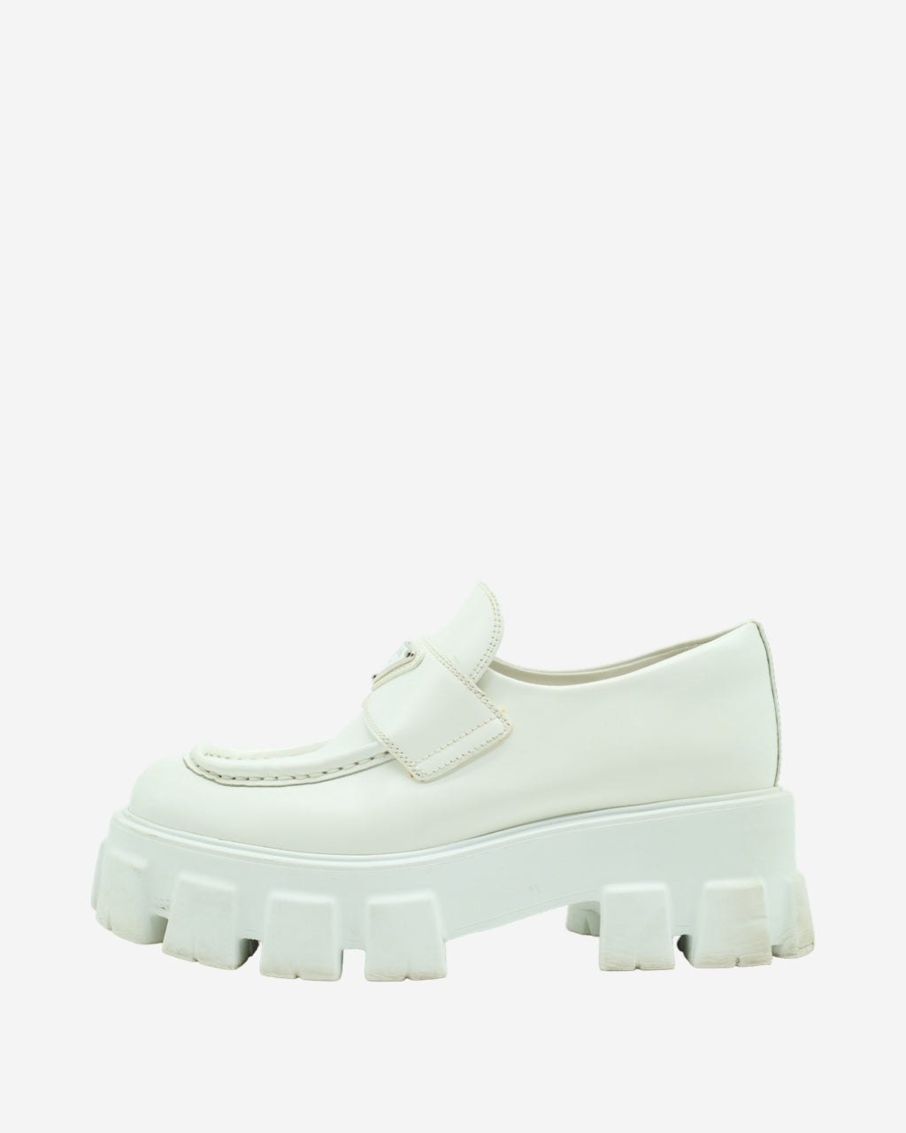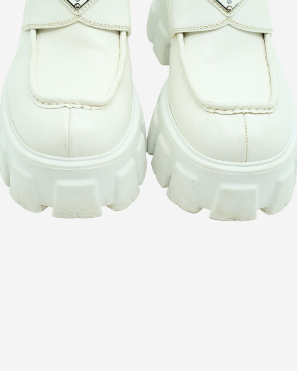 - Description: Prada loafers in white leather, rounded toe, triangular front plate, slip-on style, oversized sole, silver-colored hardware