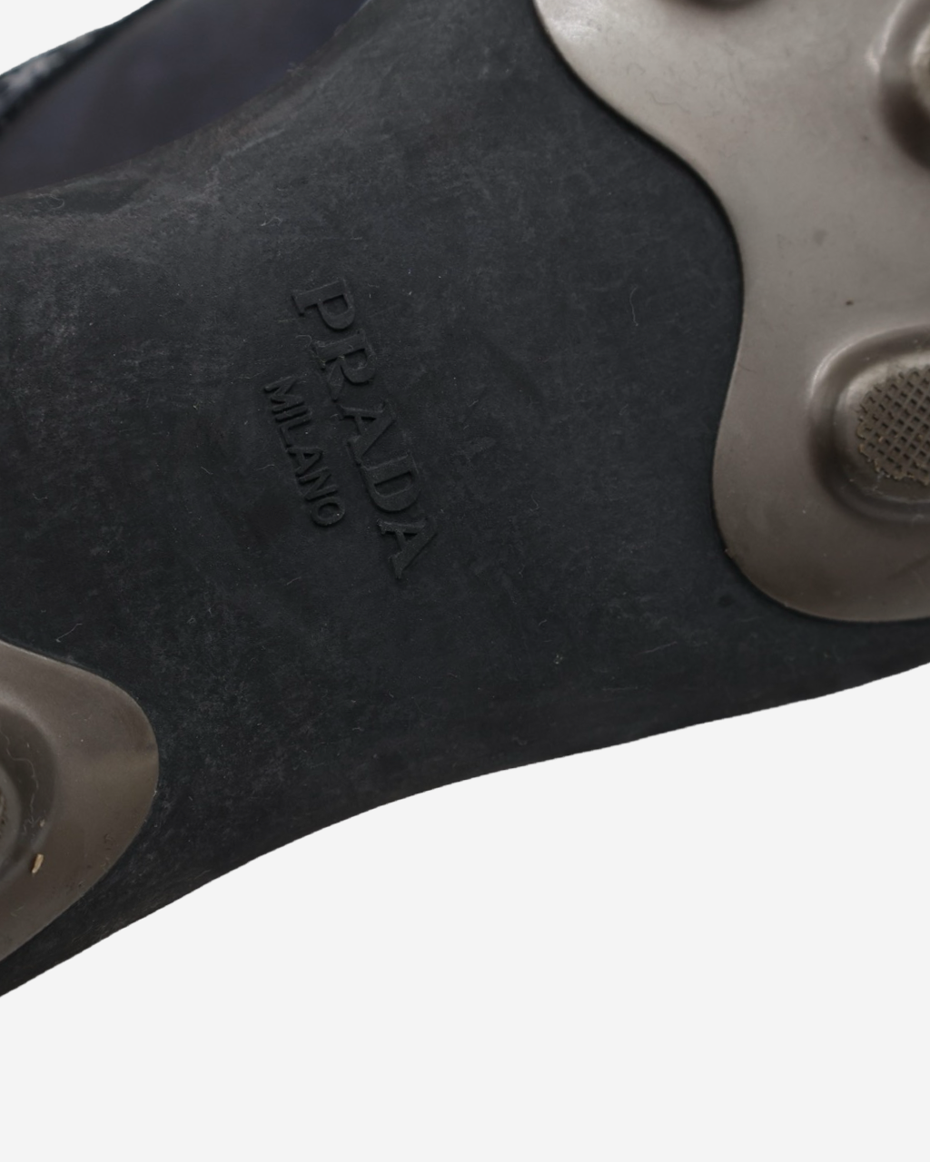 - Description: Black leather oxfords with blue panels, almond toe, lace-up closure, grey foam sole, logo on the insole