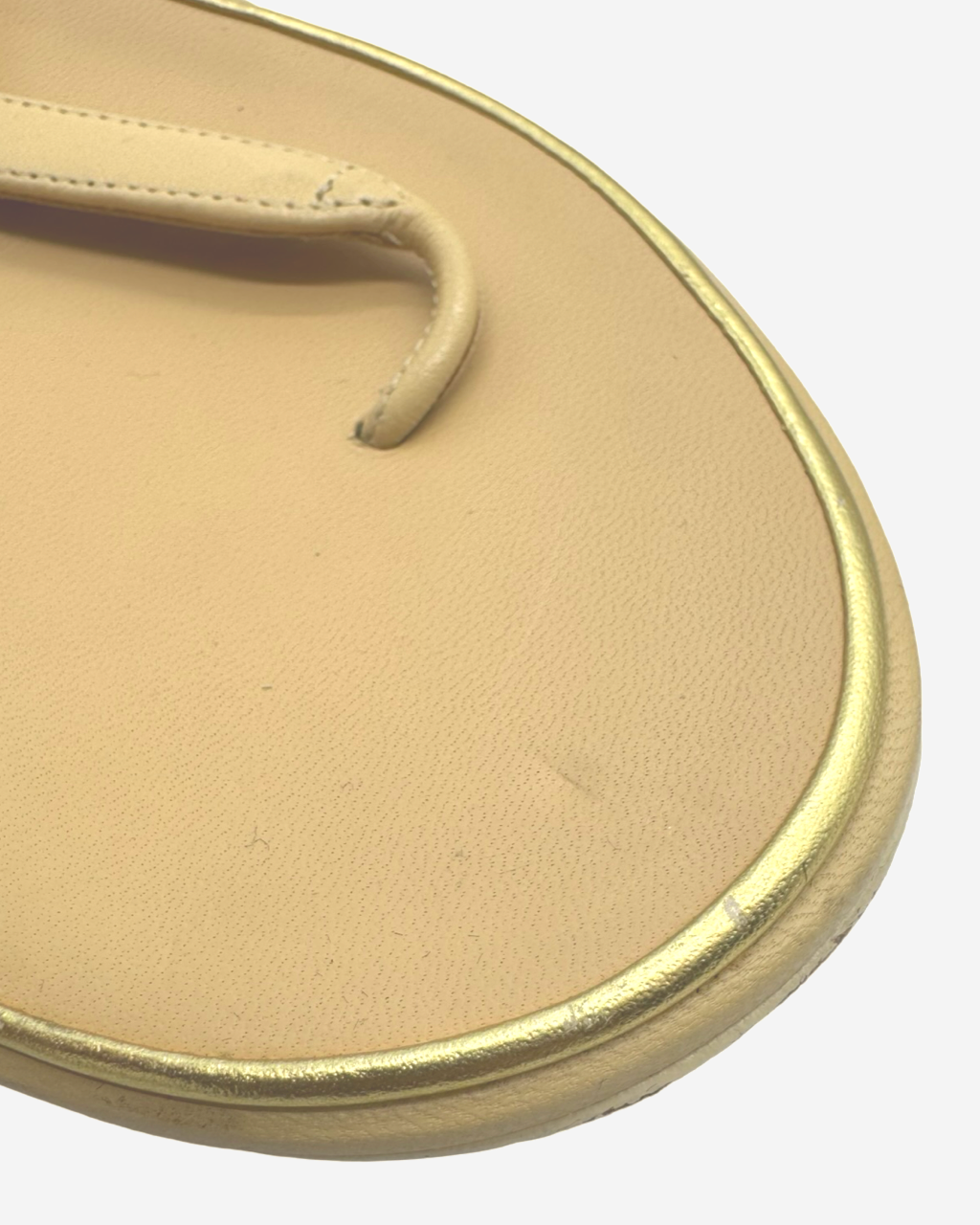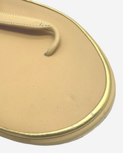 - Description: Flat gold-tone leather sandals, front CC logo, ankle adjustment
