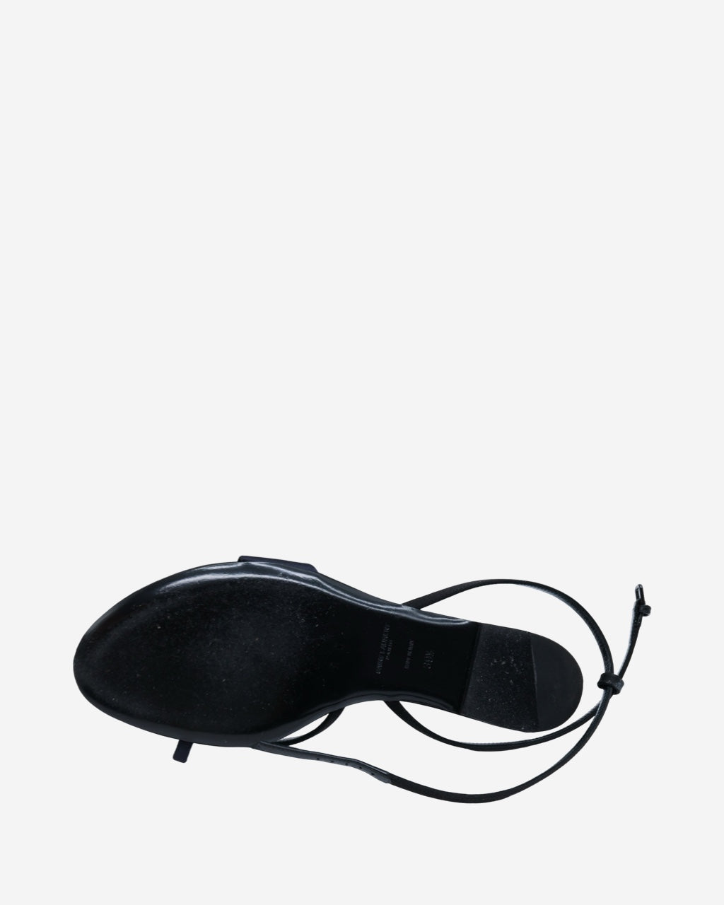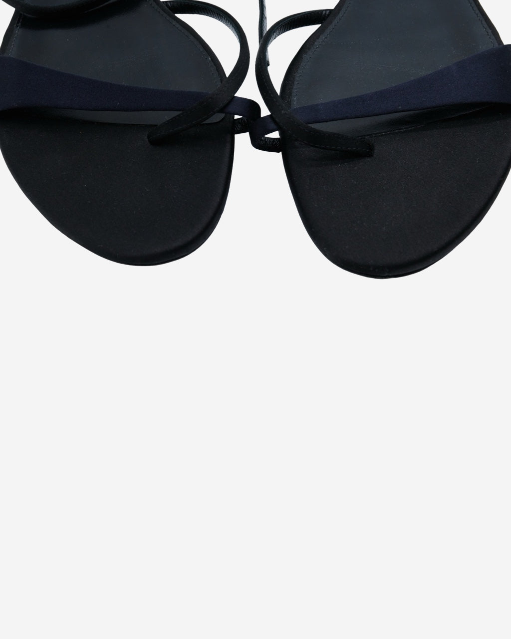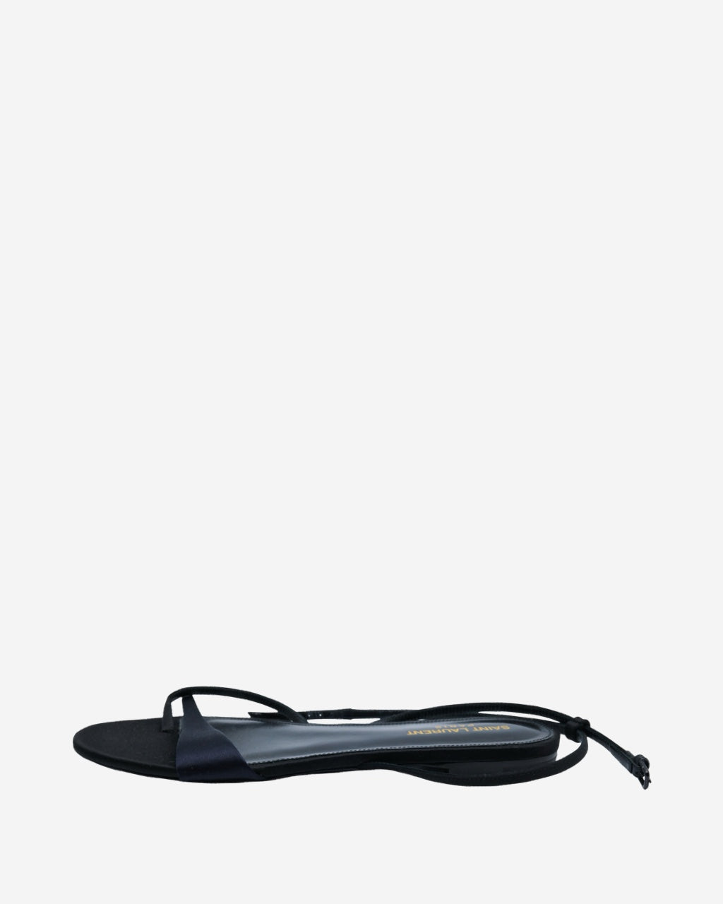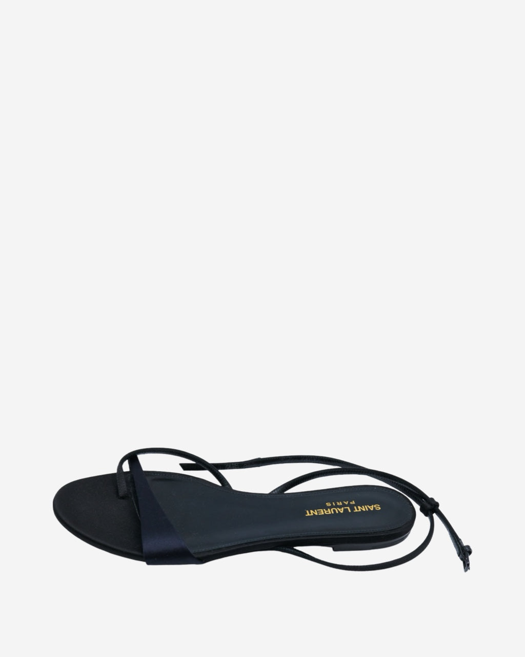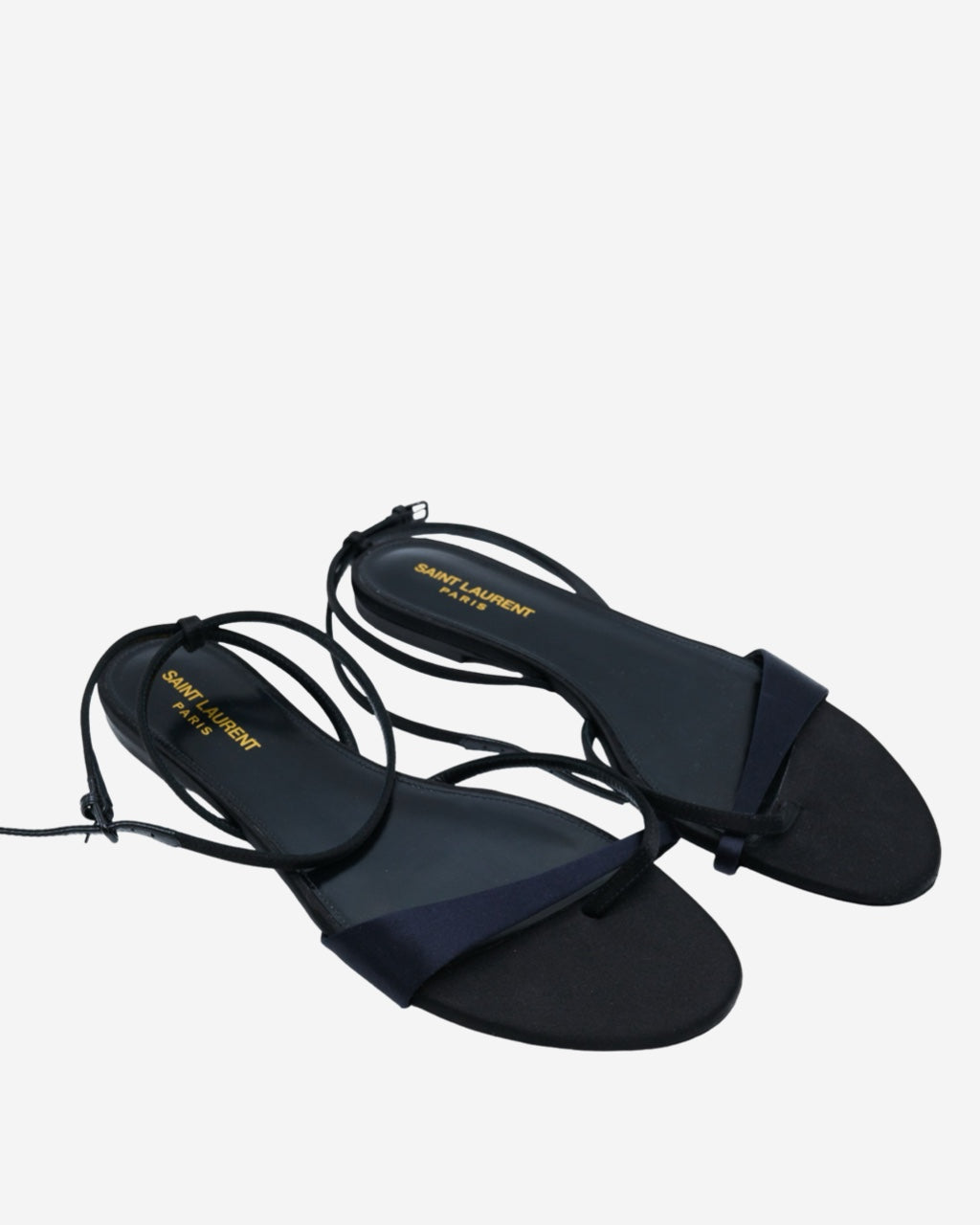 - Description: Saint Laurent sandals in bluish-black satin, rounded toe, flat sole, ankle strap and metal buckle, logo embossed on the insole