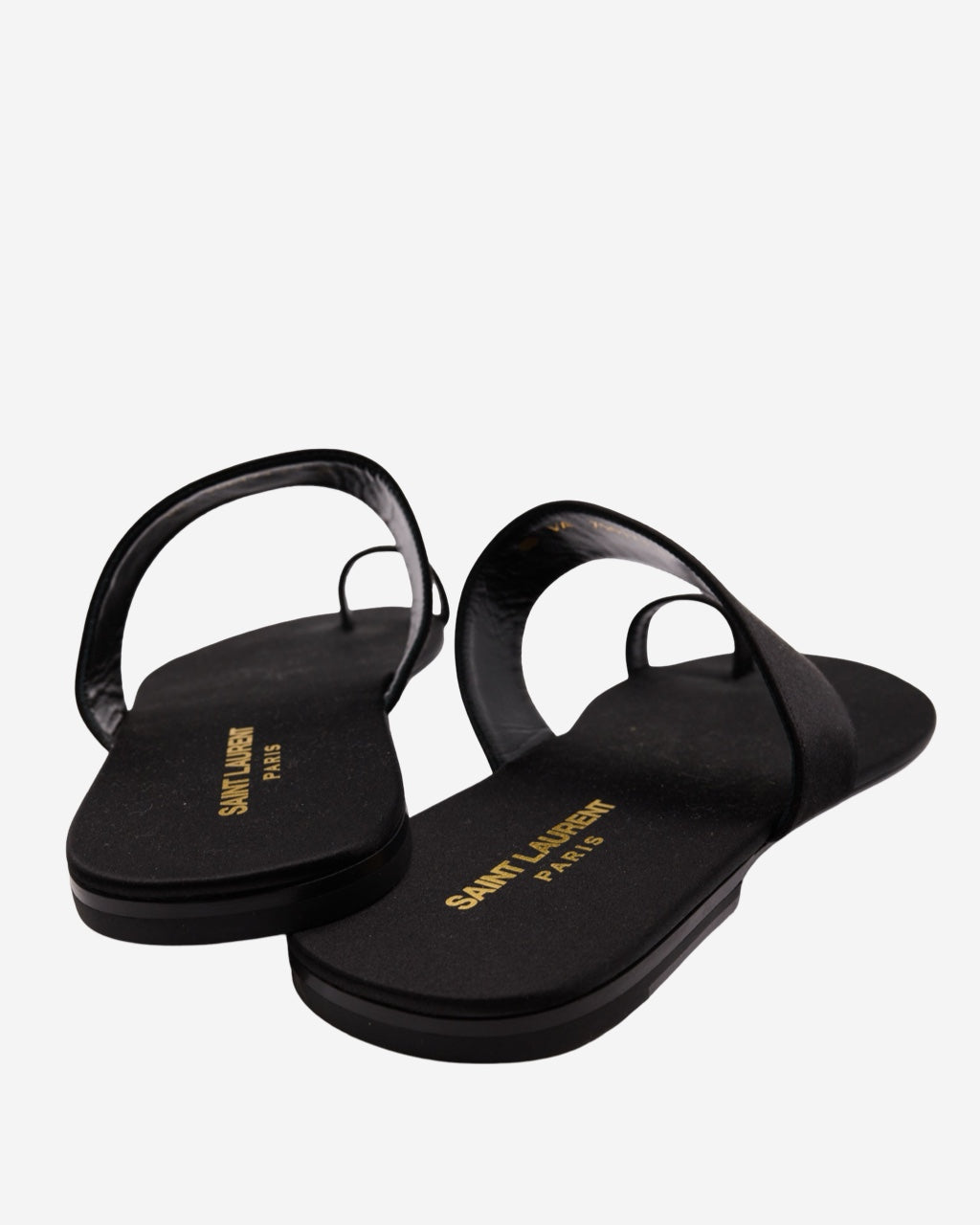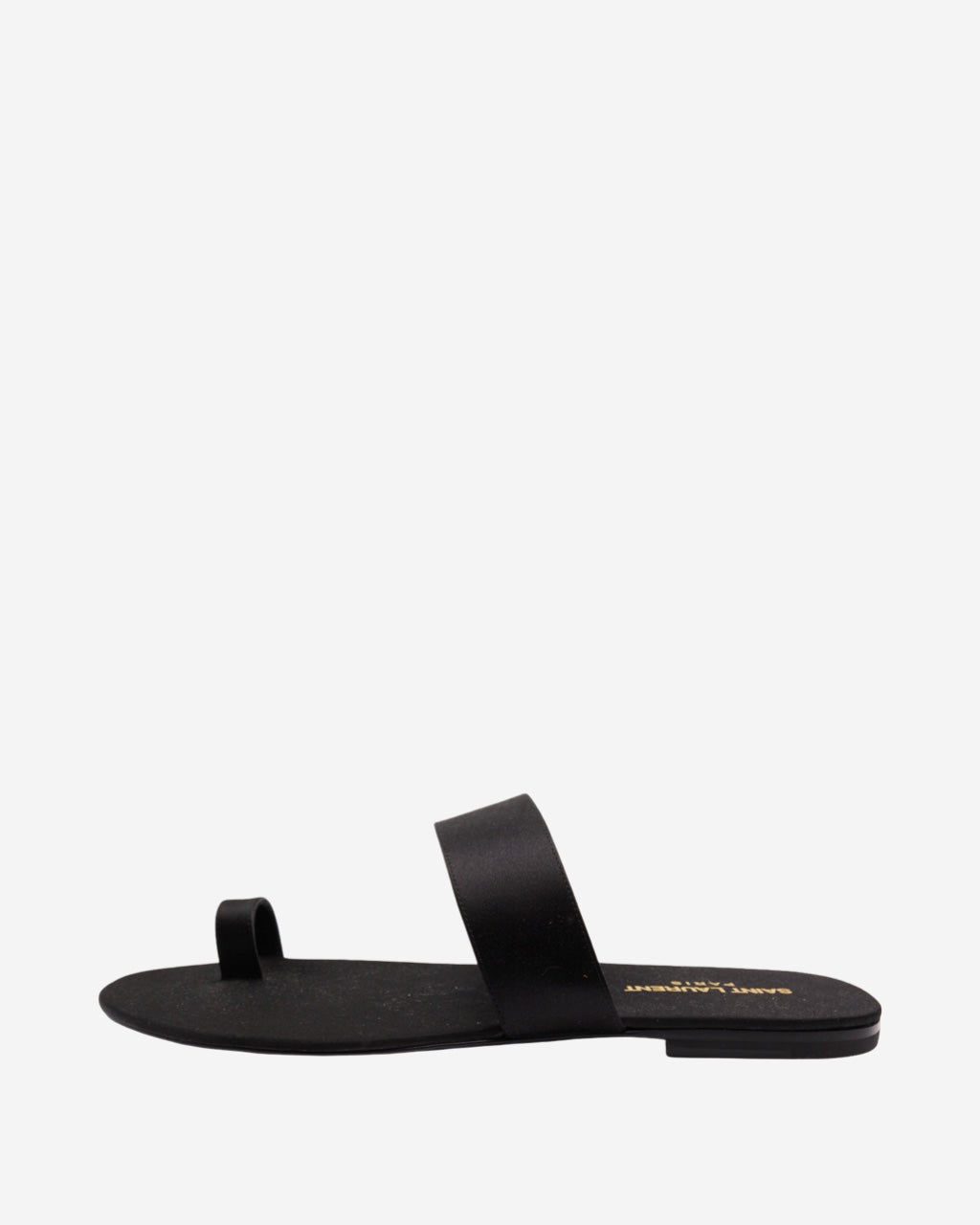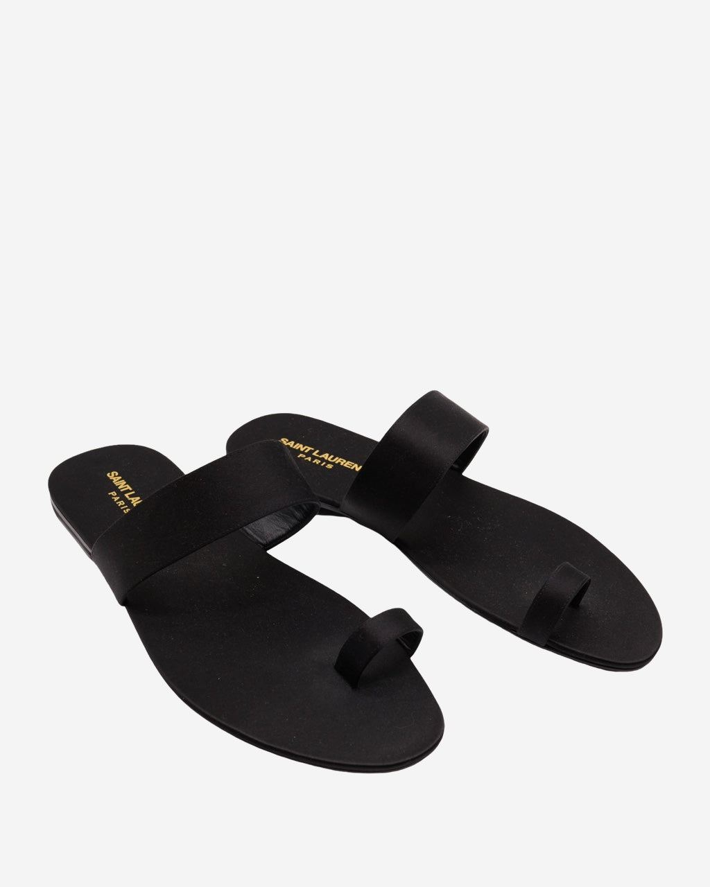 - Description: Saint Laurent sandals in black satin, rounded toe, logo embossed on the insole, flat sole, adjustable with a central strap