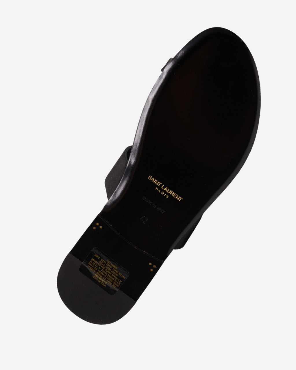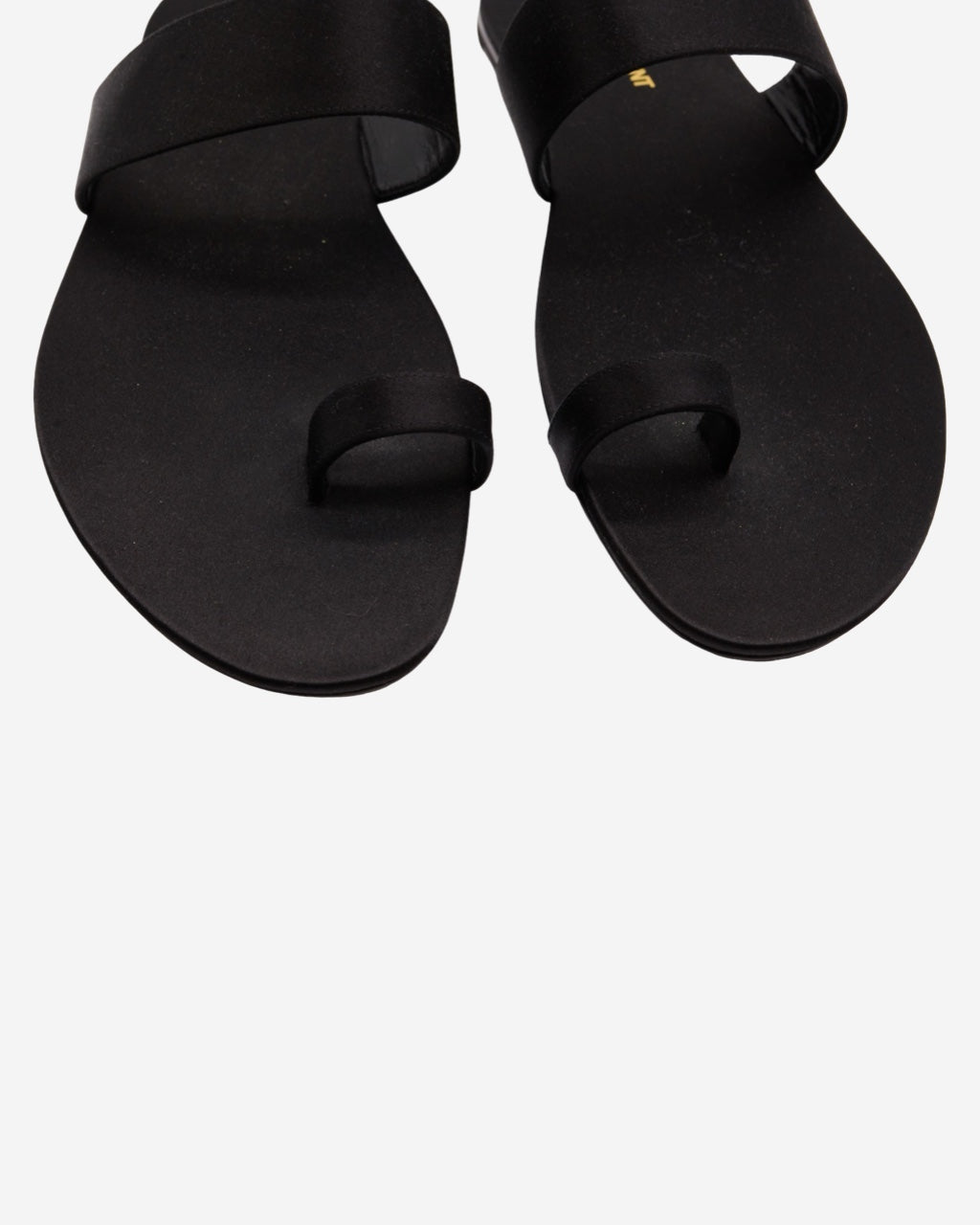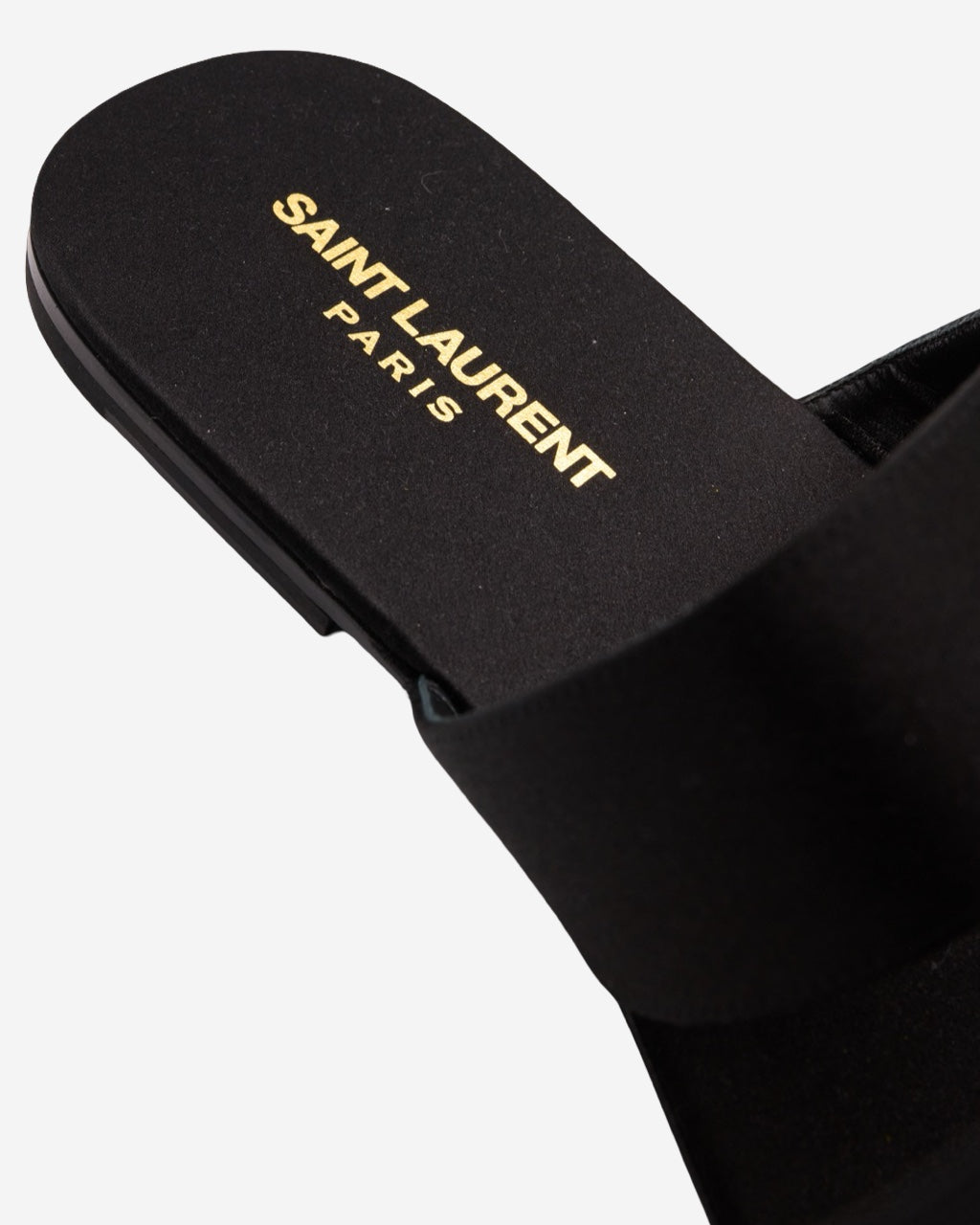 - Description: Saint Laurent sandals in black satin, rounded toe, logo embossed on the insole, flat sole, adjustable with a central strap