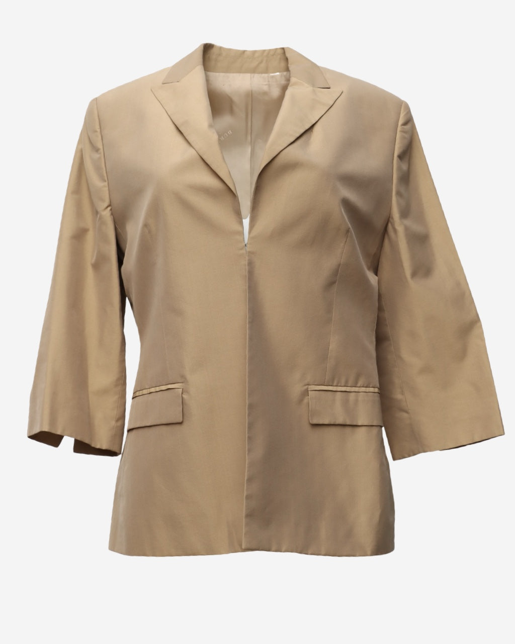 - Description: Burberry suit set in beige, blazer with peak lapel, button-front closure, long sleeves, satin lining, straight-leg trousers with button-front closure