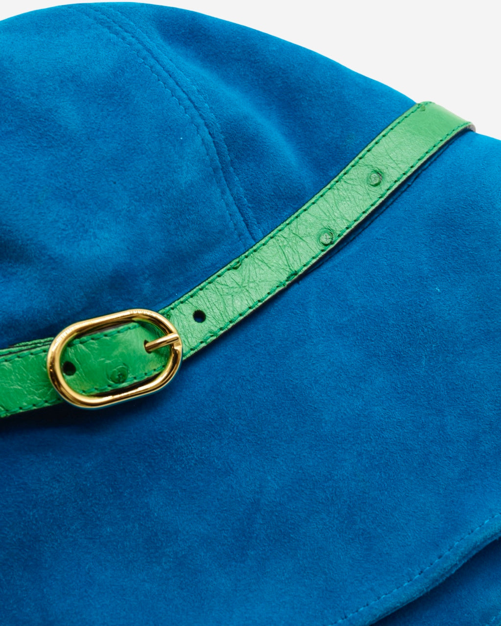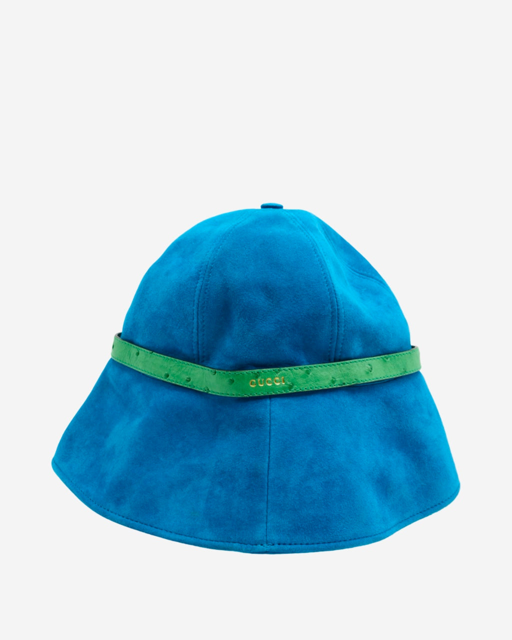 - Description: Gucci hat in blue suede, green croc-effect leather belt with buckle in front, beige textile lining, logo on the back