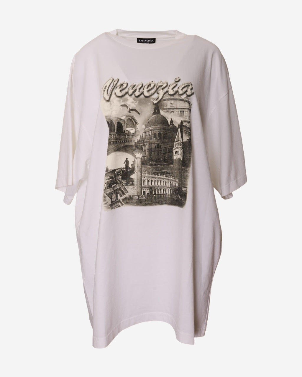 - Description: Balenciaga T-shirt in white cotton, front print of Venezia in black, round neck, short sleeves, oversized cut