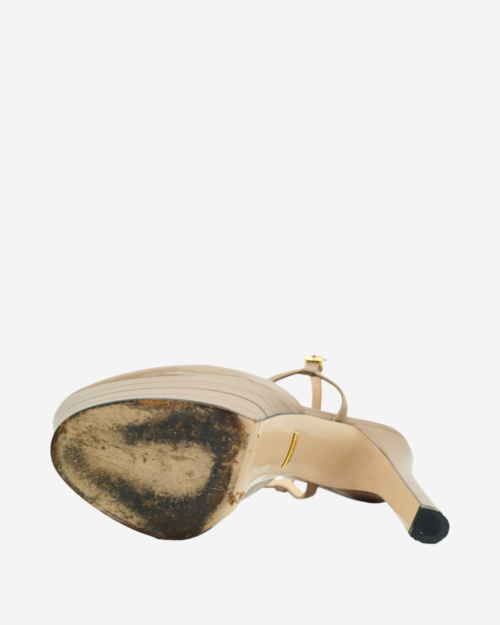 - Description: Gucci heels in beige leather, almond toe, high platform, ankle strap adjustment, slim heel, gold-tone hardware