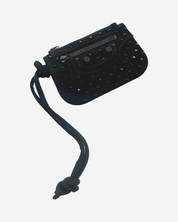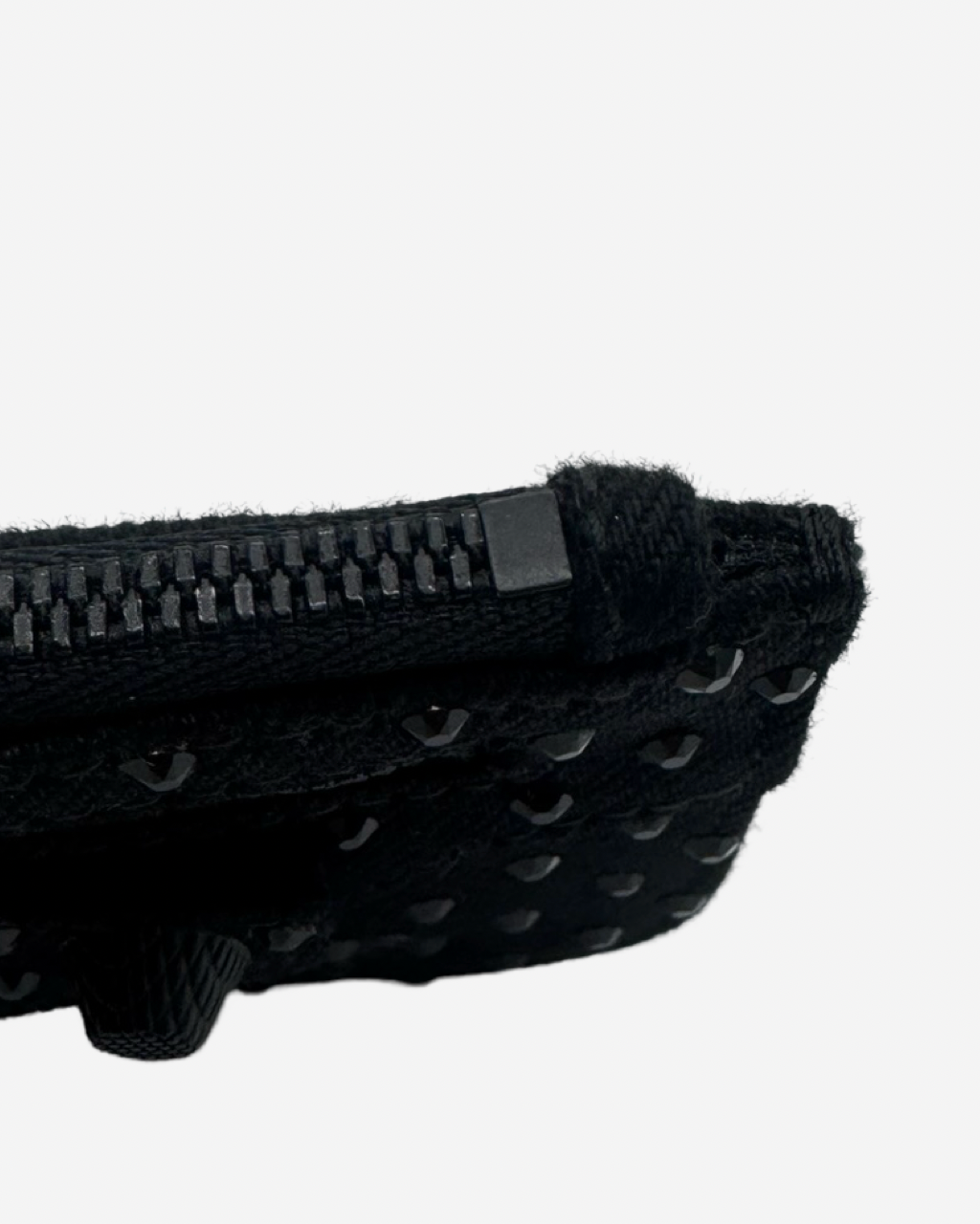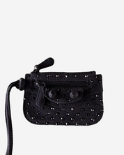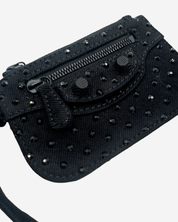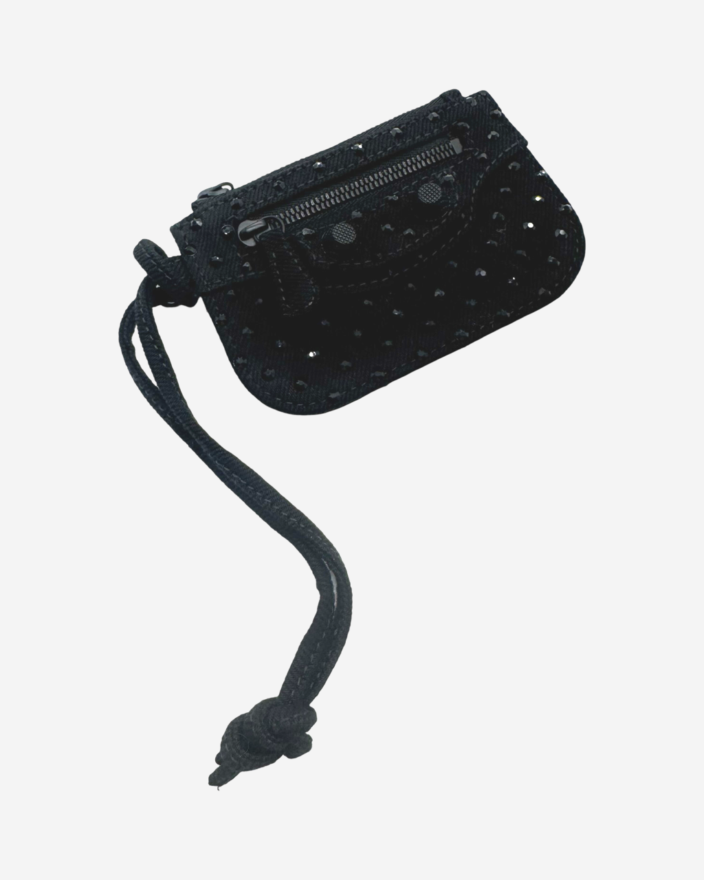 - Description: Black cotton card holder with rhinestones, top closure, characteristic studs, textile inner lining