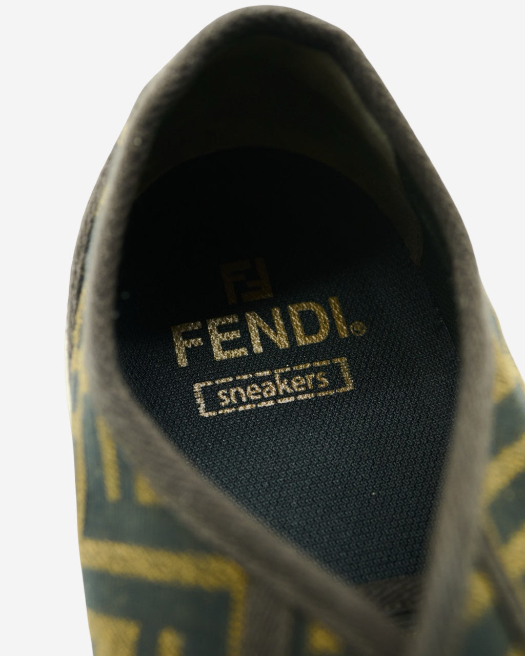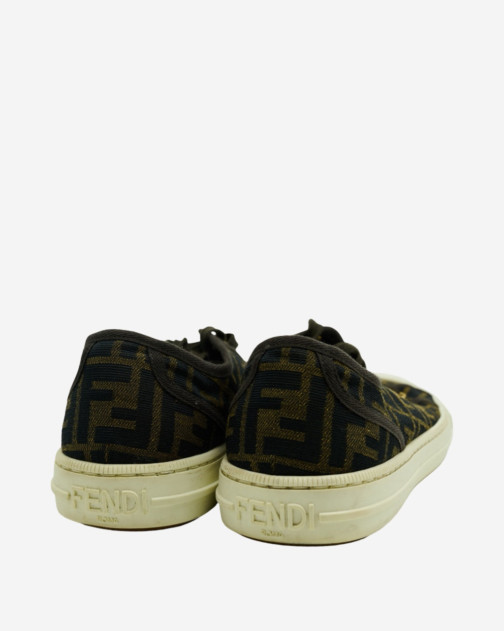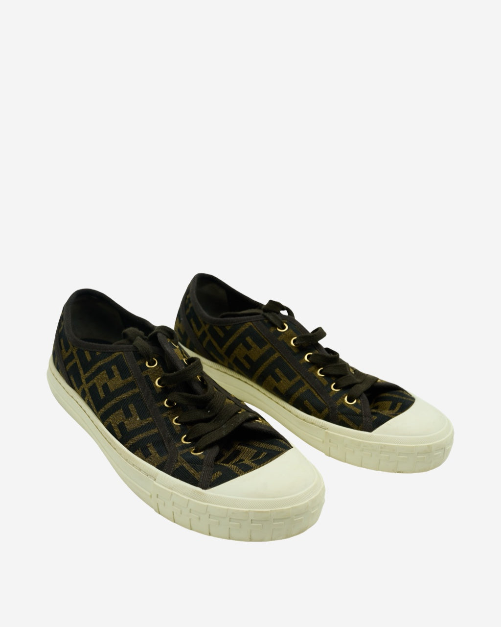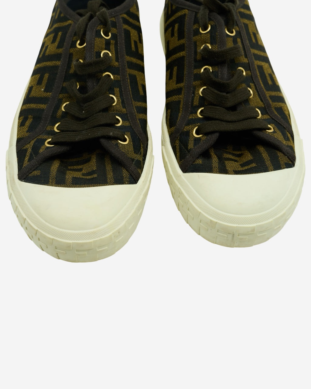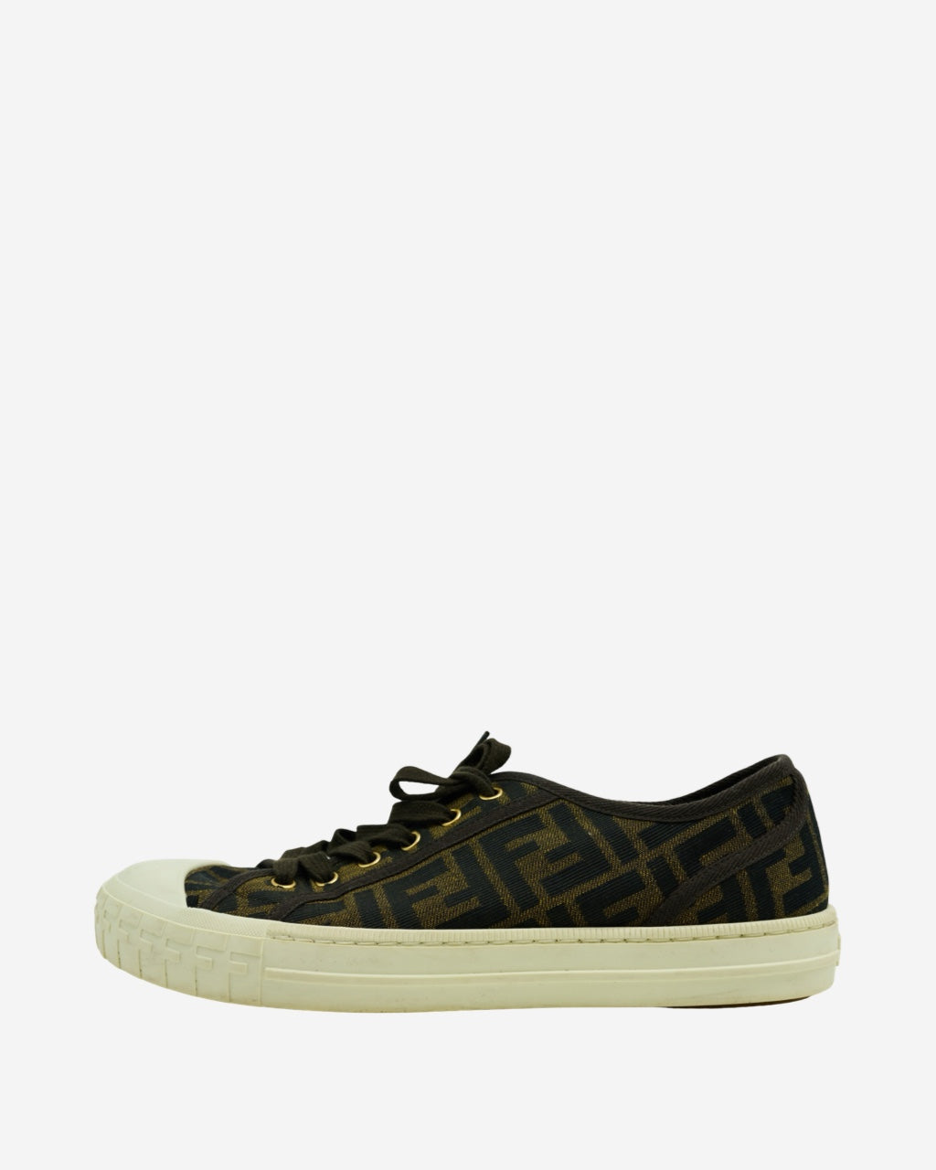 - Description: Fendi Zucca sneakers in brown Zucca canvas, rounded toe, lace-up closure, rubber sole, logo on the back, gold-tone hardware