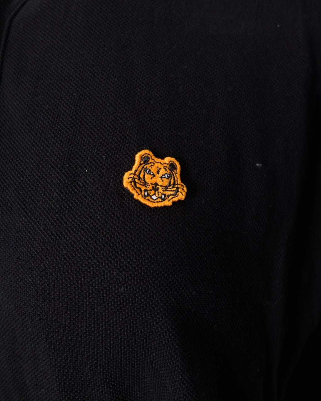 - Description: Kenzo polo dress in black, Italian lapel, short sleeves, mini length, belted waist, silver-tone hardware