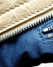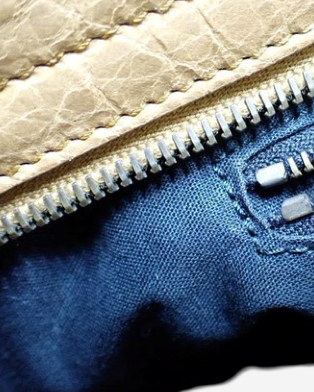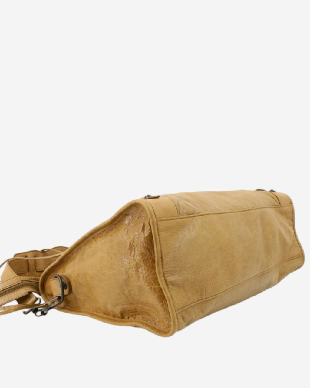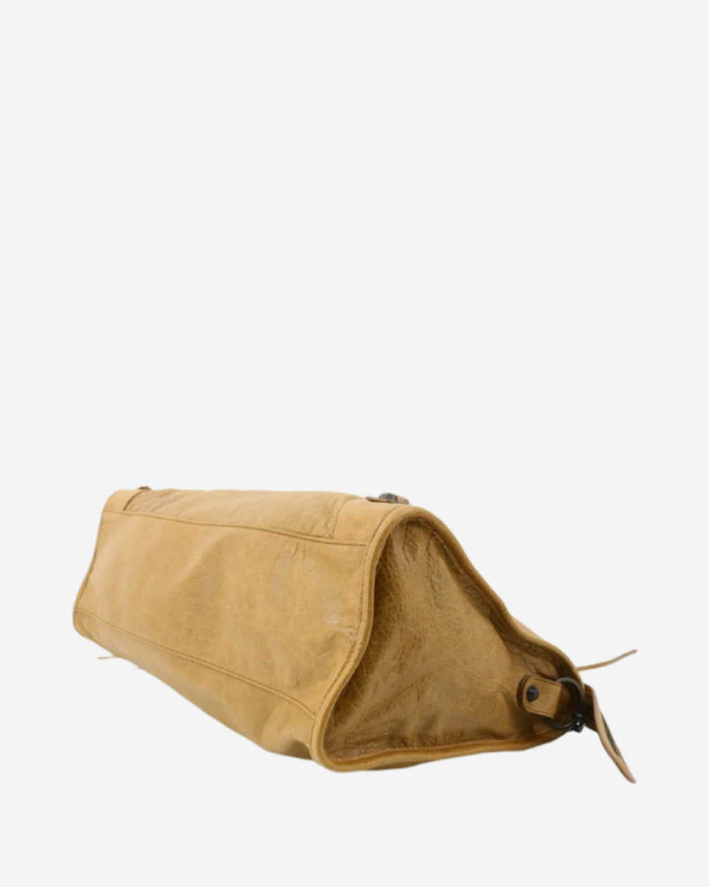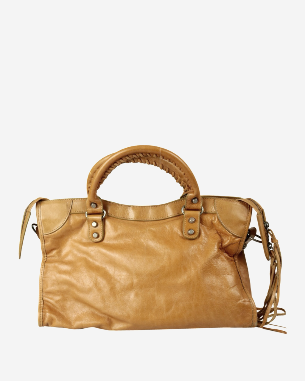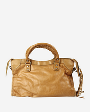 - Description: Tote bag with double fixed handle, front zip pocket, top closure, textile lining, aged effect hardware