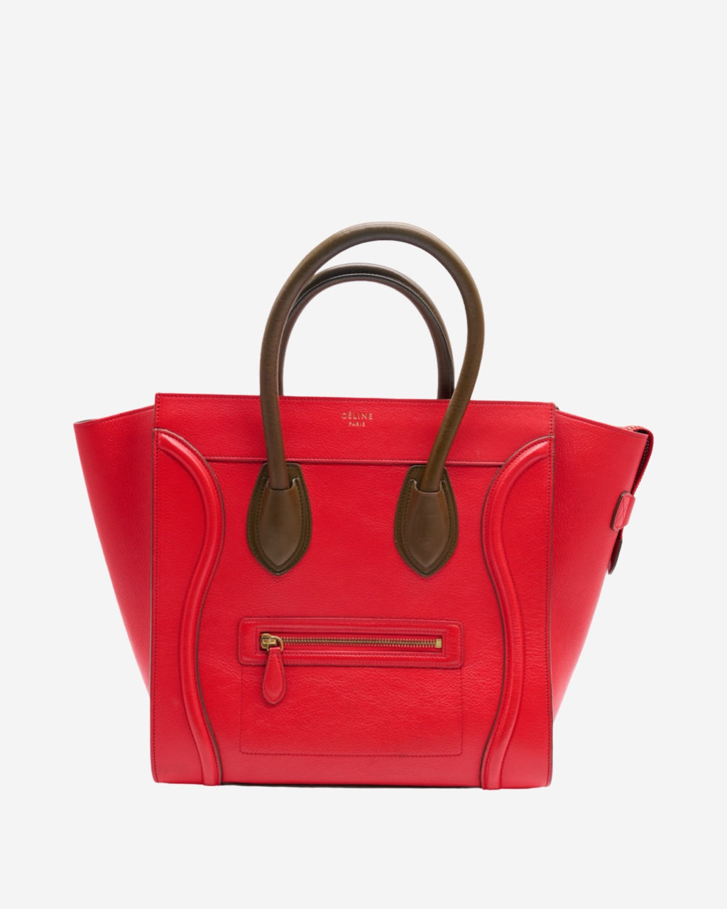 - Description: Celine handbag in red leather, double top handles, main opening with two-way zipper, brown leather lining with pocket, gold-tone hardware