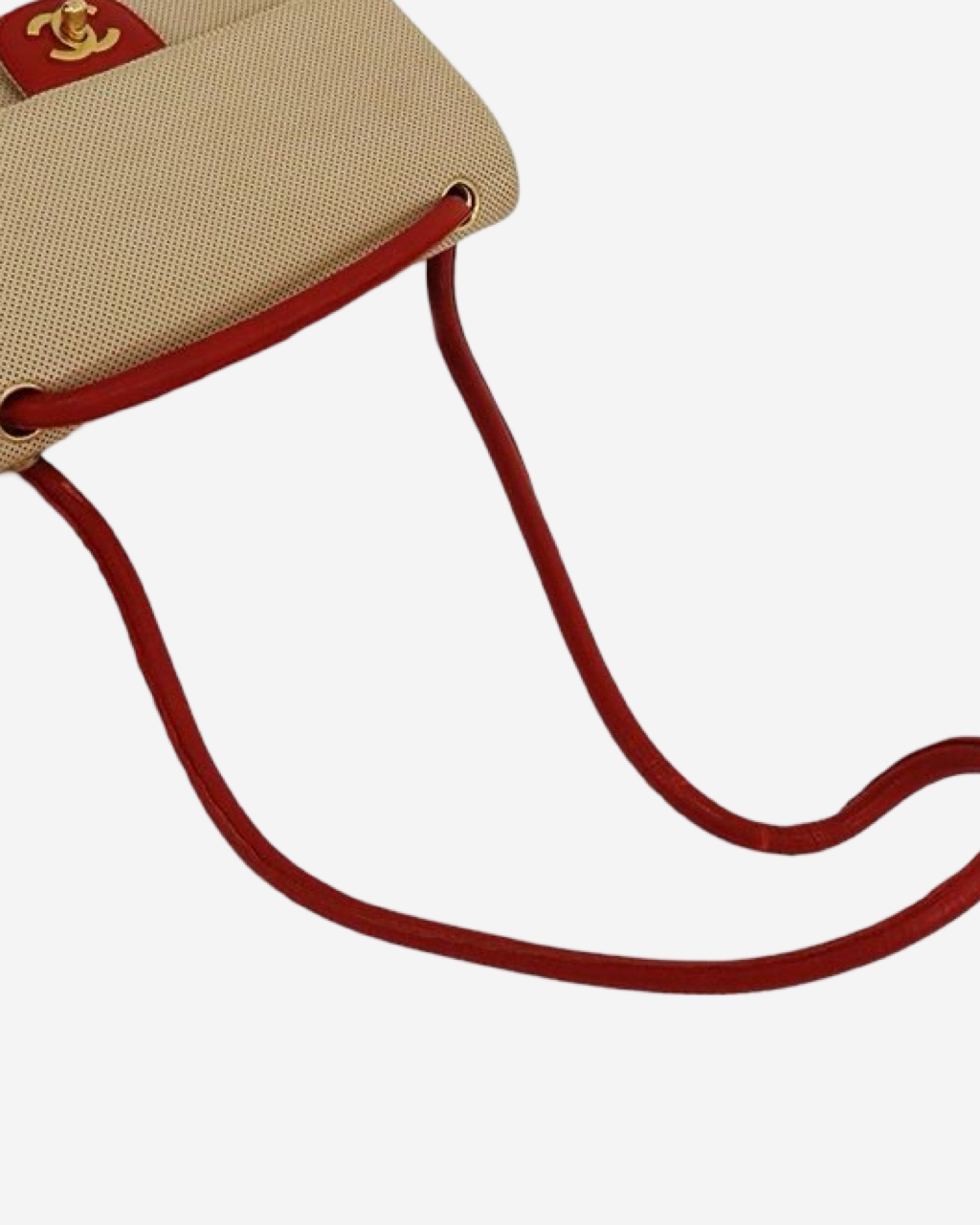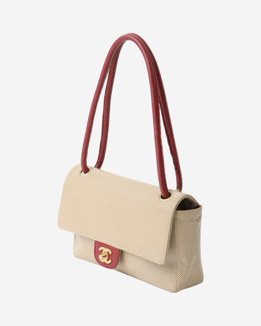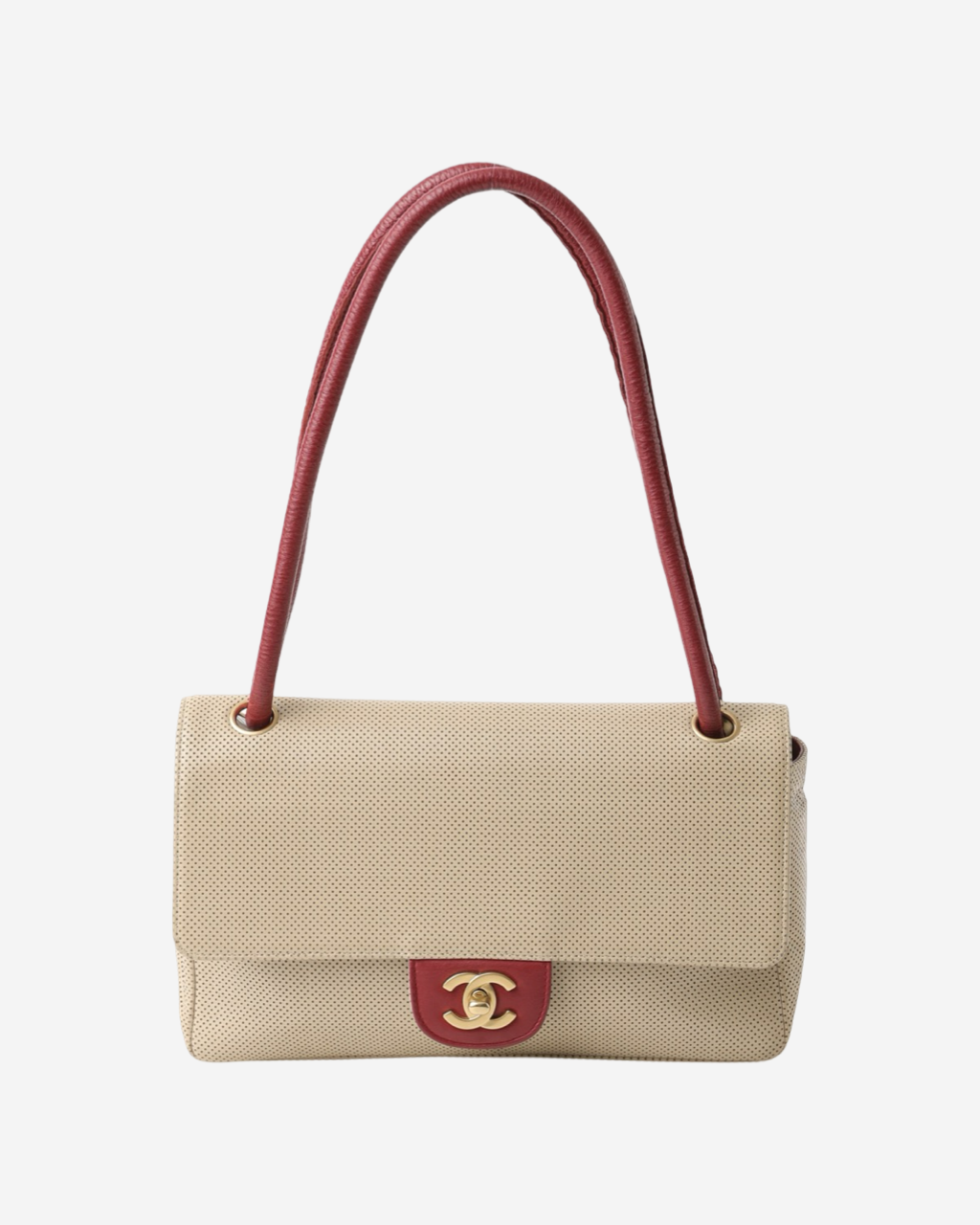 - Description: Shoulder bag in beige perforated leather, double fixed handle, Chanel CC Turnlock clasp, front flap, leather interior with pocket, silver-colored hardware