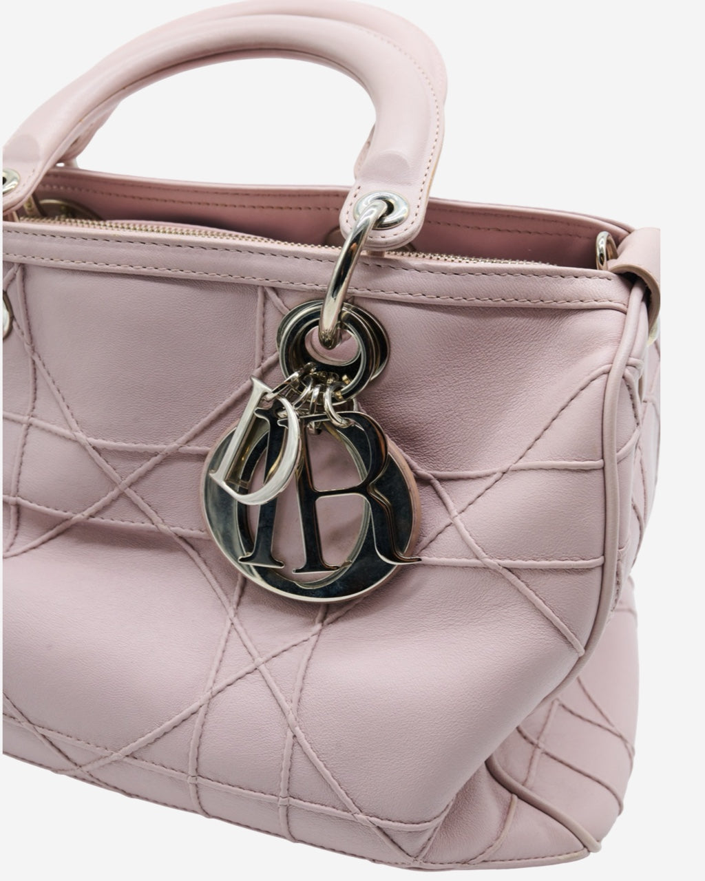 - Description: Dior handbag in pink leather, signature cannage effect, double fixed handle, front metal pendant, three main openings, two open and one with a double closure, textile interior lining, silver-tone hardware
