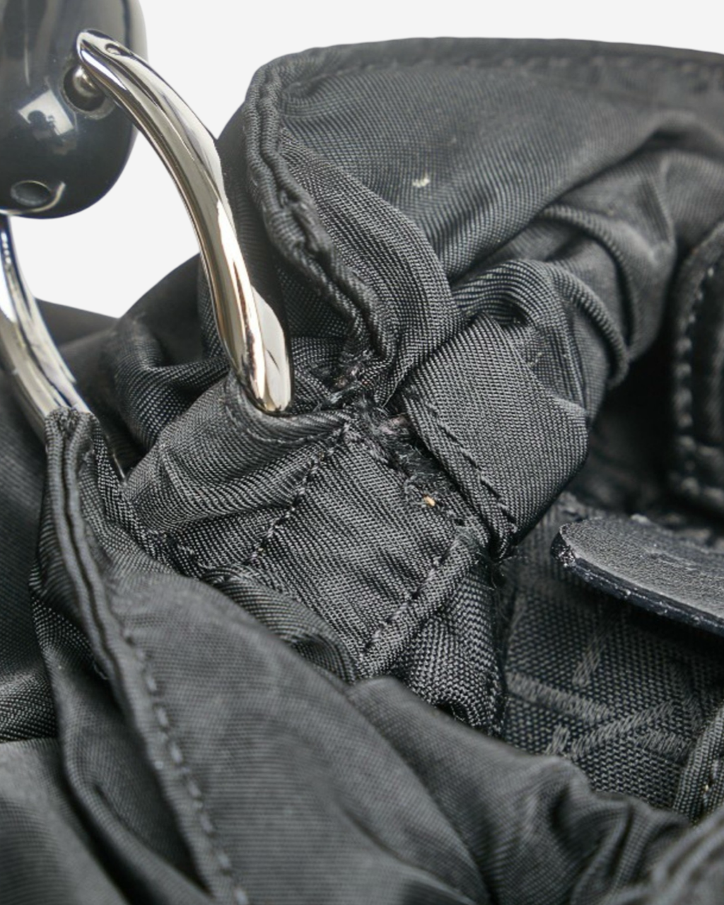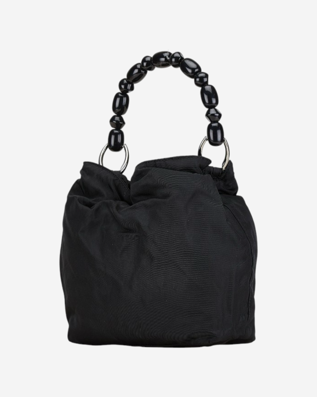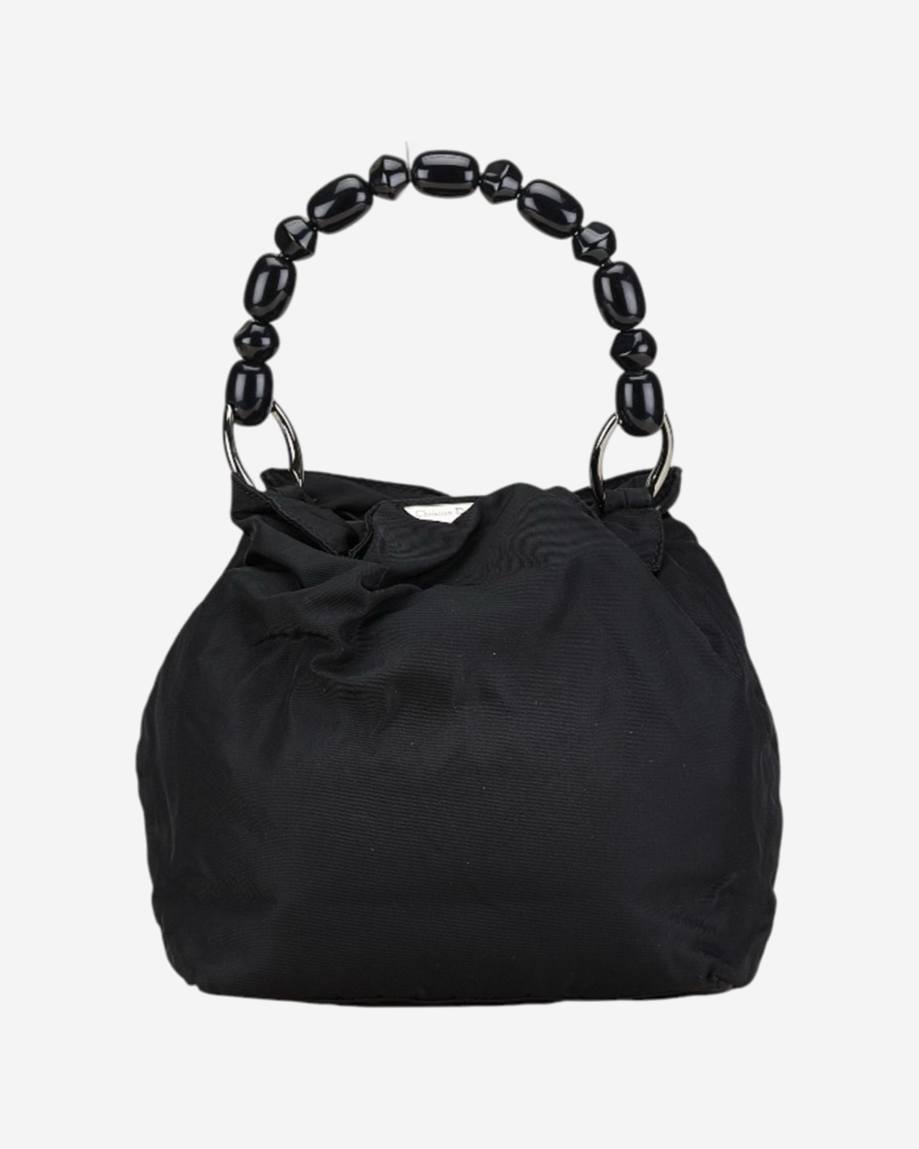 - Description: Handbag with a fixed metal handle in black, opening with magnetic clasp, front logo plate, silver-colored hardware
