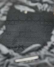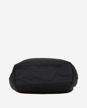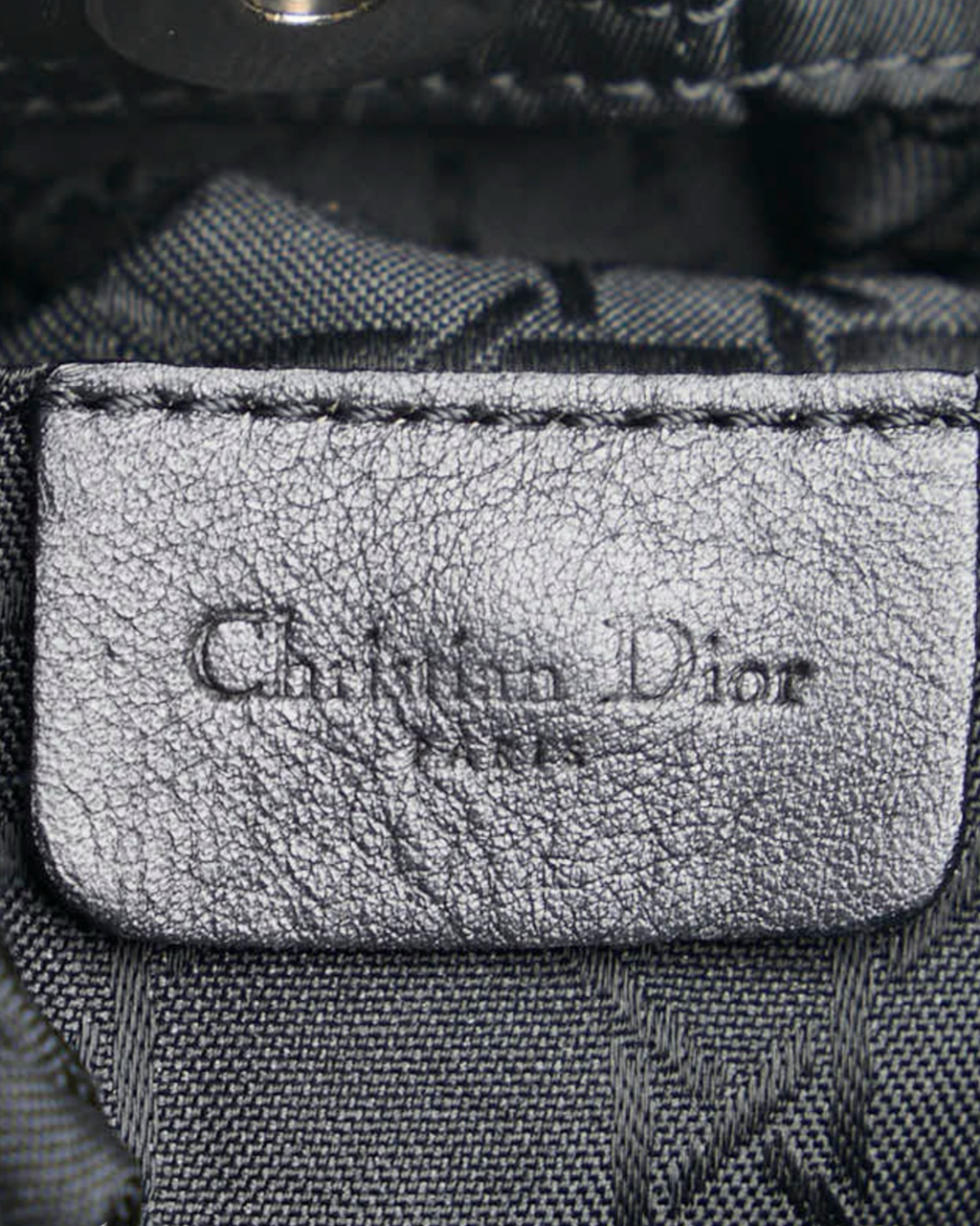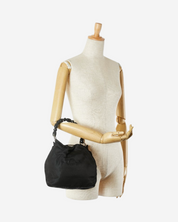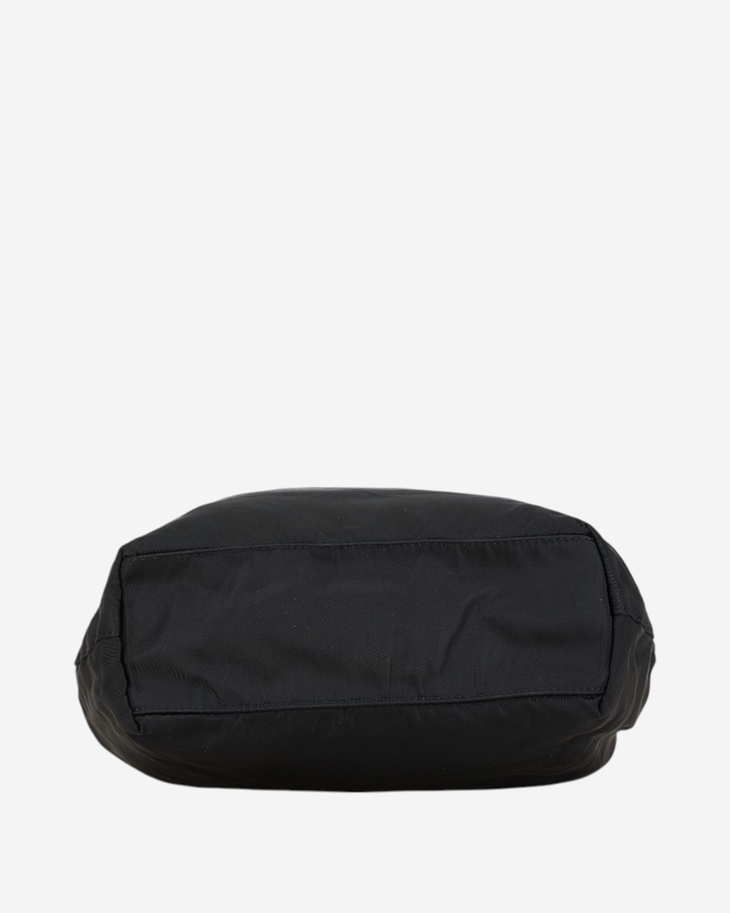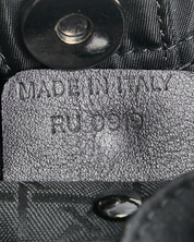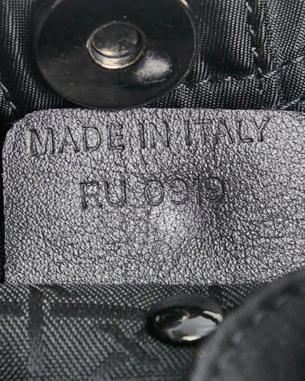 - Description: Handbag with a fixed metal handle in black, opening with magnetic clasp, front logo plate, silver-colored hardware