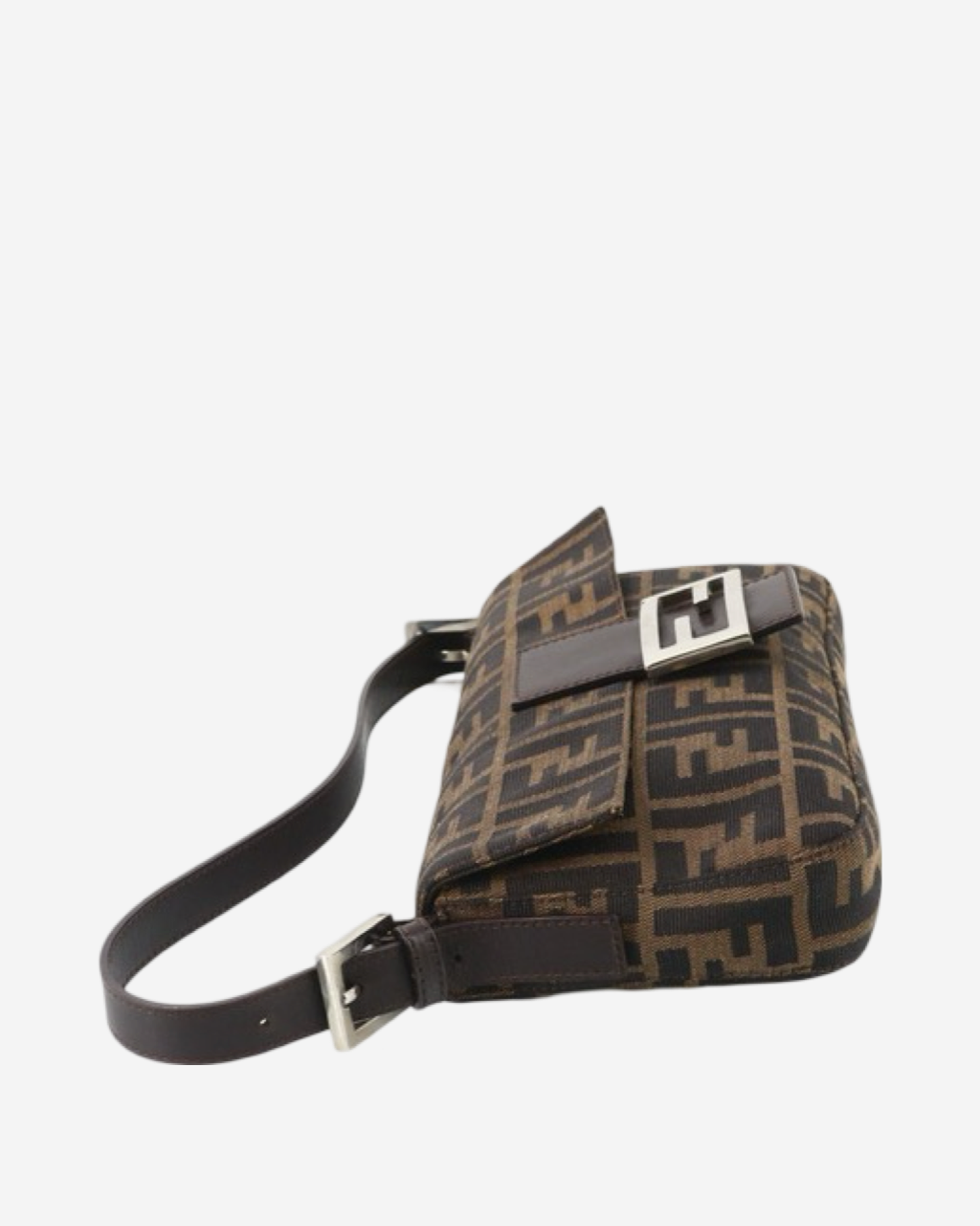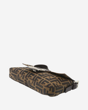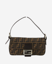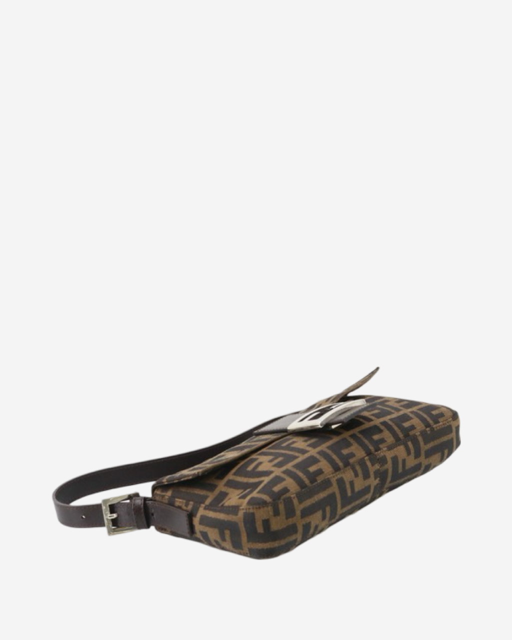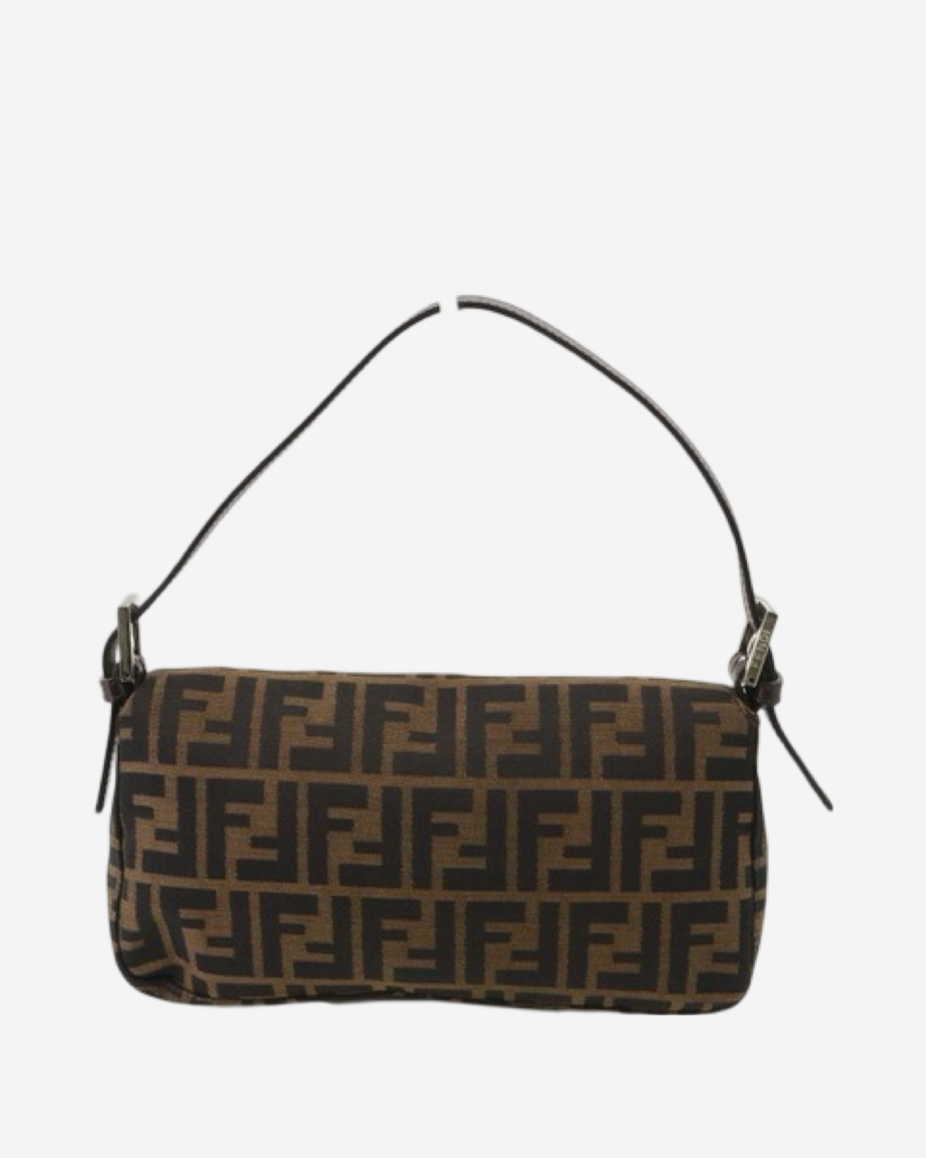 - Description: Fendi baguette bag in brown Zucca Canvas, magnetic front FF clasp, adjustable leather strap, silver hardware
