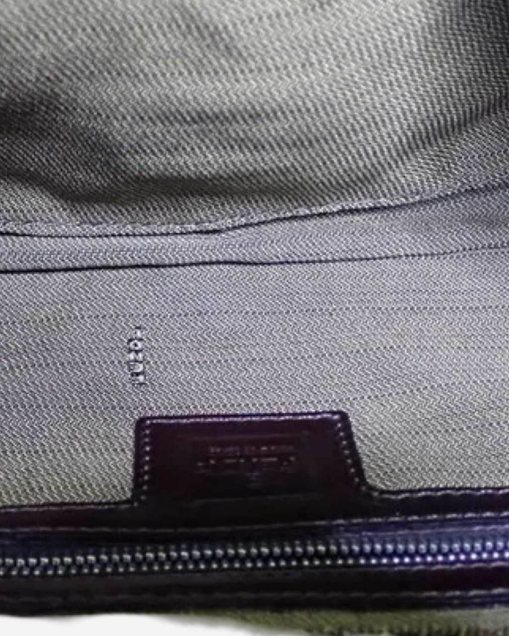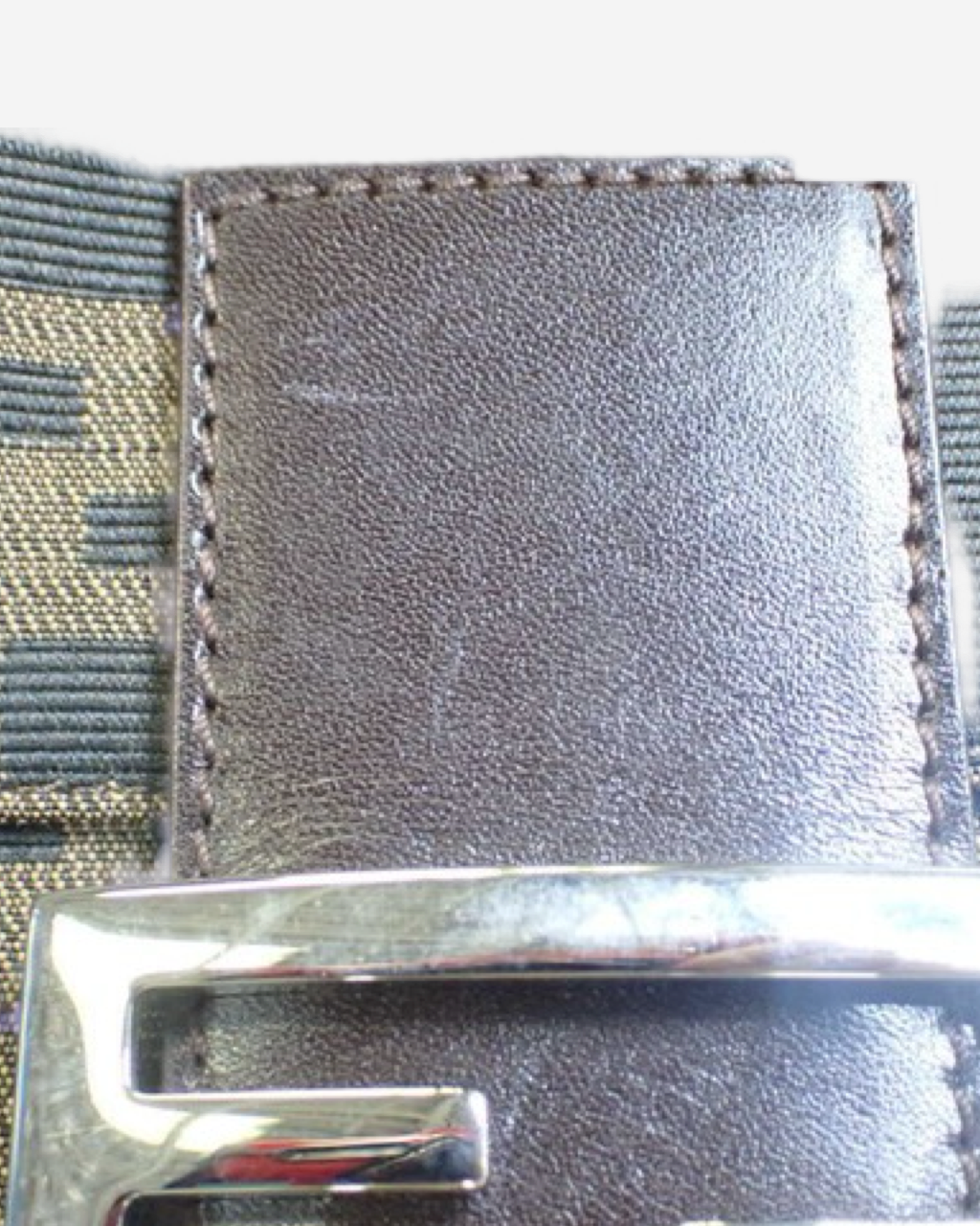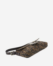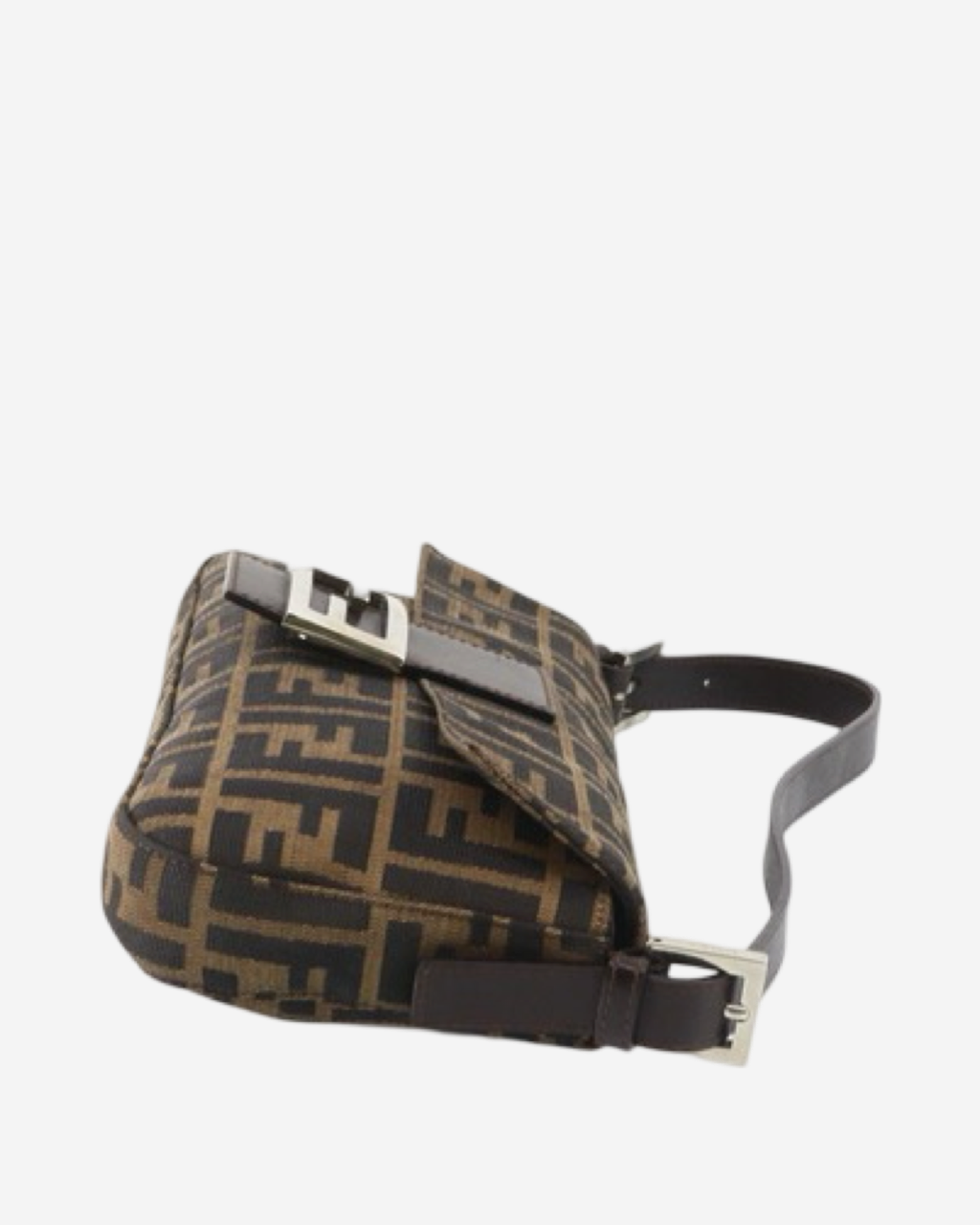 - Description: Fendi baguette bag in brown Zucca Canvas, magnetic front FF clasp, adjustable leather strap, silver hardware
