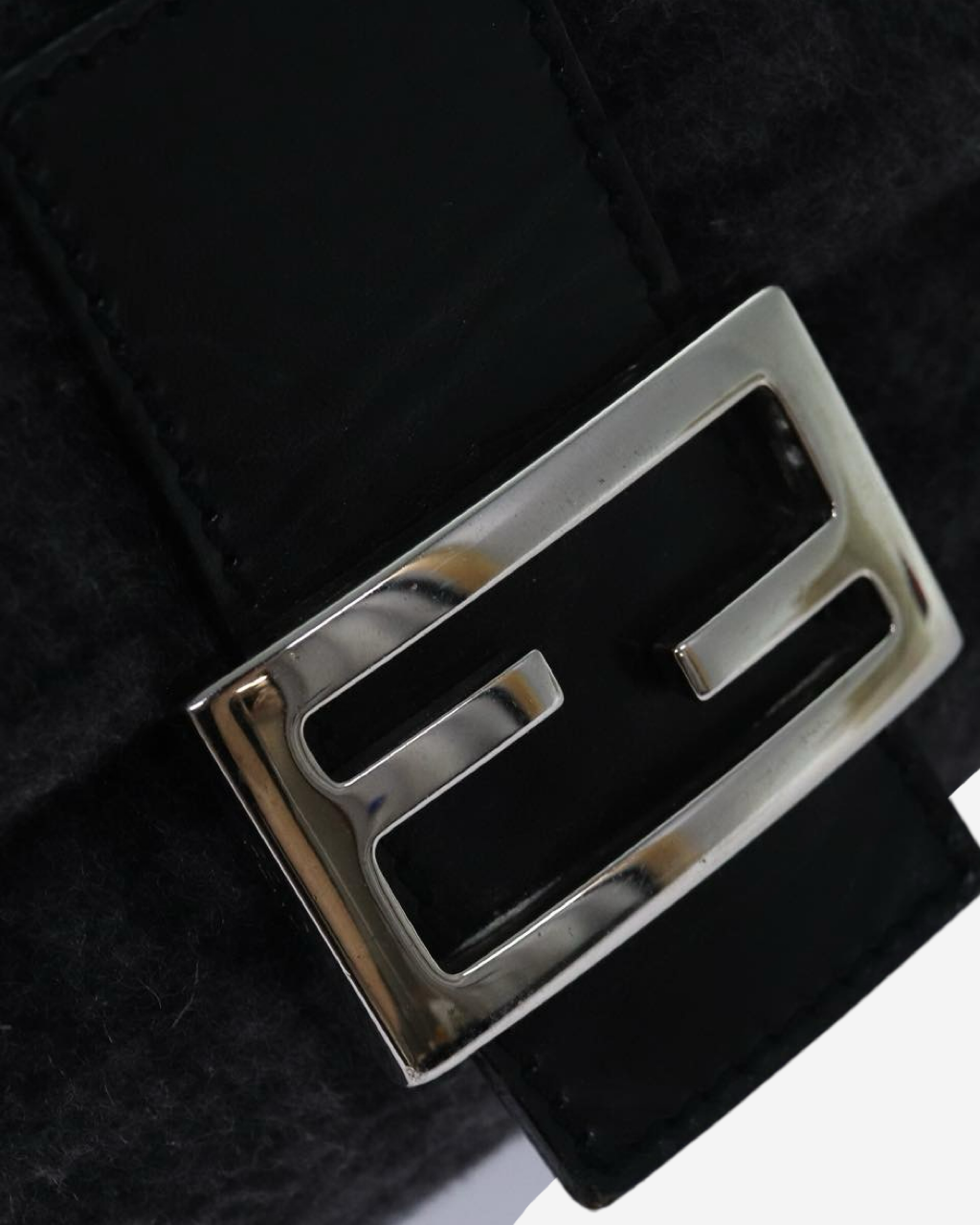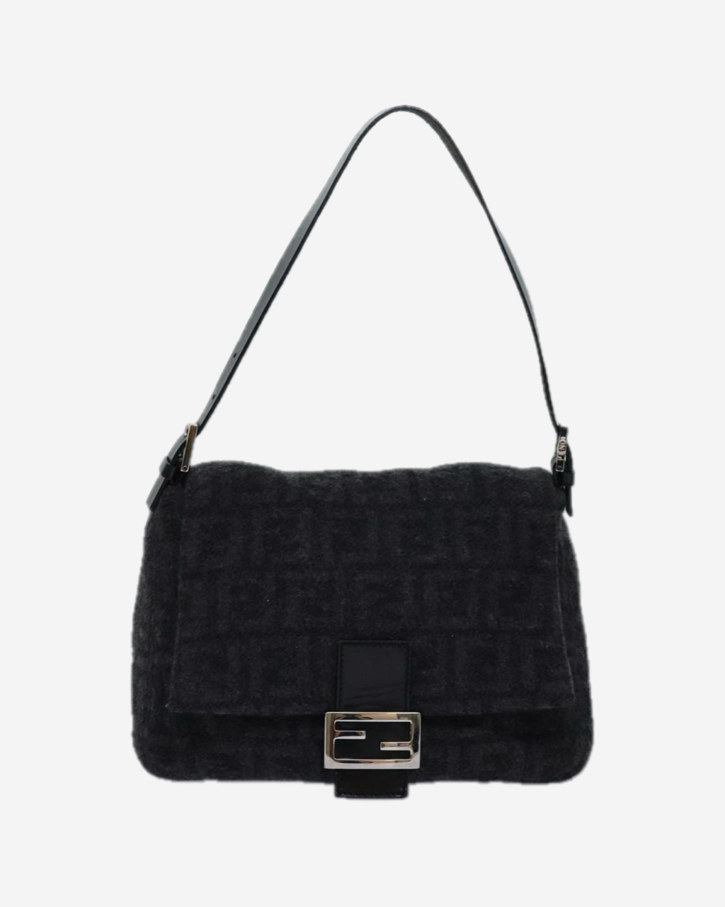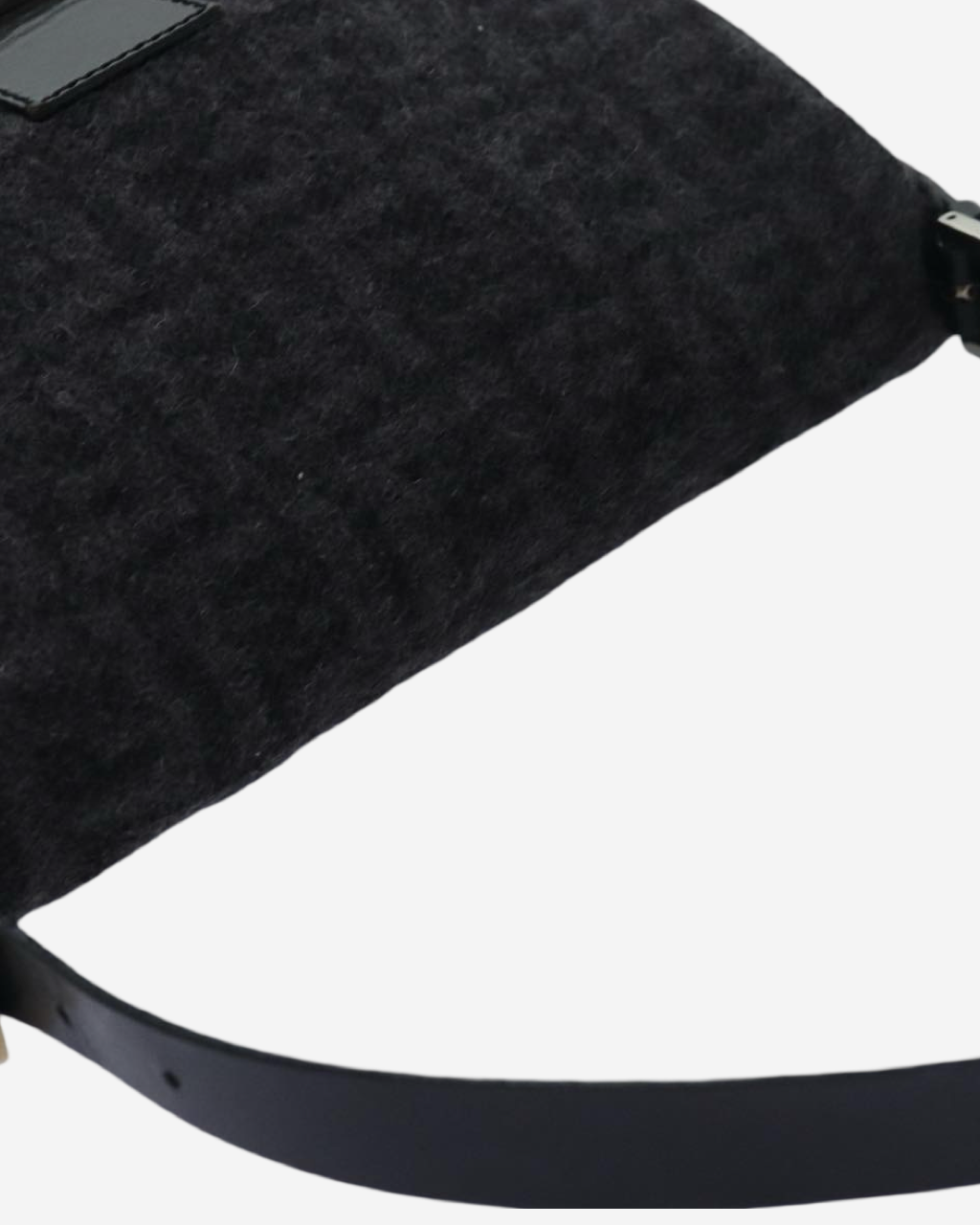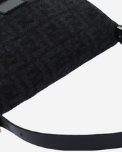 - Description: Fendi Baguette bag in brown wool canvas, signature FF front clasp, fixed chain and leather handle, flap opening, black interior lining, gold-tone hardware