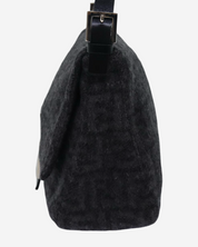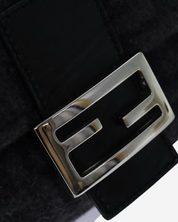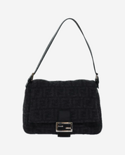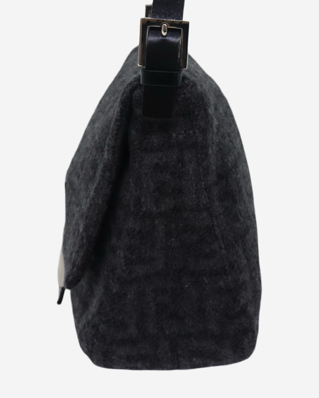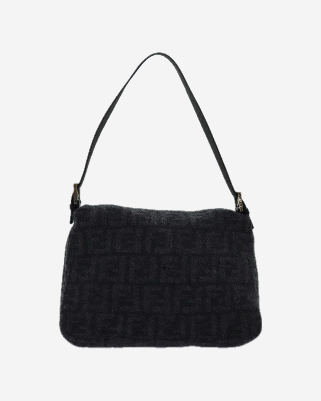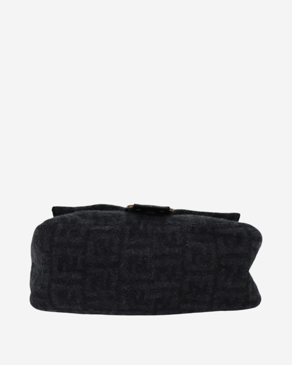- Description: Fendi Baguette bag in brown wool canvas, signature FF front clasp, fixed chain and leather handle, flap opening, black interior lining, gold-tone hardware