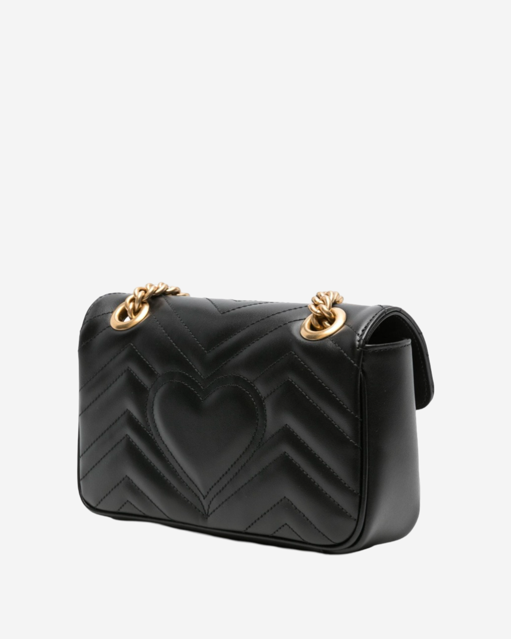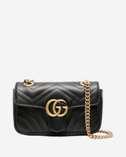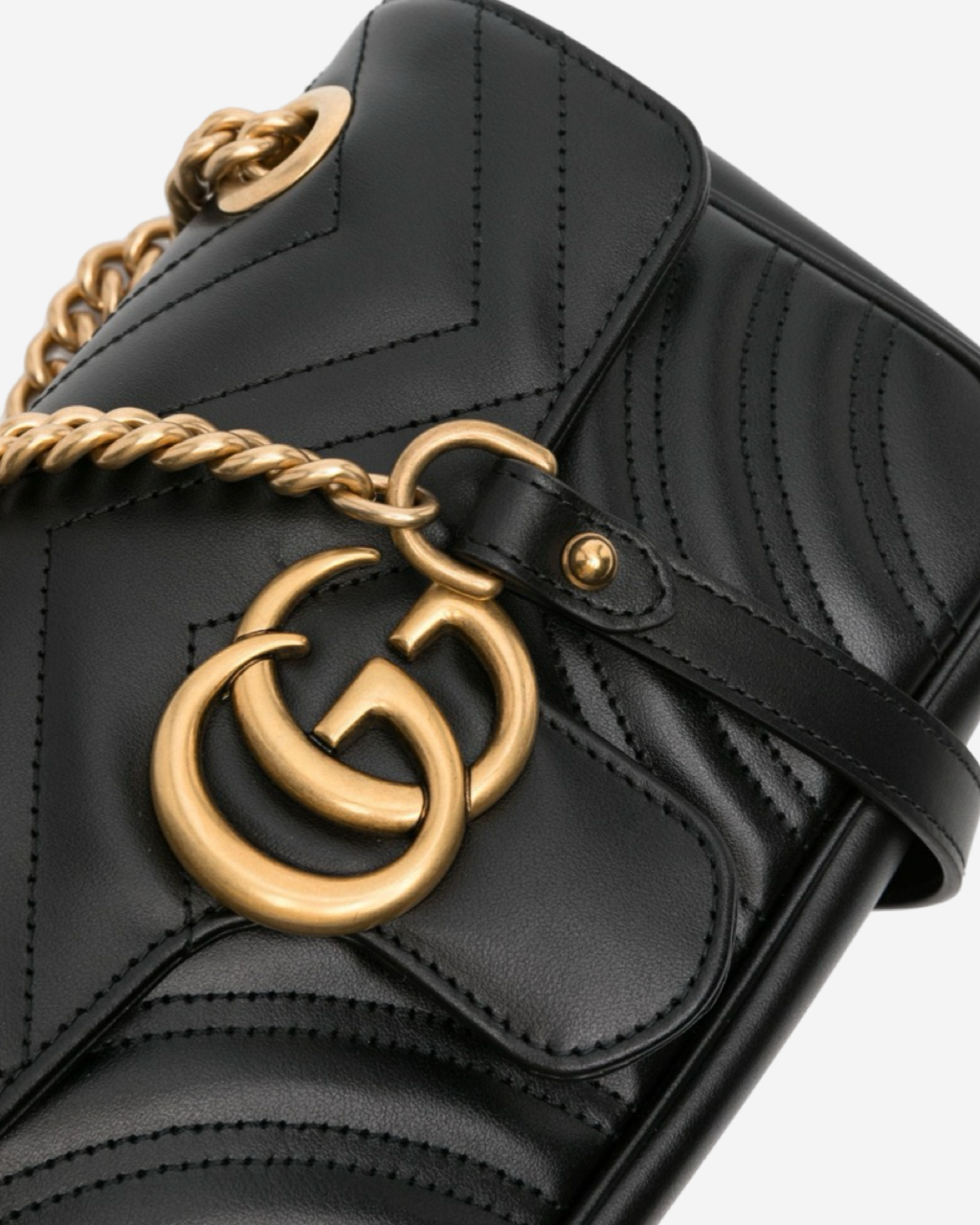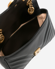 - Description: Black crossbody bag, front GG plate, flap opening, beige interior, fixed leather strap with chains, gold hardware