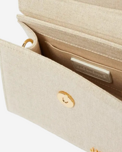 - Description: Handbag with curved handle, flap opening, signature front logo, gold hardware