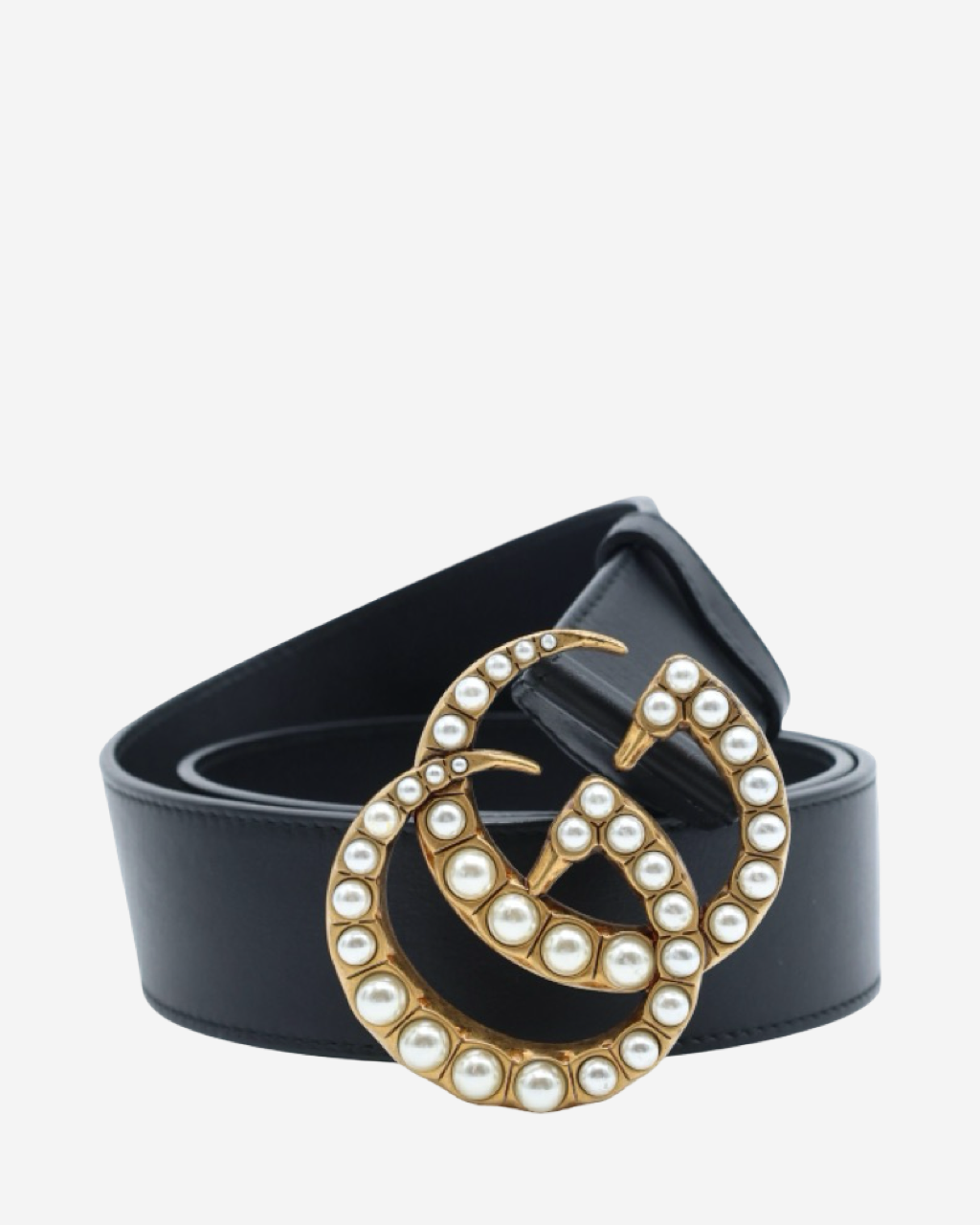 - Description : Black leather belt, gold-tone buckle with GG logo and artificial pearl inlays