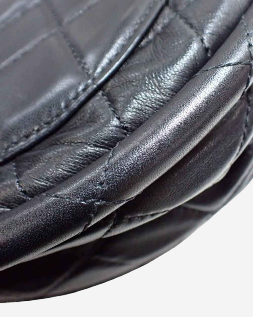 - Description: Black leather Chanel bag, double fixed handles, main opening with flap, CC turnlock clasp, textile lining with reversible pocket, silver-tone hardware