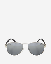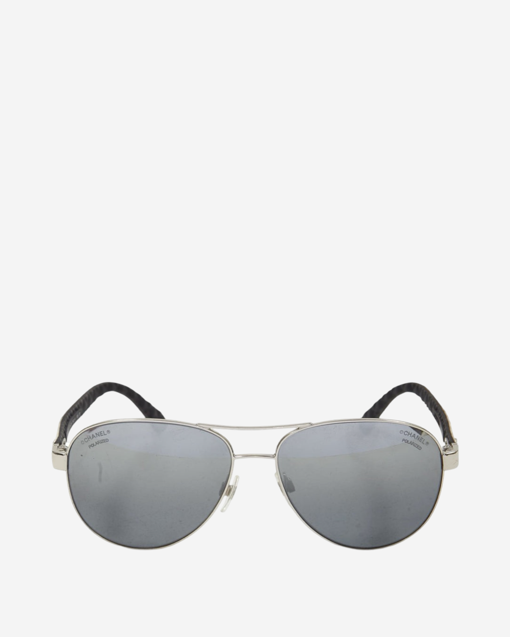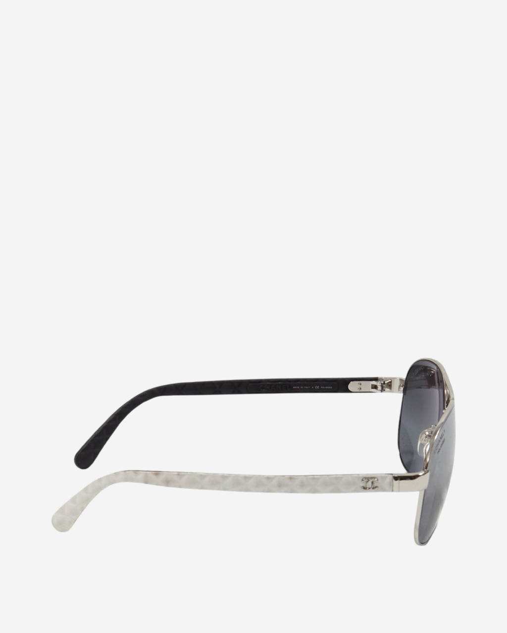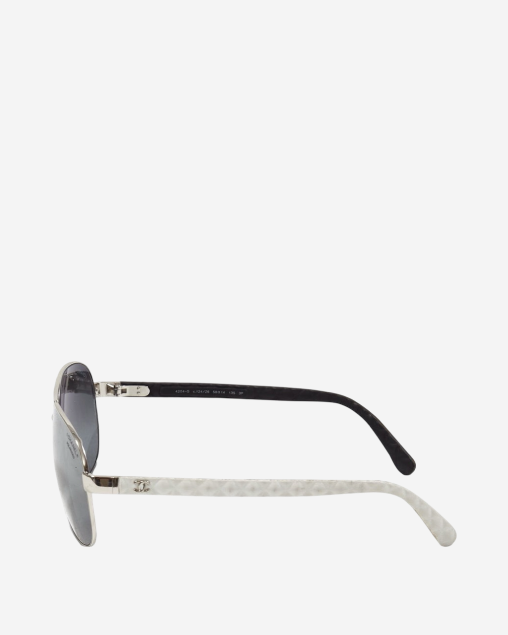 - Description: White aviator sunglasses, signature logo on the sides, silver hardware