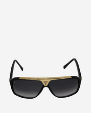 - Description: Louis Vuitton sunglasses in black plastic with gold details, signature logo on the side