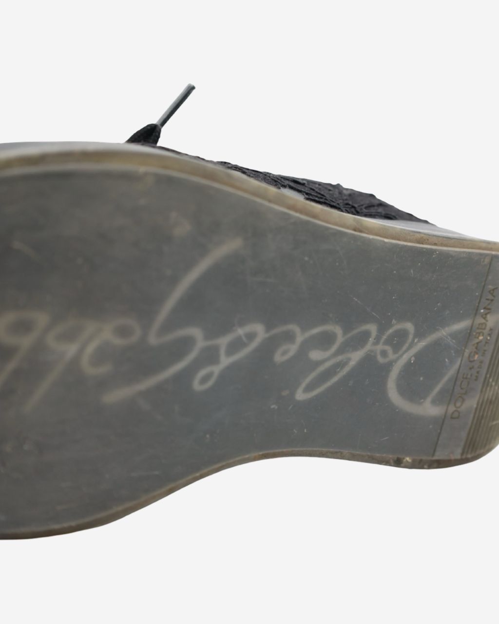 - Description: Black leather sneakers, rounded toe, lace-up closure, black rubber sole, lace detail on the sides
