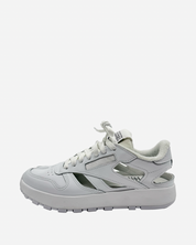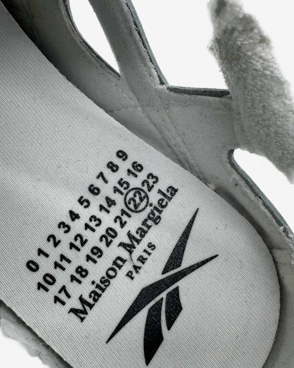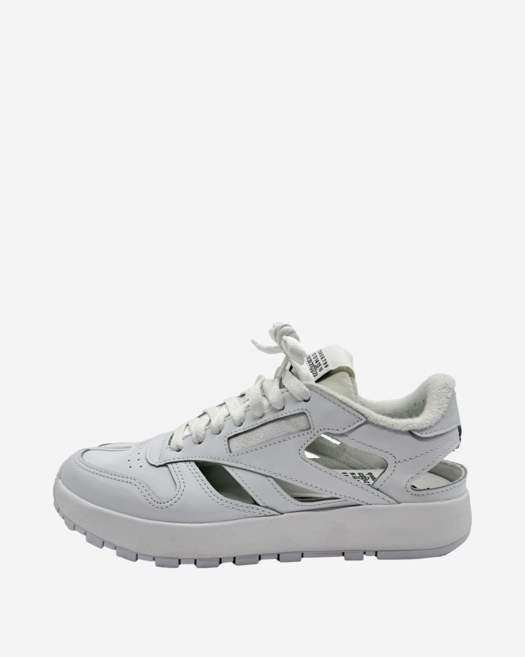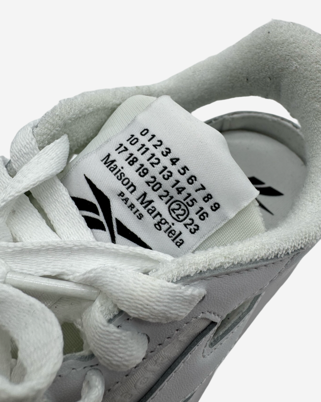 - Description: White leather tennis shoes with a distinctive split toe, lace-up fit, and rubber sole.