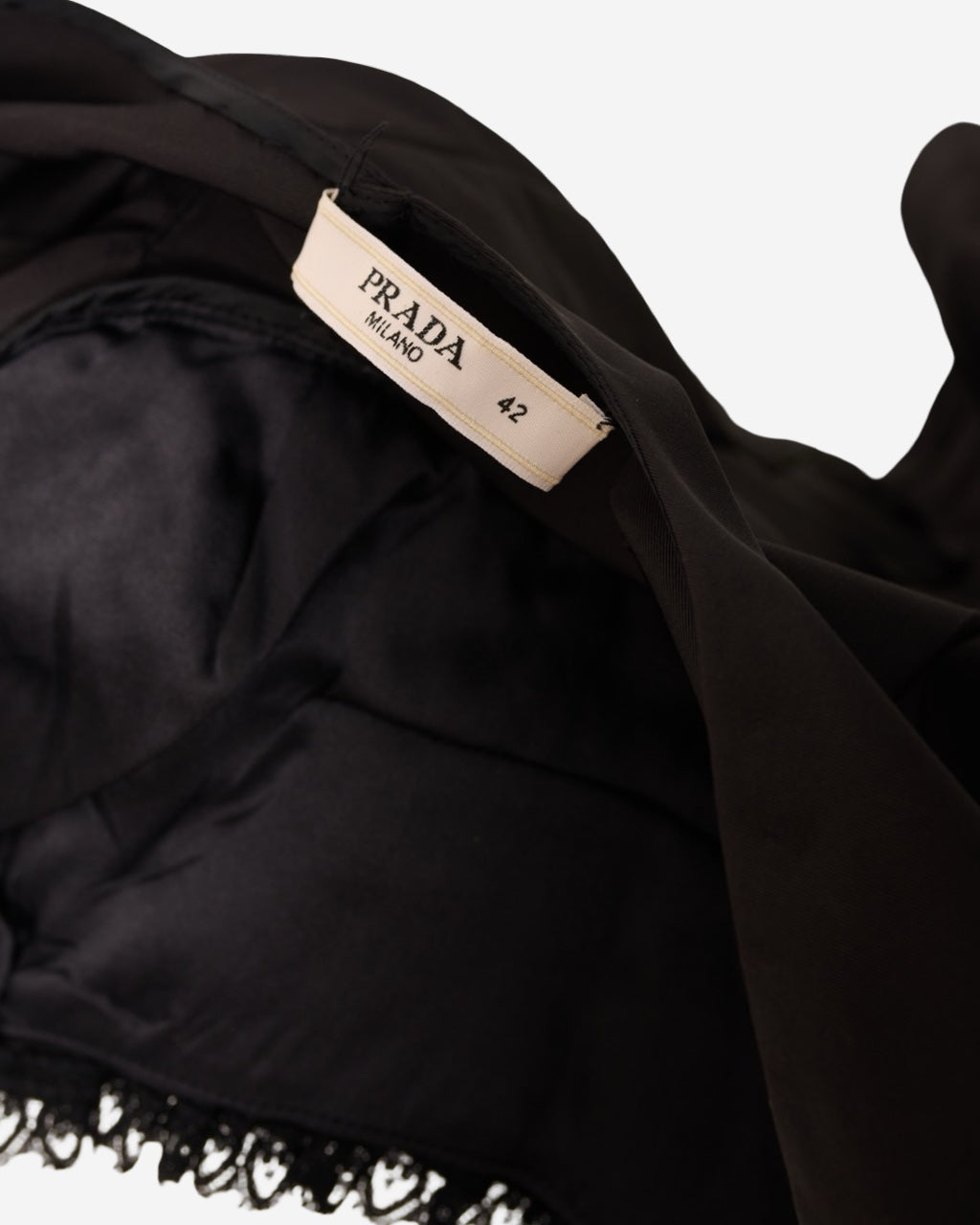 - Description: Prada blouse in black nylon, round neck with front ruffle detail, two straps, adjustable sides