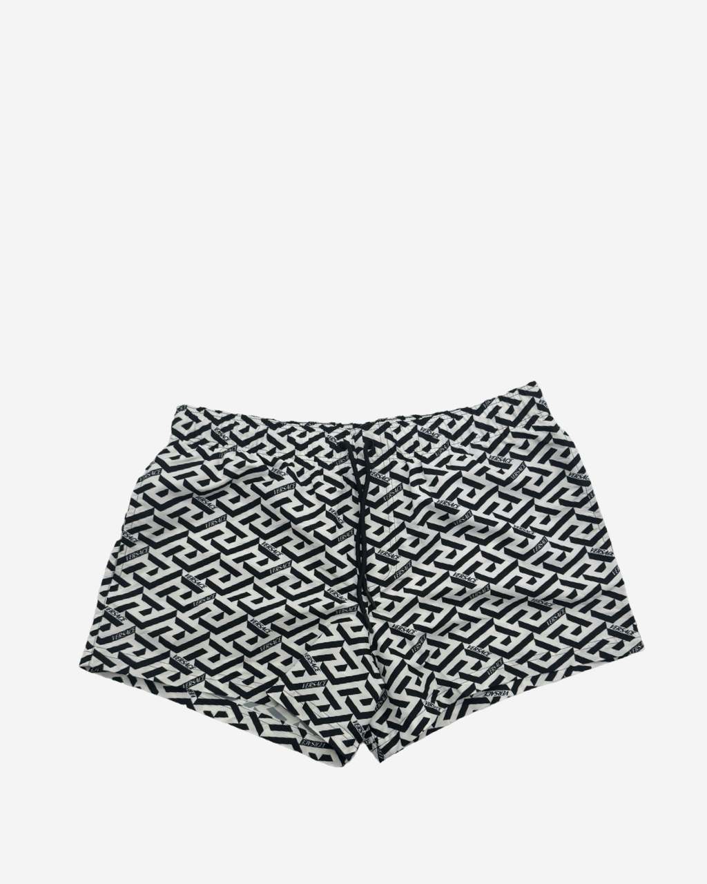 - Description: Nylon swimsuit with black and white Greek print, adjustable with spring and drawstring, short