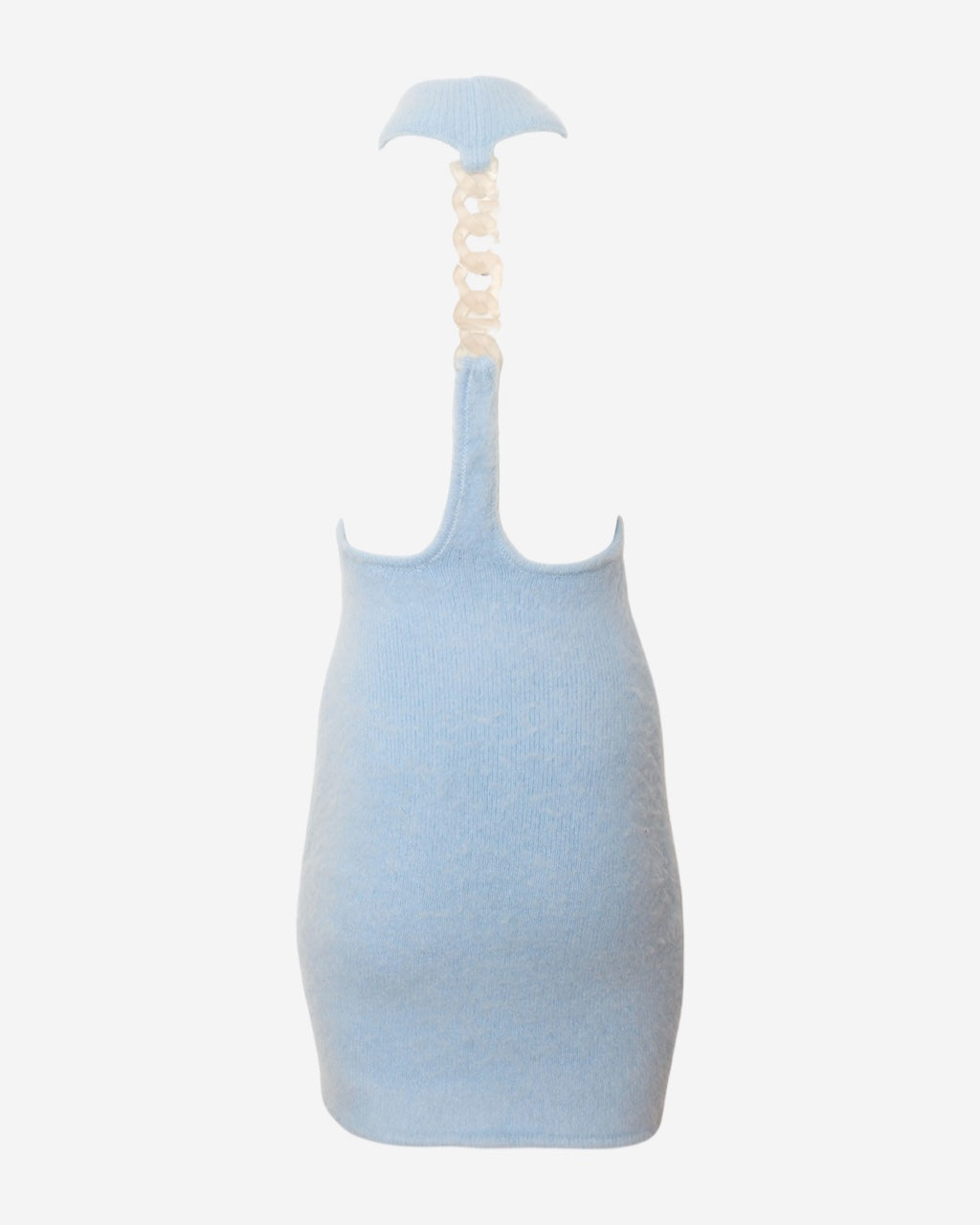 - Description: GCDS dress in blue, halter style, transparent chain at the neck, open back, fur motif, mini length