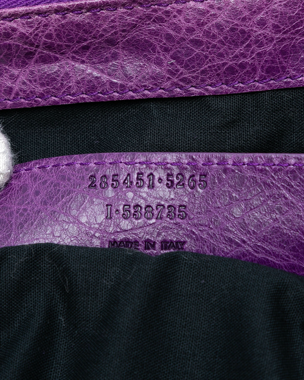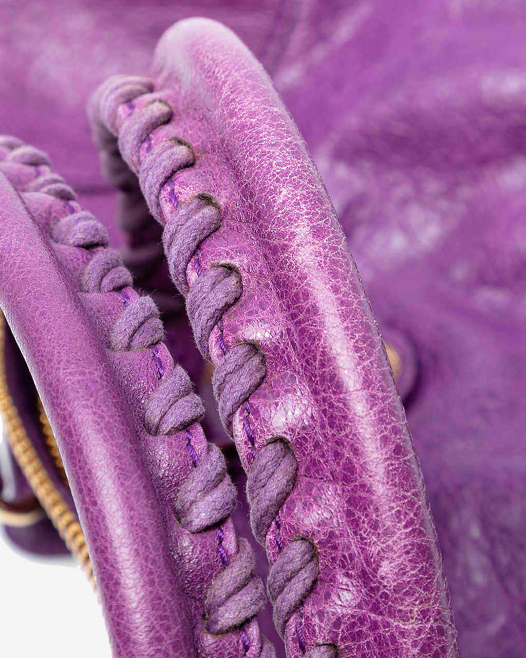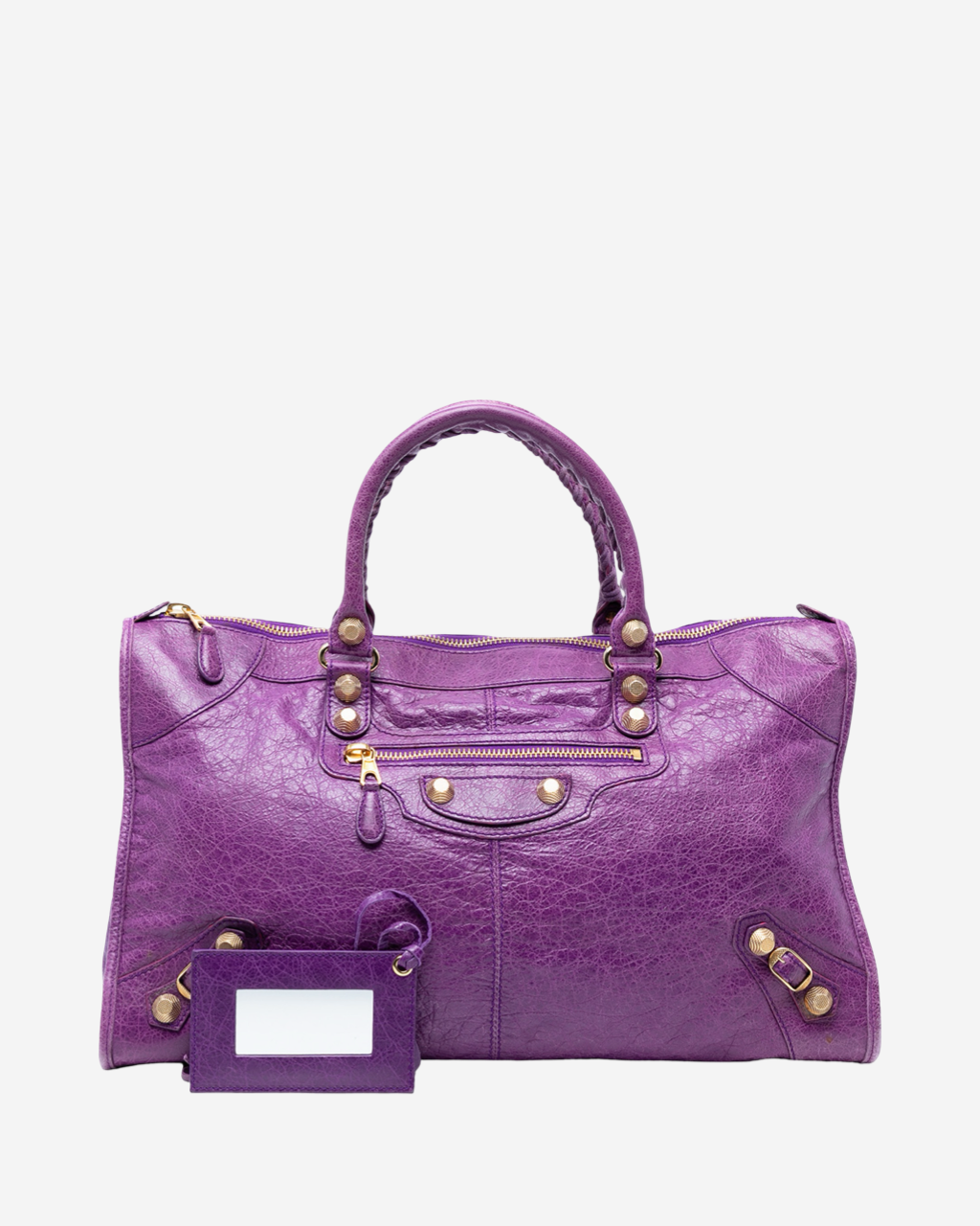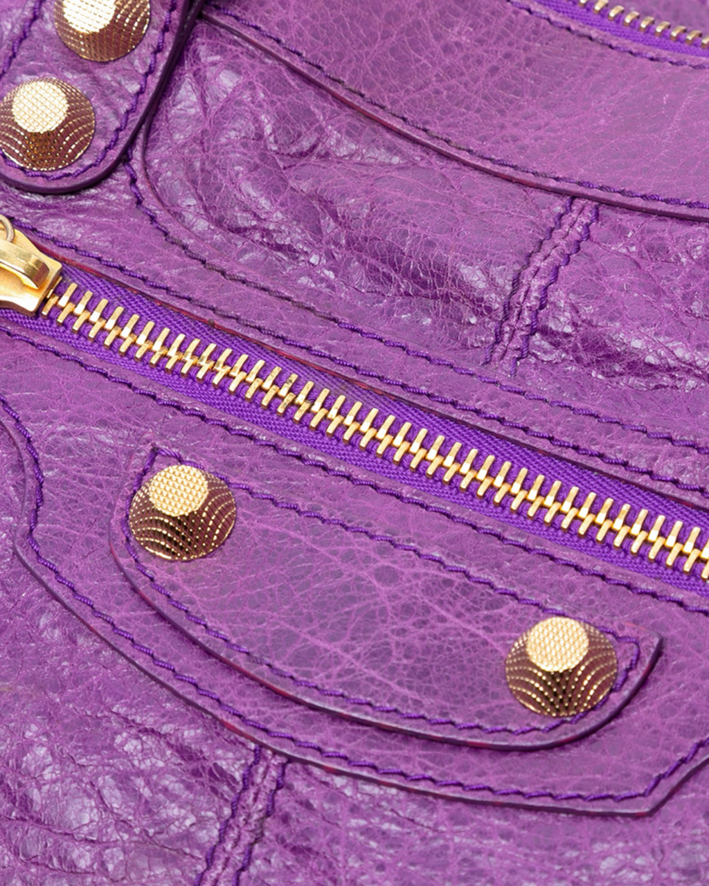 - Descripción: Bolsa de mano Balenciaga en piel color morado, doble asa fija, abertura principal con cierre de doble sentido, motivo de studs característicos, forro interior textil, hardware en tono dorado
