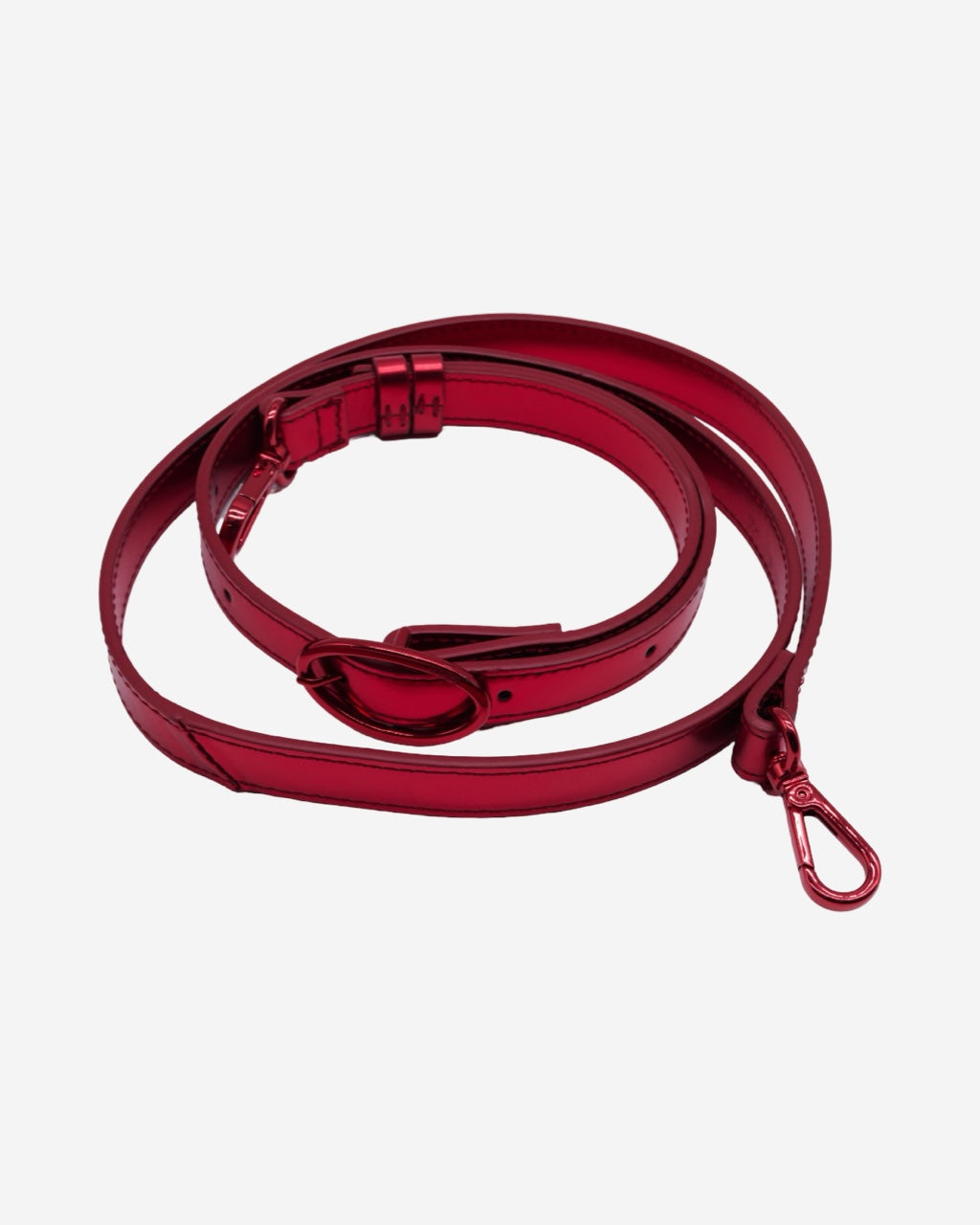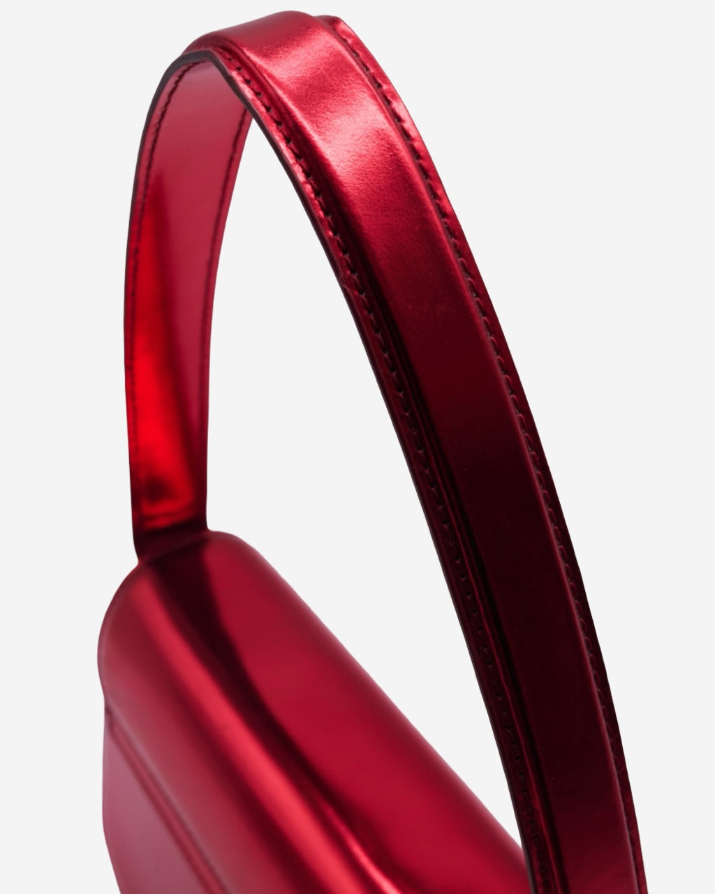 - Descripción: Bolsa de hombro Diesel en piel color rojo metálico, placa metálica frontal, asa fija, abertura principal con solapa y broche metálico, dos compartimentos interiores, forro interior textil, hardware en tono plateado