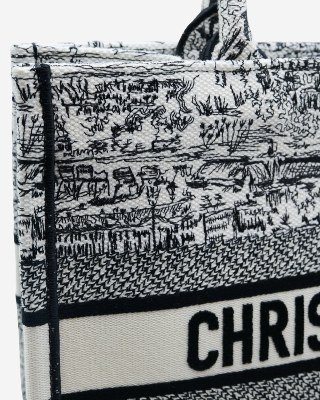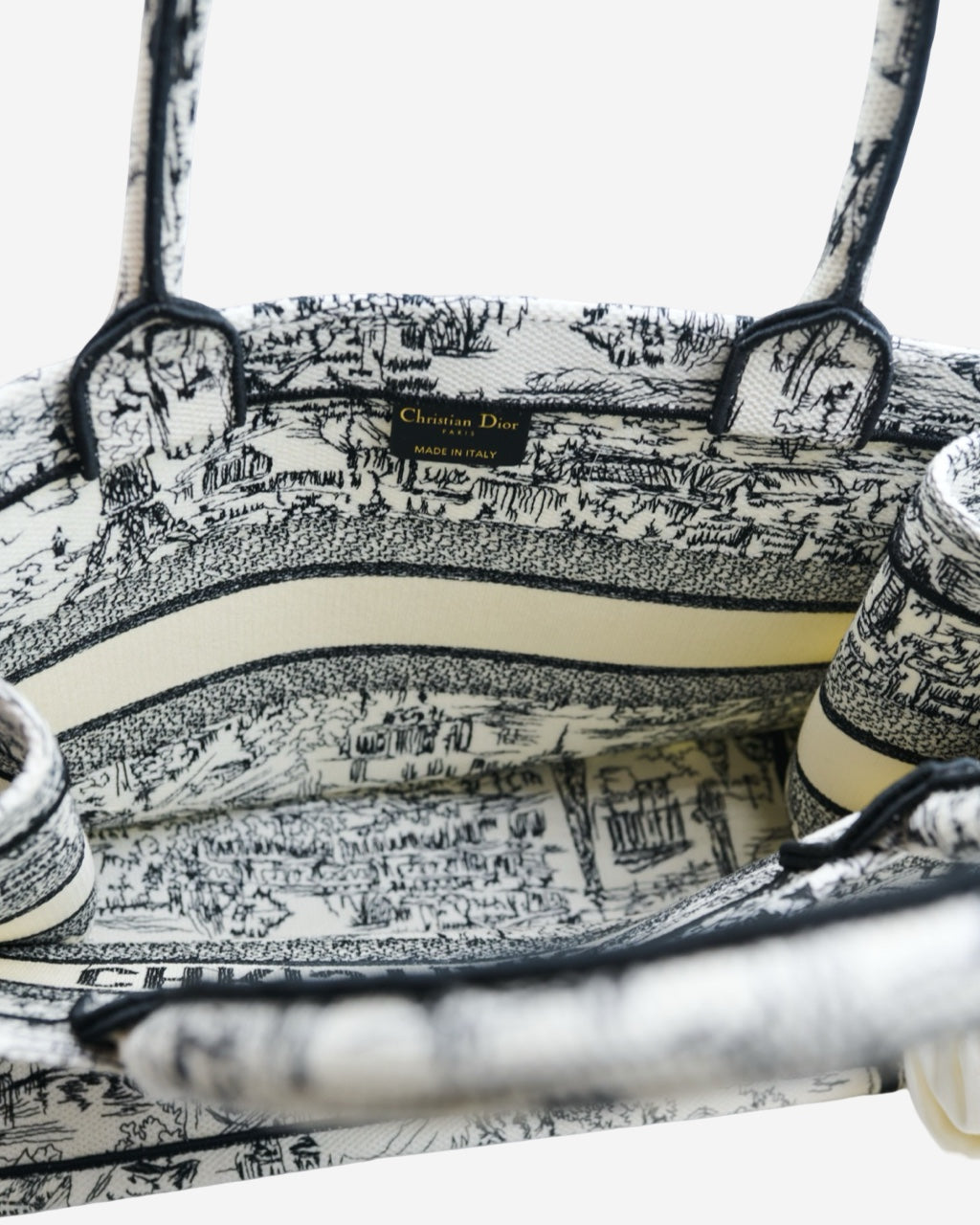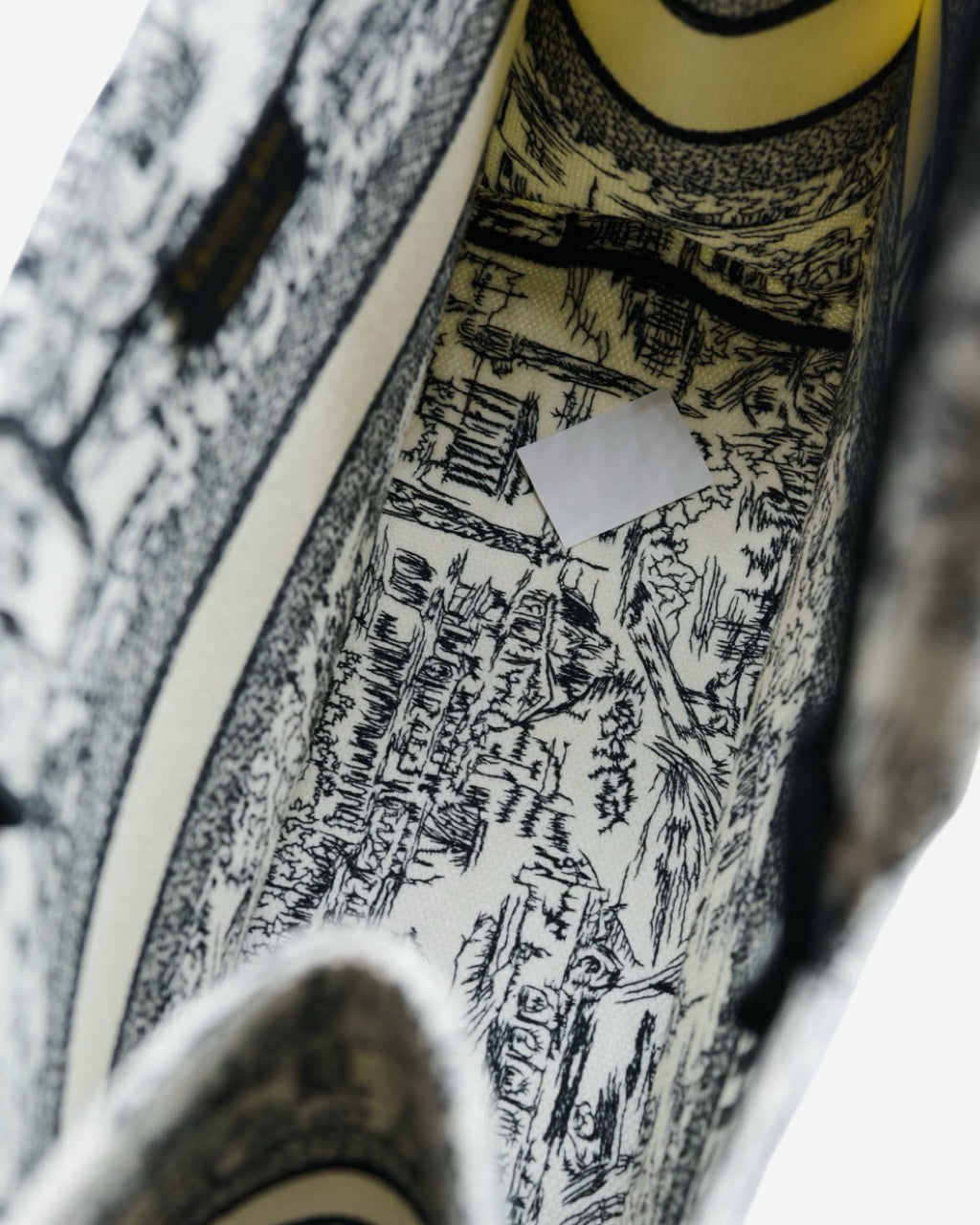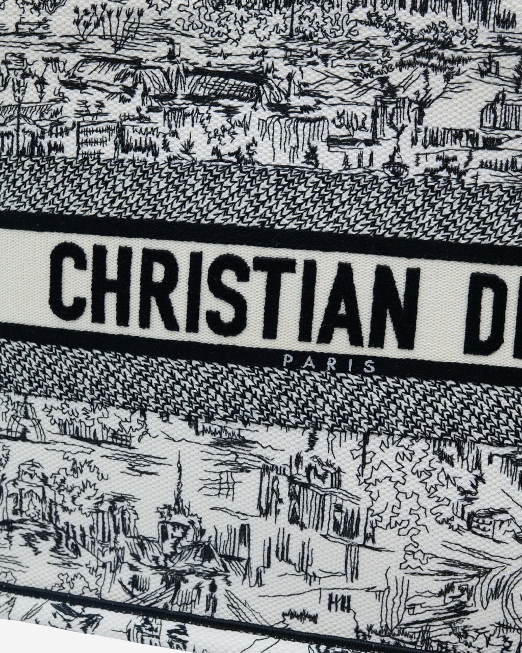 - Descripción: Bolsa de mano tipo tote Dior en canvas con motivo de París en fondo blanco con bordados en azul, logo bordado frontal, doble asa fija, abertura principal abierta