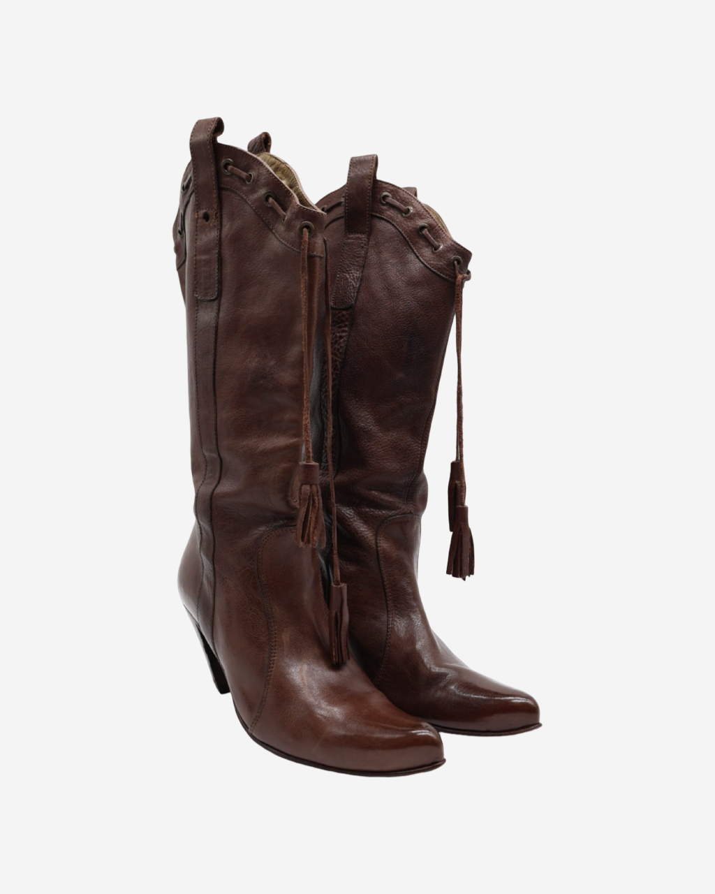 - Descripción: Botas de tacón en color café, puntera puntiaguda, tacón medio, terminado western con tassels