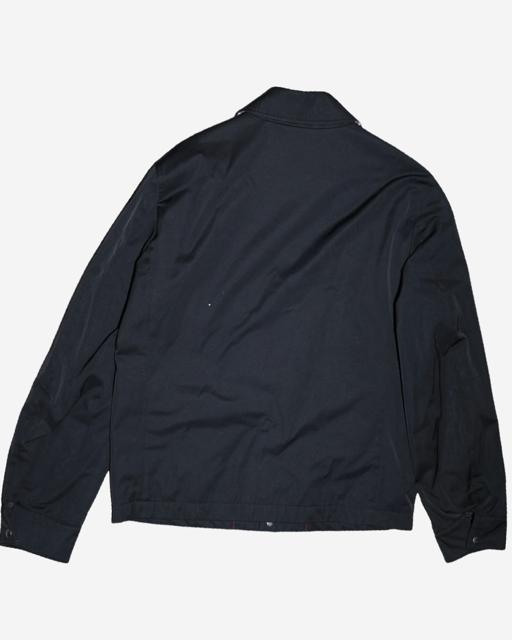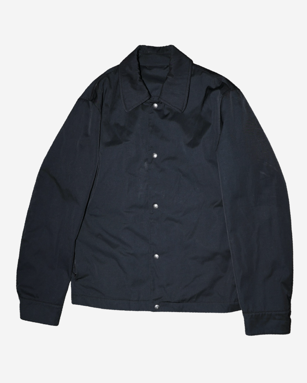 - Descripción: Chamarra en color negro, corte relaxed, manga corta, cuello italiano, ajuste con botones a presión, hardware en tono plateado