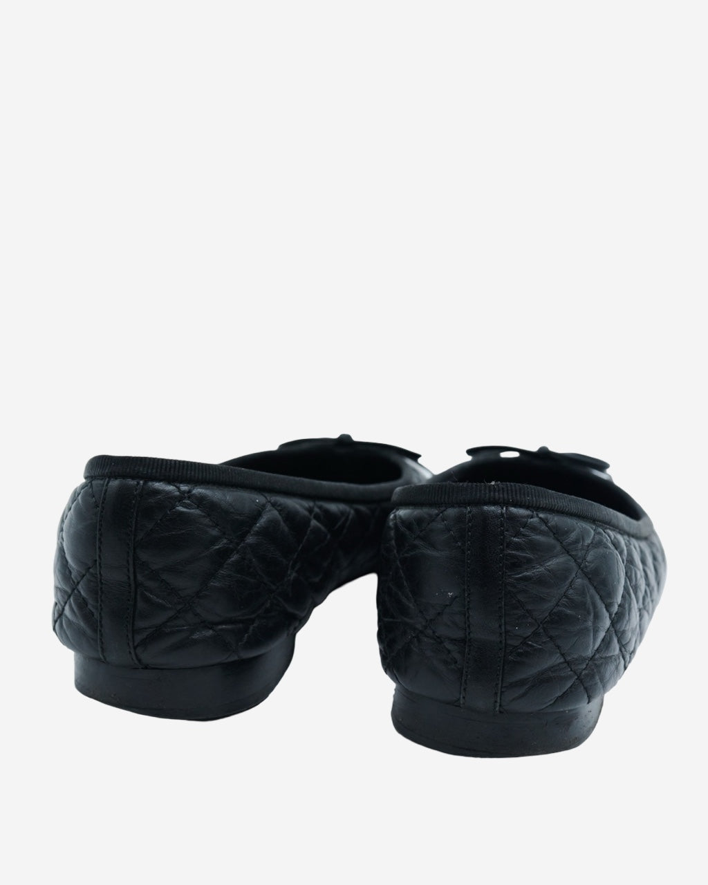 - Descripción: Flats Chanel en piel color negro, bordado carcaterístico frontal, puntera redondeada, logo grabado en el interior, motivo bordado con moño