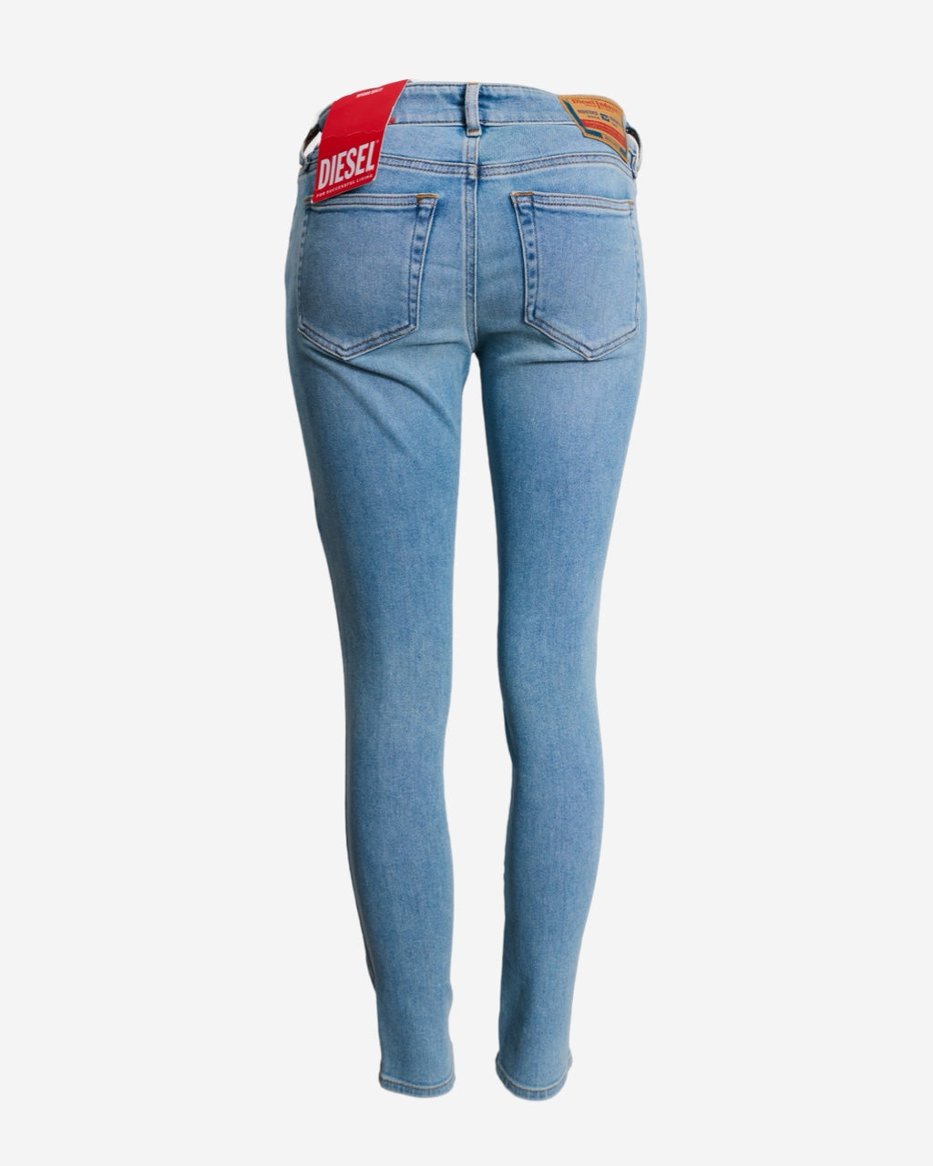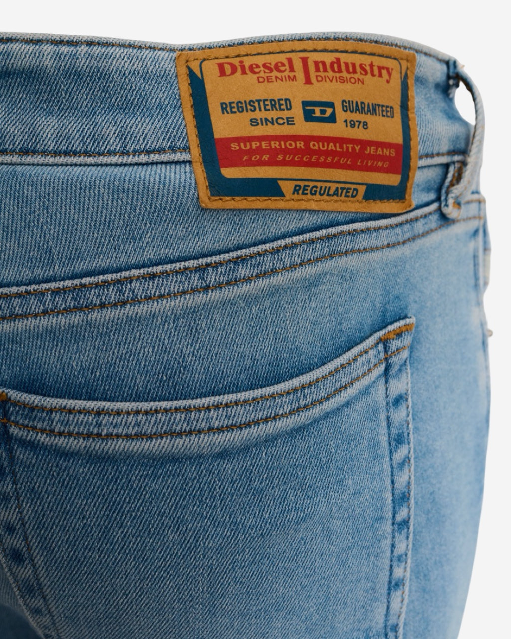 - Descripción: Jeans Diesel corte Skinny en color azul claro, bolsillos laterales y en la parte posterios, ajuste con botón y cierre, hardware en tono dorado