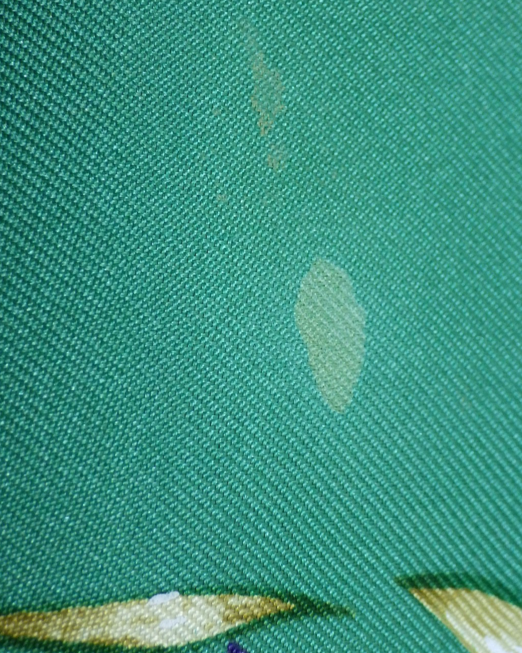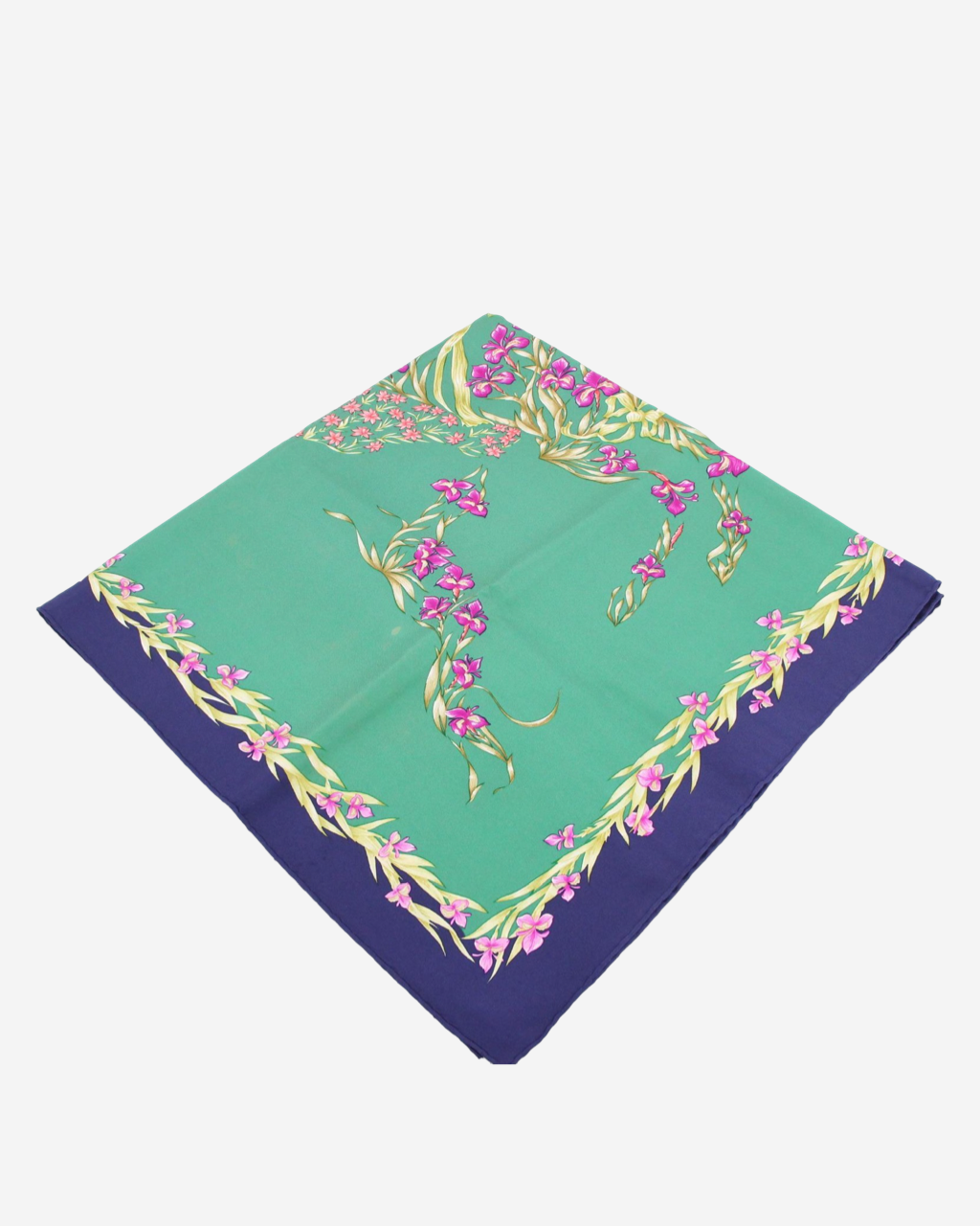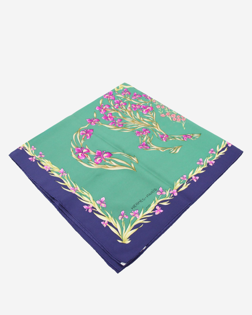 - Descripción: Mascada Hermés en seda, motivo floral en tonos verdes y rosas, contorno en color morado