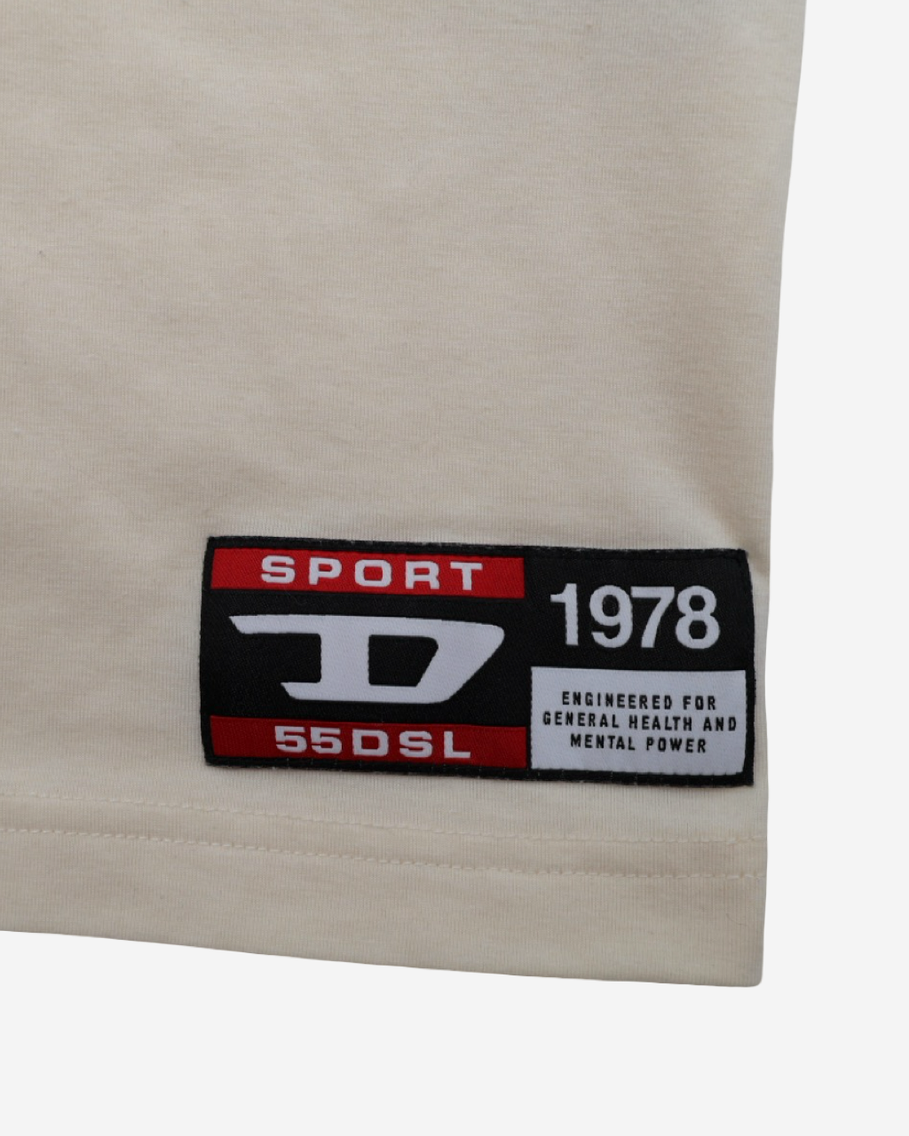 • Descripción: T-shirt color beige con páneles en negro a los hombros, corte relaxed, logo frontal, cuello redondo